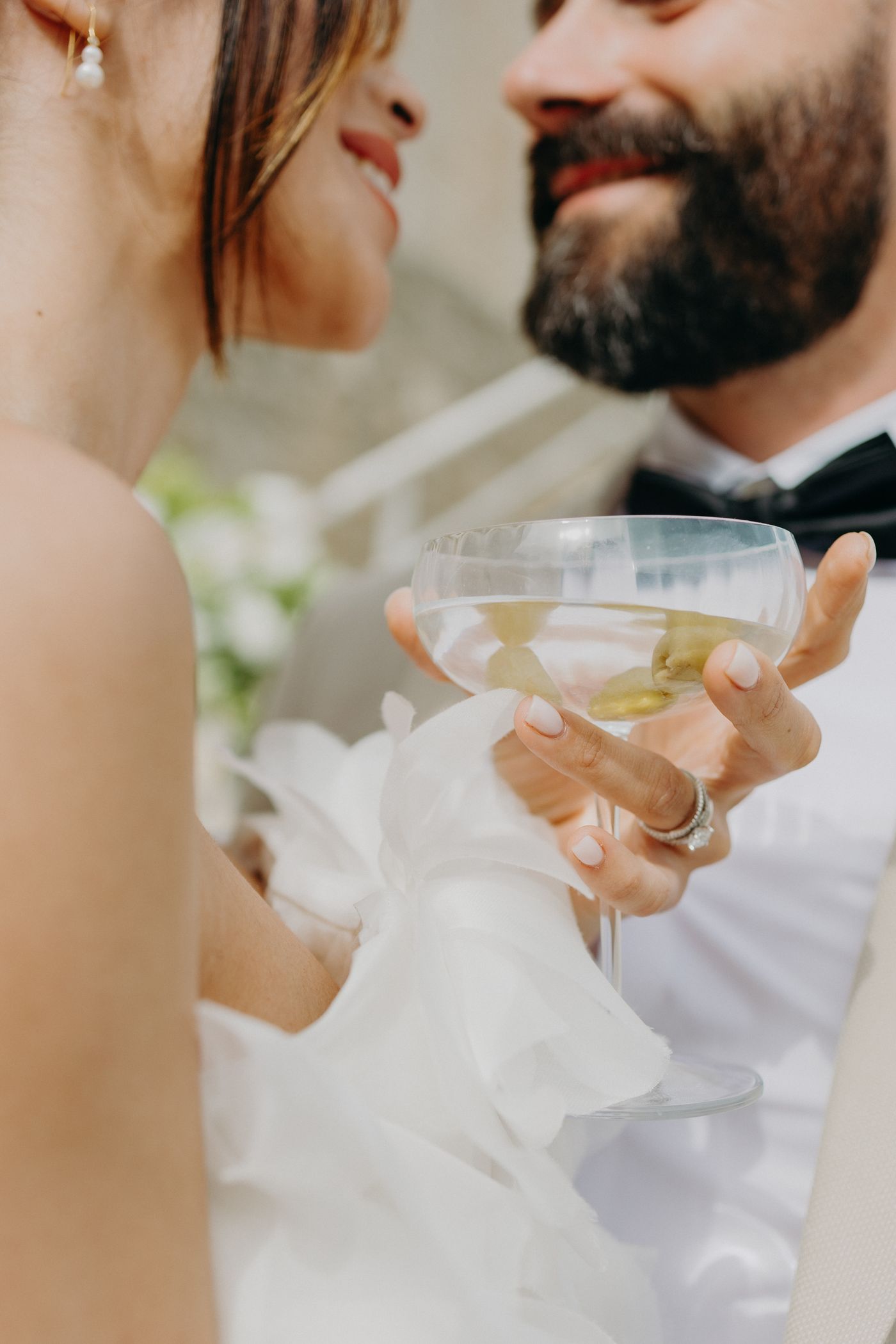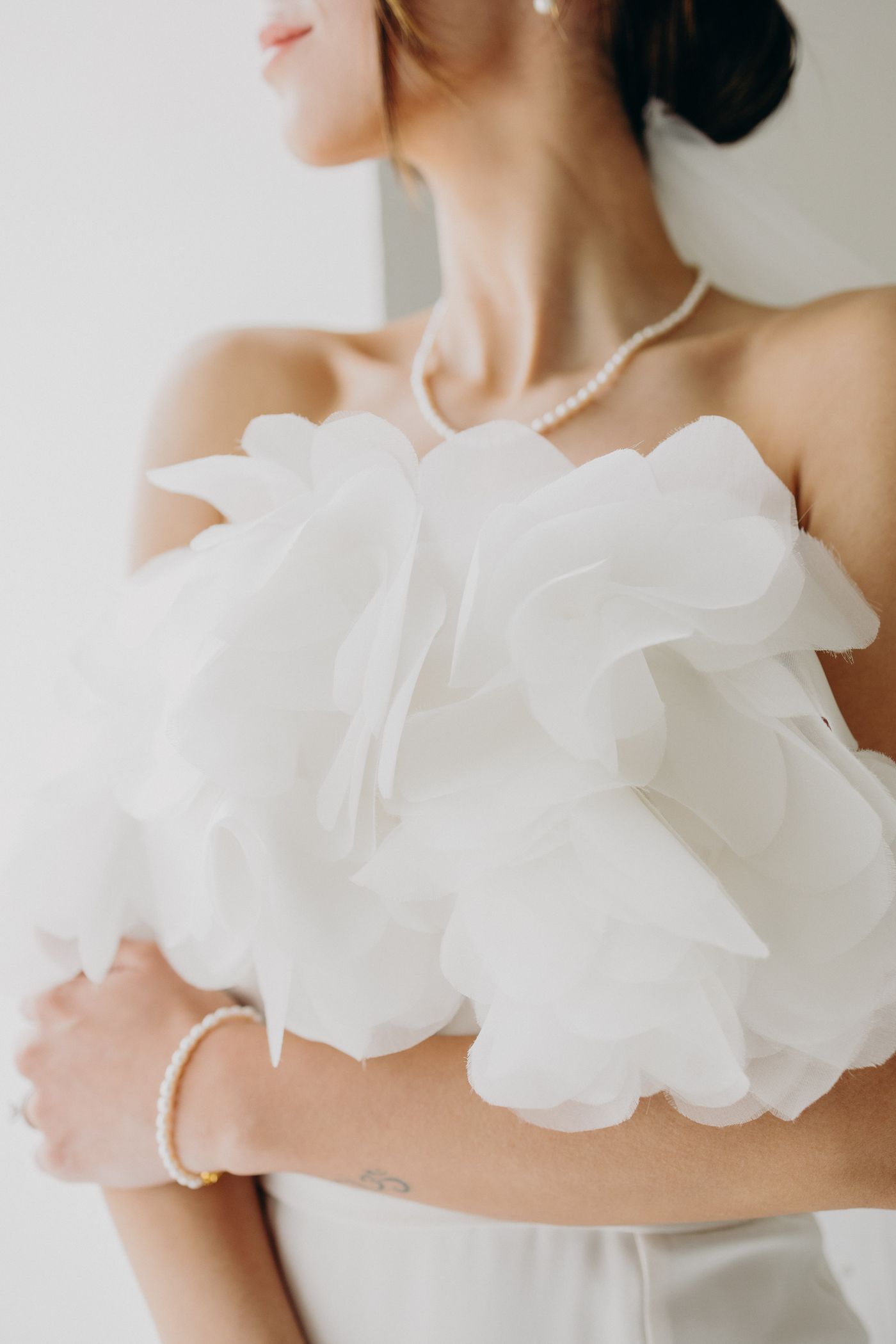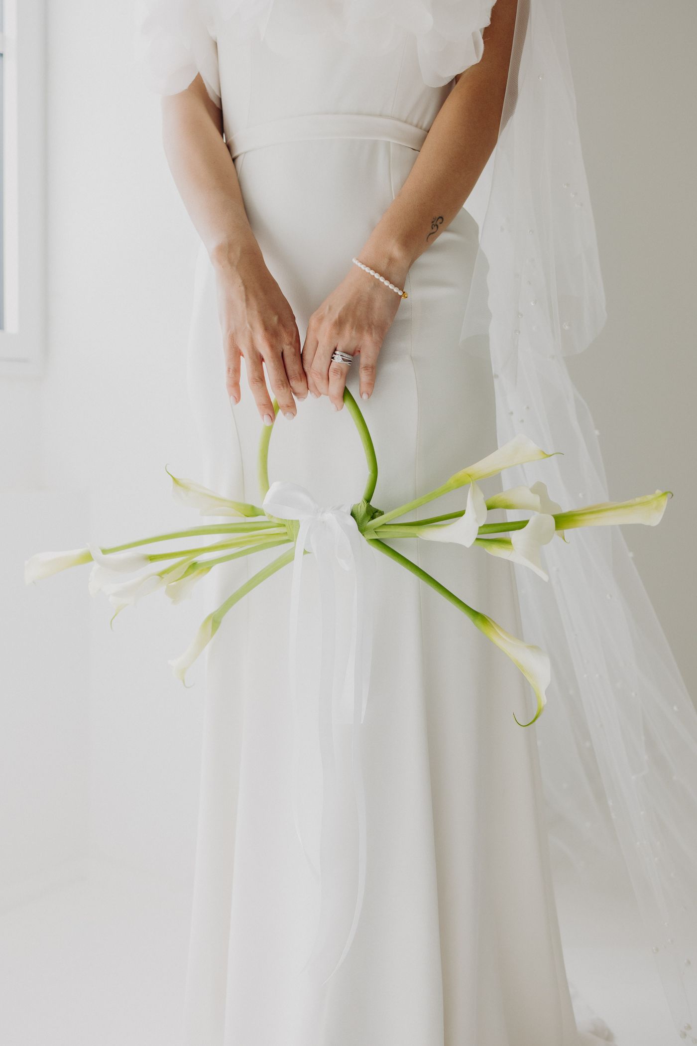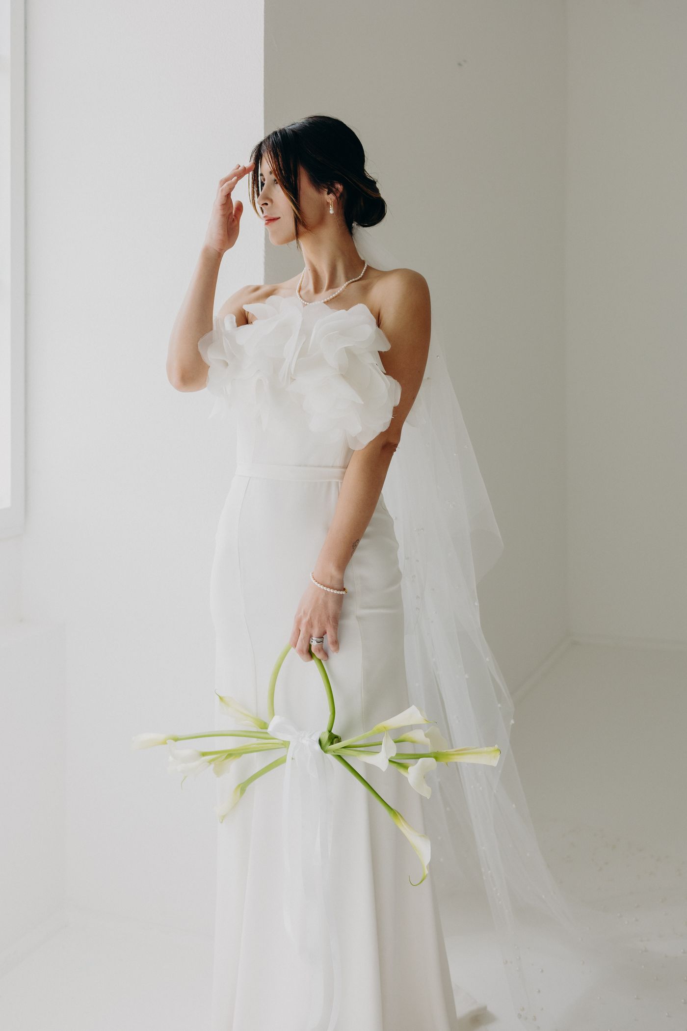 La mariée porte une robe épurée à la coupe fluide ornée de délicats volants en organza qui rappellent les pétales d’une fleur. Son voile long et vaporeux danse au vent et son bouquet minimaliste, composé de tiges de lys nouées d’un ruban blanc, incarne une vision moderne et audacieuse de l’élégance. À leurs côtés, une voiture de collection au charme rétro ancre le décor dans une atmosphère chic et légèrement cinématographique.