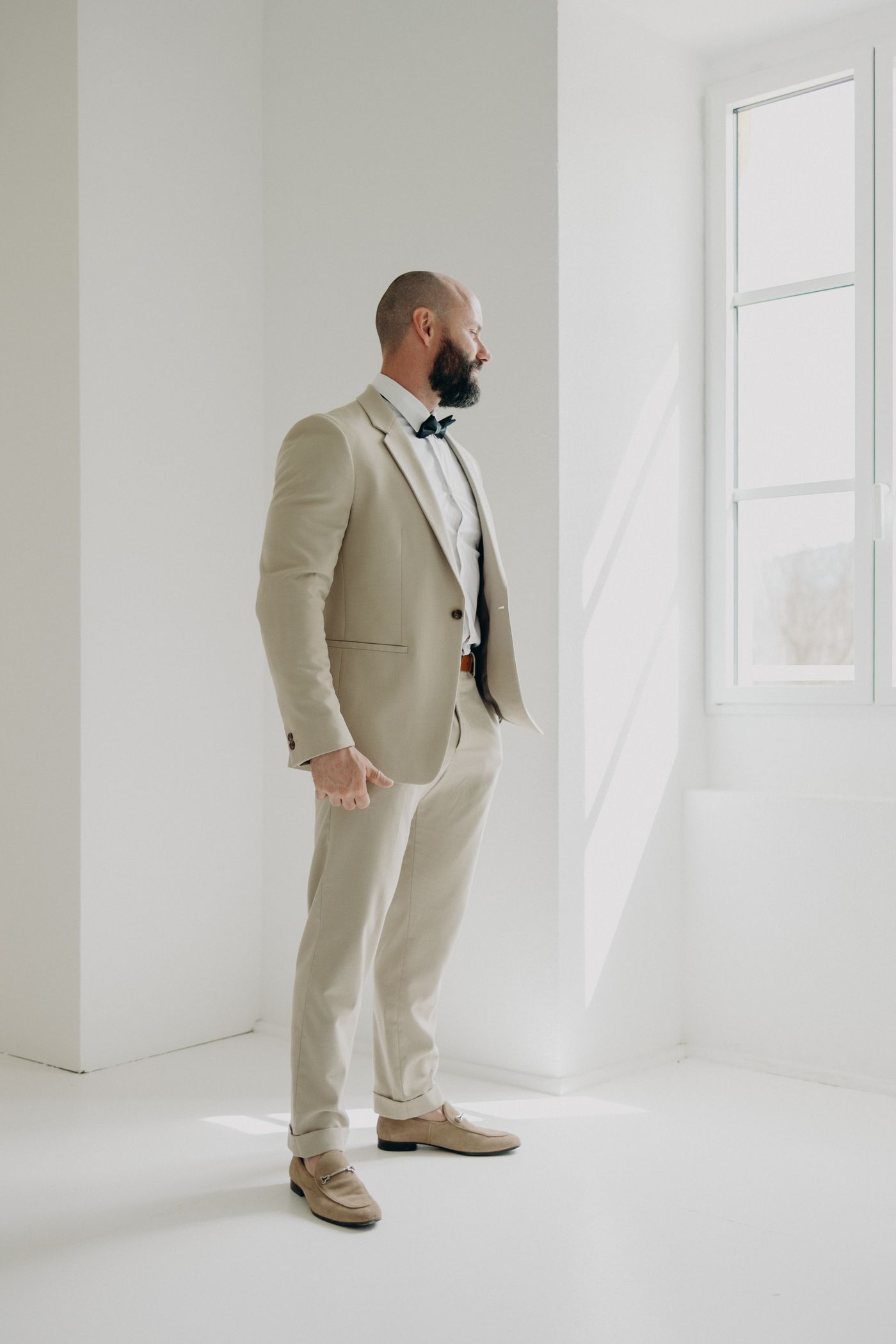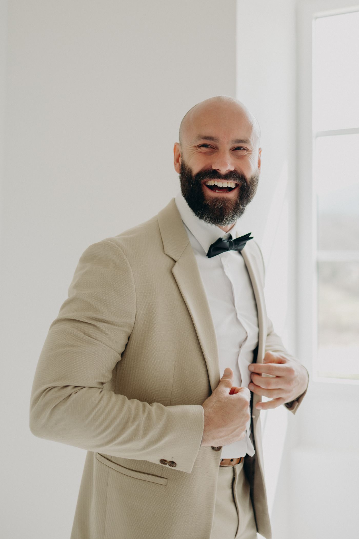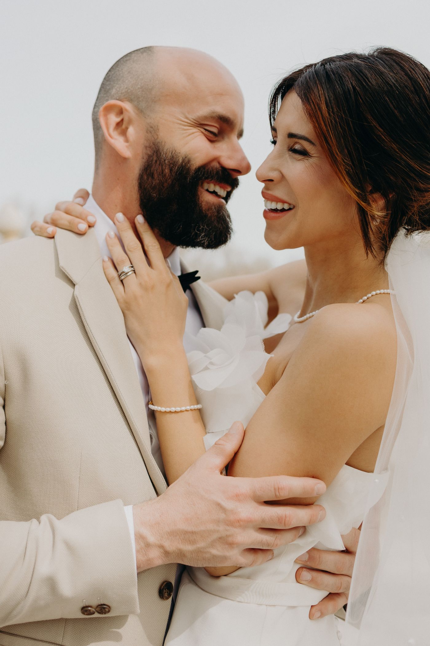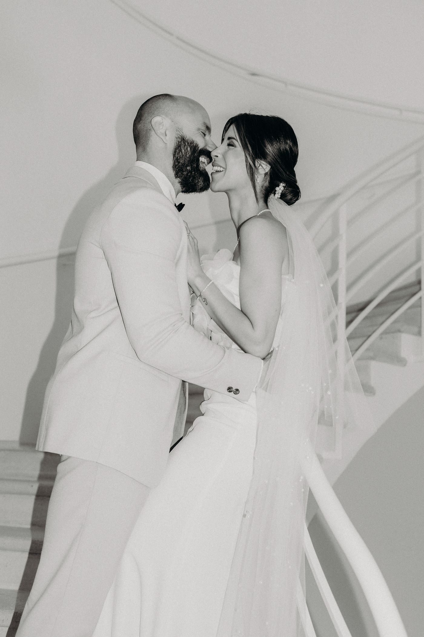 La mariée porte une robe épurée à la coupe fluide ornée de délicats volants en organza qui rappellent les pétales d’une fleur. Son voile long et vaporeux danse au vent et son bouquet minimaliste, composé de tiges de lys nouées d’un ruban blanc, incarne une vision moderne et audacieuse de l’élégance. À leurs côtés, une voiture de collection au charme rétro ancre le décor dans une atmosphère chic et légèrement cinématographique.