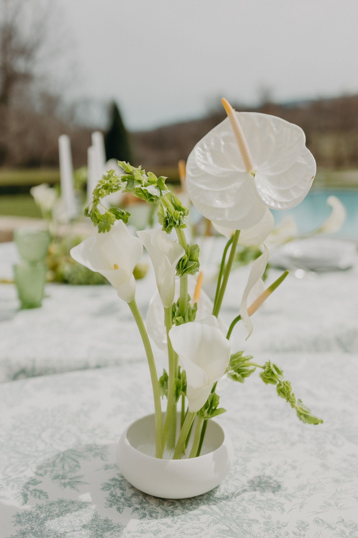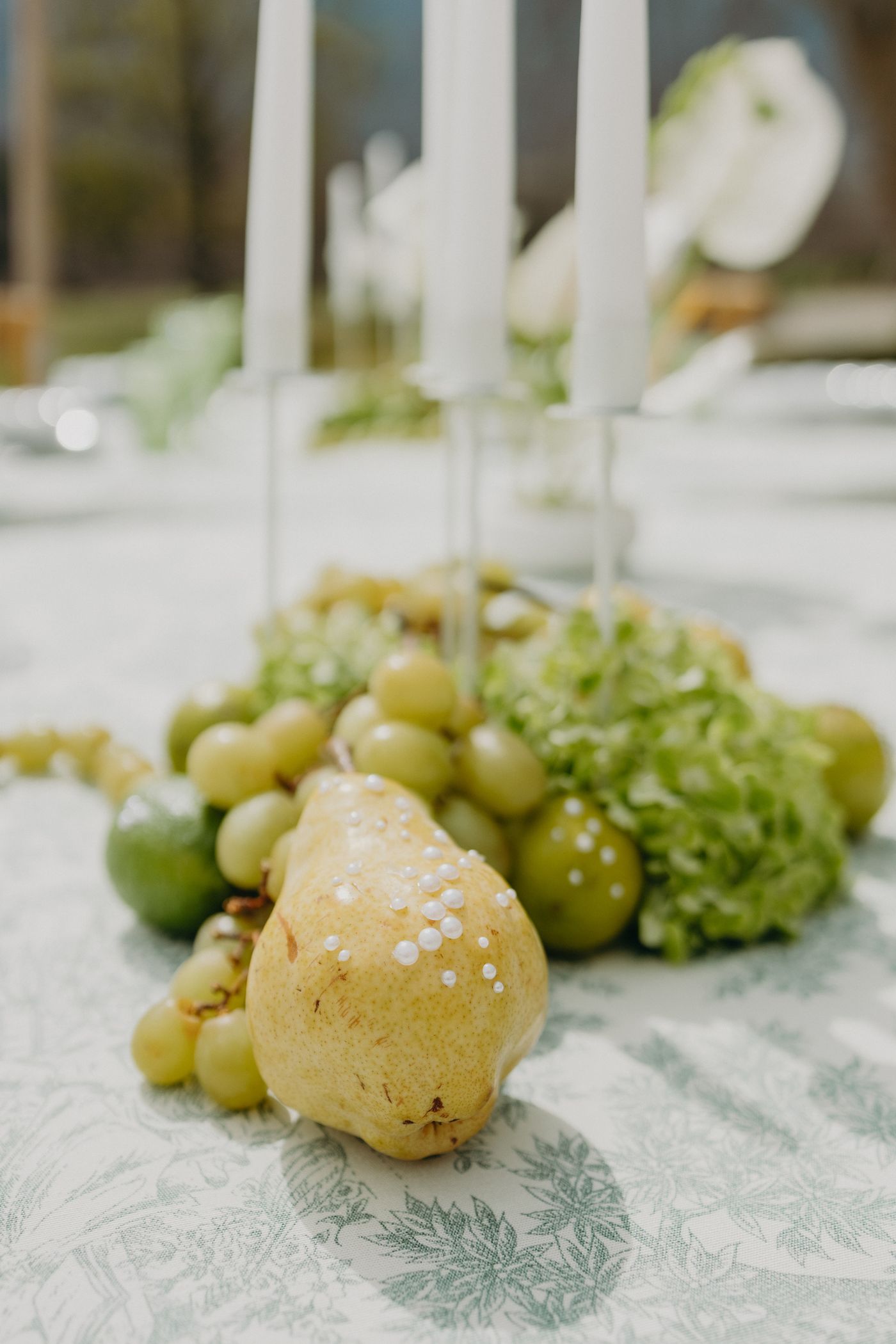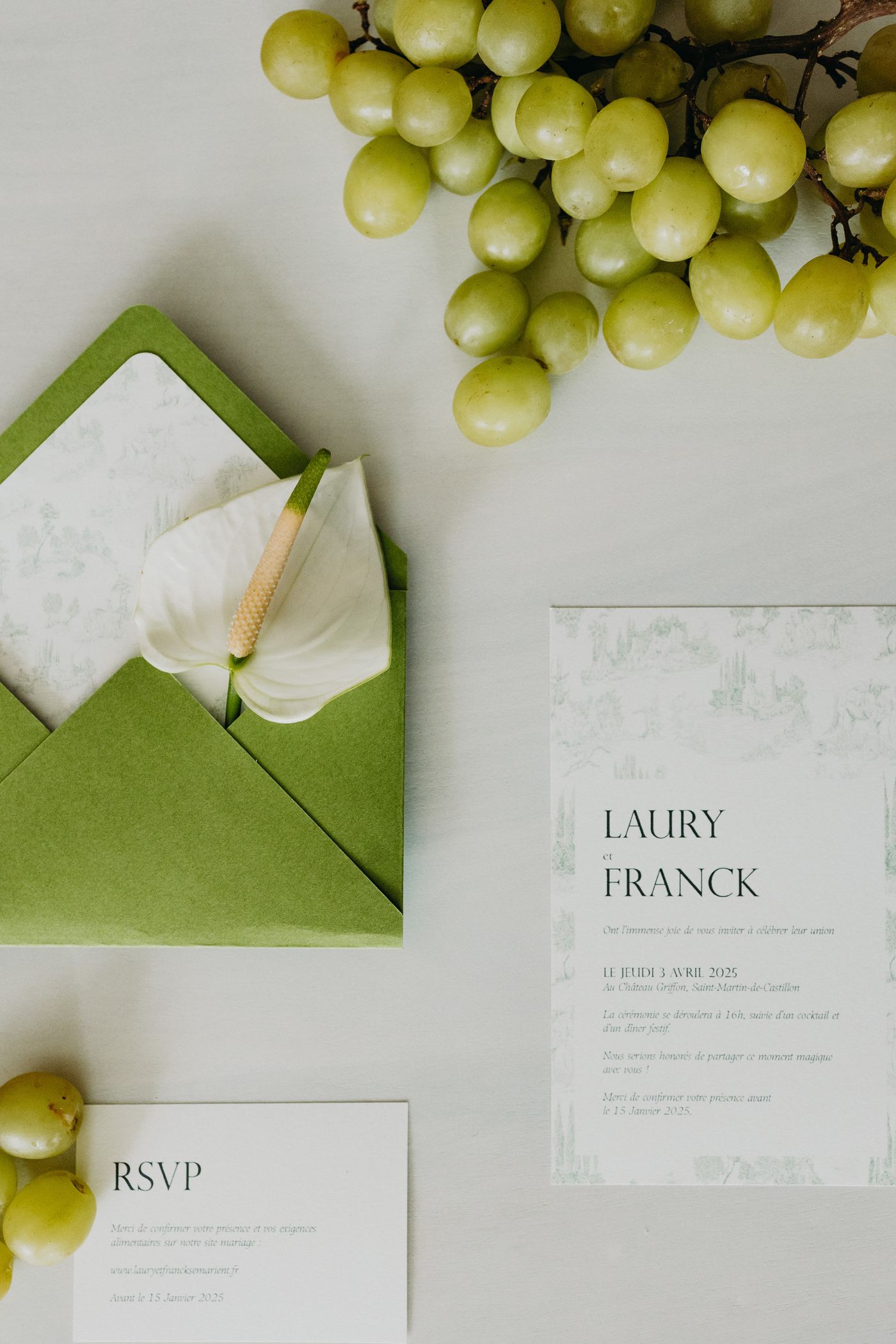 “Ce shooting d’inspiration mariage s’inscrit dans une élégance monochrome où le vert aux tons matcha et olive sont à l’honneur. L’ambiance se veut raffinée, mêlant nature et sophistication avec des touches vintage discrètes mais assumées. Les compositions florales et la décoration de table s’articulent autour de raisins, de poires et de citrons verts, apportant fraîcheur et gourmandise à l’ensemble. Une nappe délicatement fleurie évoque un jardin ancien et romantique, tandis que la papeterie, pensée en accord parfait, prolonge cette harmonie végétale.