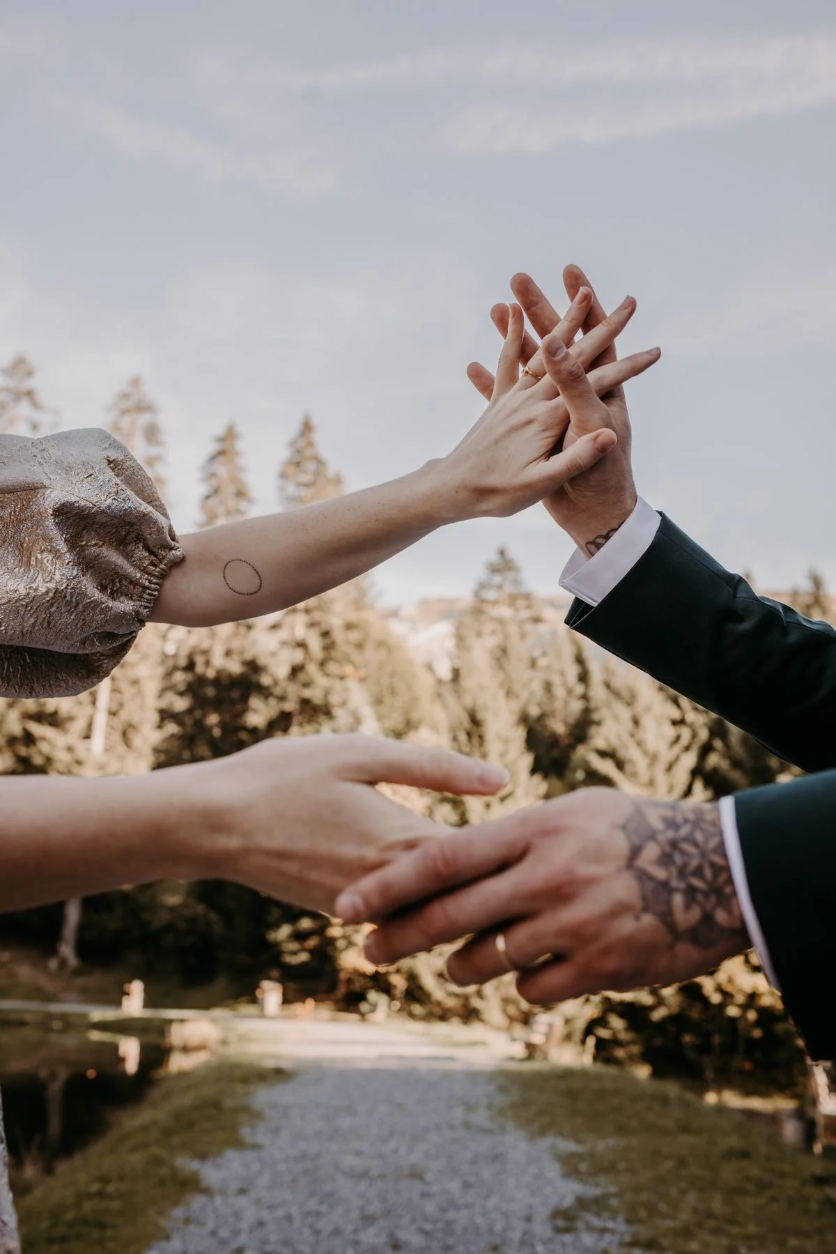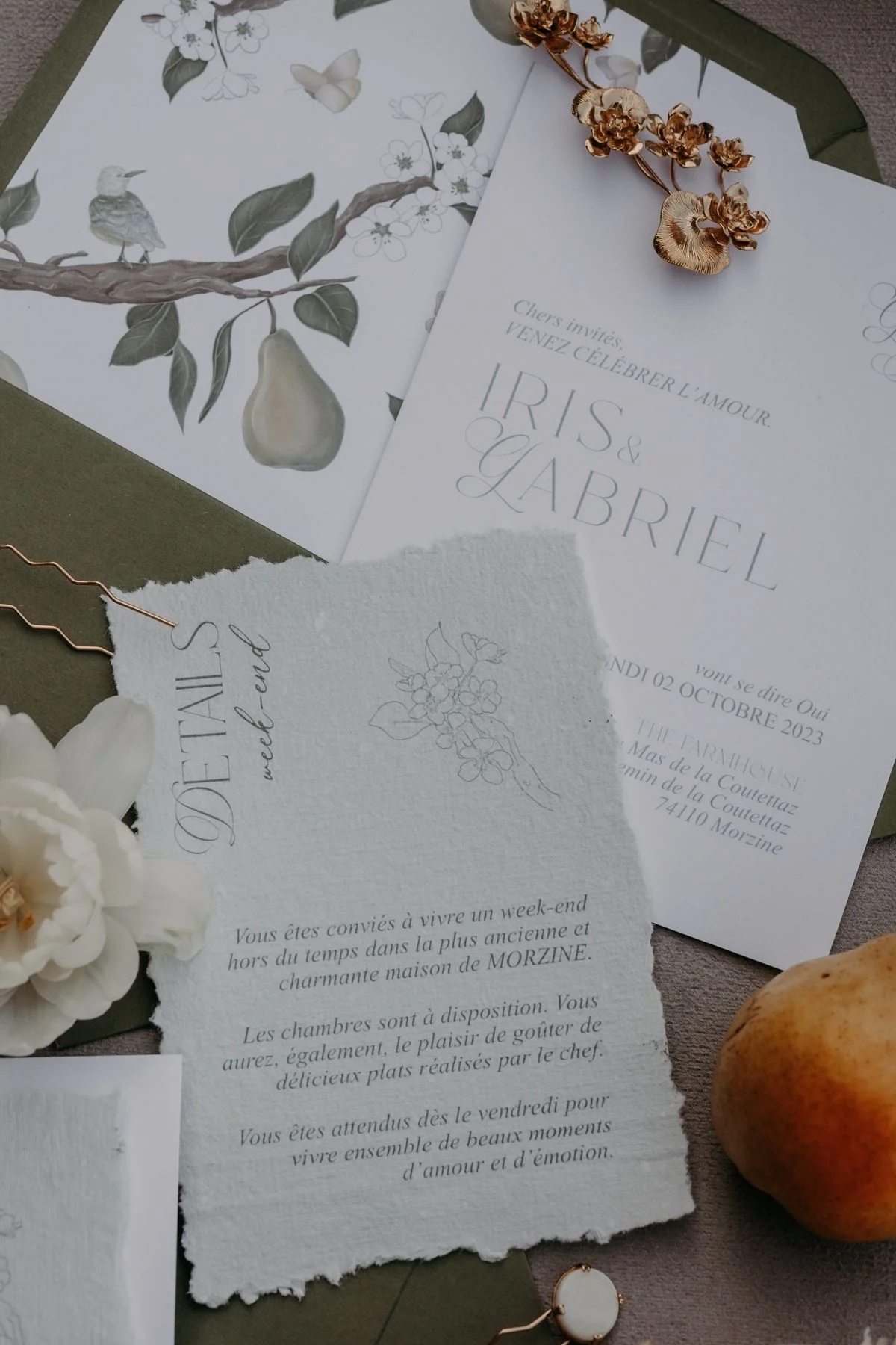 Chaque élément a été pensé pour rester dans une démarche poétique et éco-responsable. Les prestataires étaient tous des artisans créateurs de la région, comme Lucile de Haykou, créatrice d’accessoires en teinture végétale, avec ses délicats rubans pour la papeterie, le bouquet de la mariée, et le kimono lors de ses préparatifs. Nous retrouvons également les alliances éthiques de Paulette à Bicyclette aux doigts entrelacés de nos mariés. Le wedding cake a été réalisé par l’Atelier de Ju et Mat, pâtissière sur Morzine.”