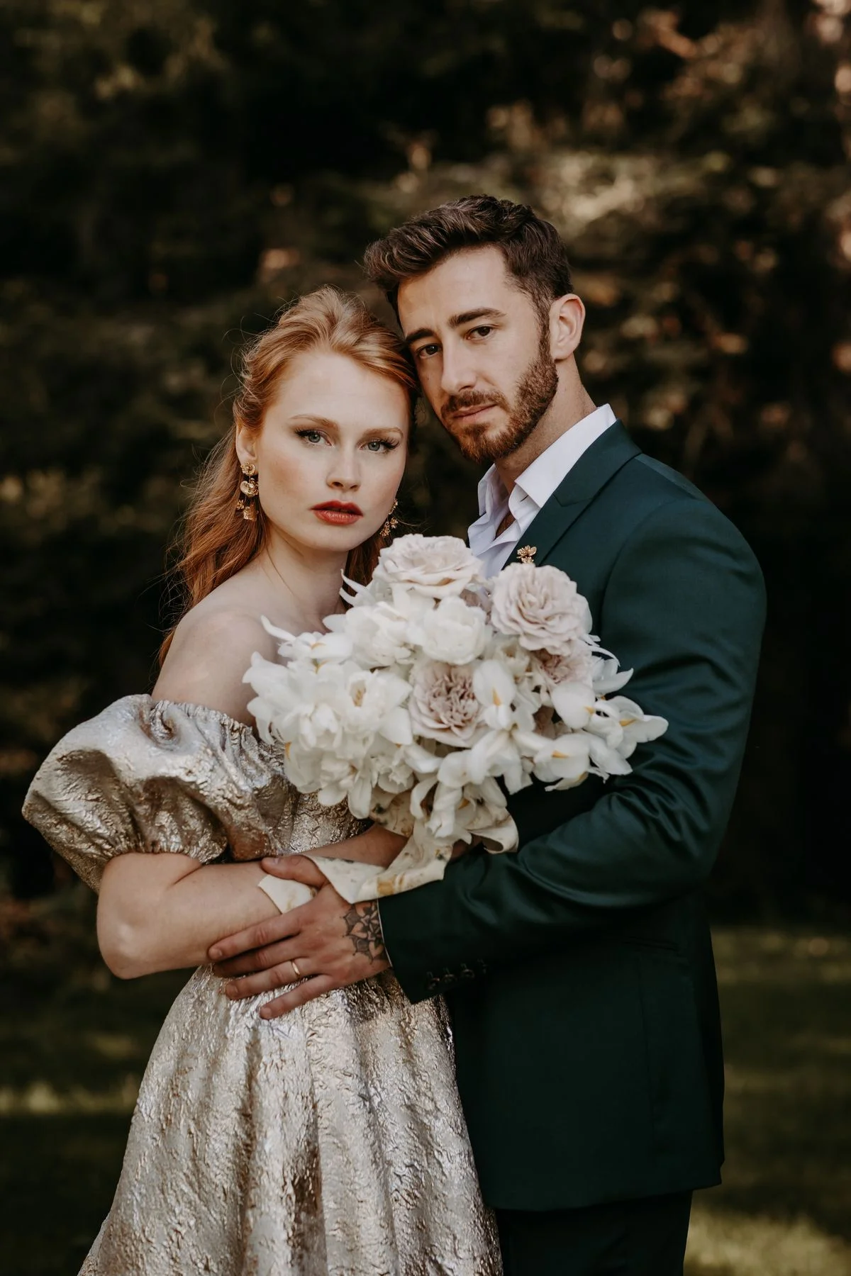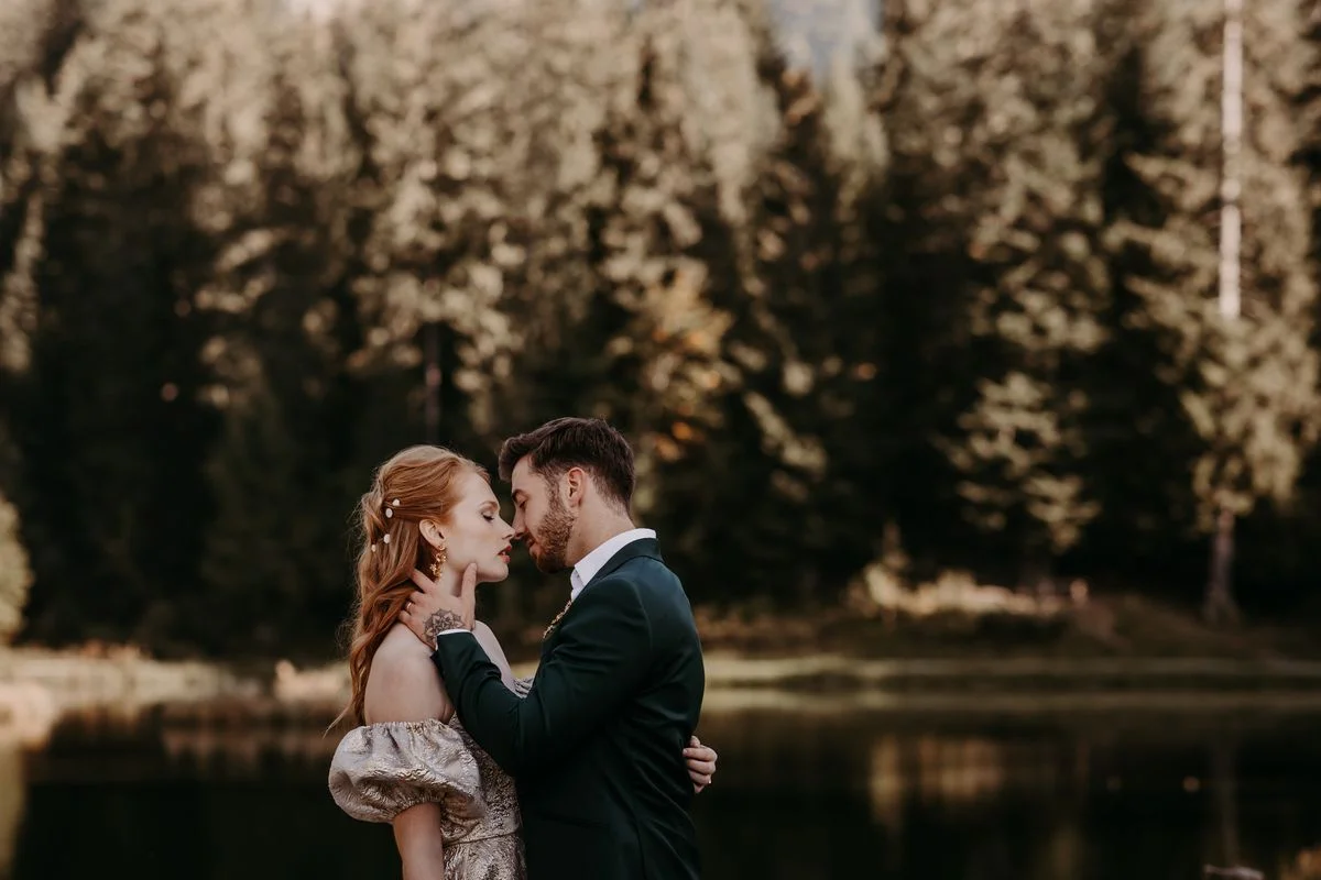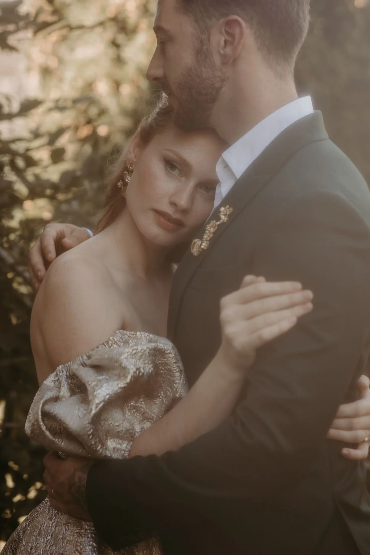 Pour les tenues et la mise en beauté, nous souhaitions insister sur le côté couture, tendance et naturel. La robe Olténie de Maison Maélie était parfaite pour notre modèle Maroussia, mettant en valeur sa chevelure flamboyante et rappelant la brillance des lacs de la région. Charlène de Beige Hair l‘a magnifiée avec une mise en beauté lumineuse et une coiffure moderne accessoirisée par les créations de La Chambre Blanche. Alex, notre égérie de la région Rhône-Alpes en 2022, portait un costume Blandin & Delloye dont la teinte rappelait la couleur des sapins. Il a été orné d‘une boutonnière, bijoux de La Chambre Blanche, assortie aux accessoires de Maroussia.