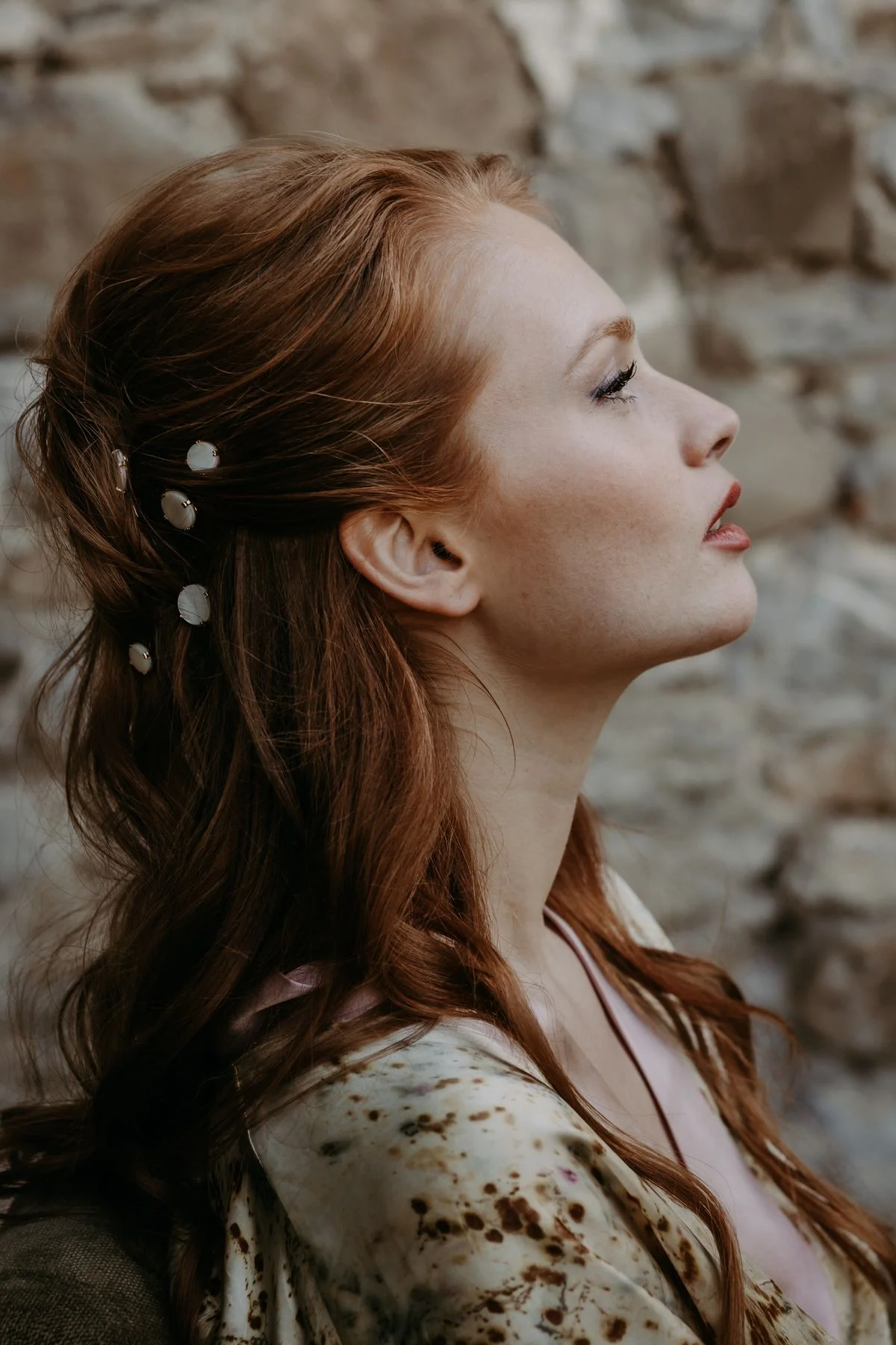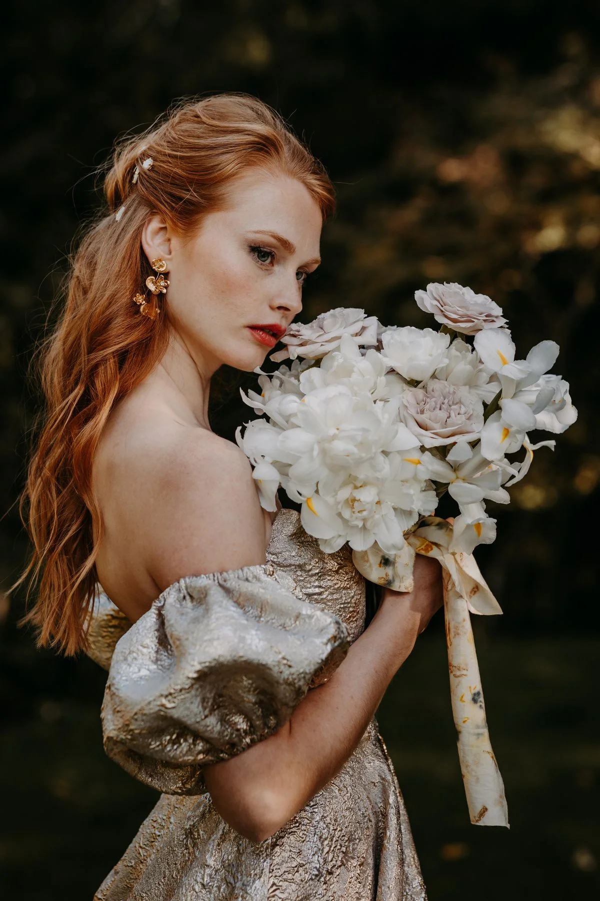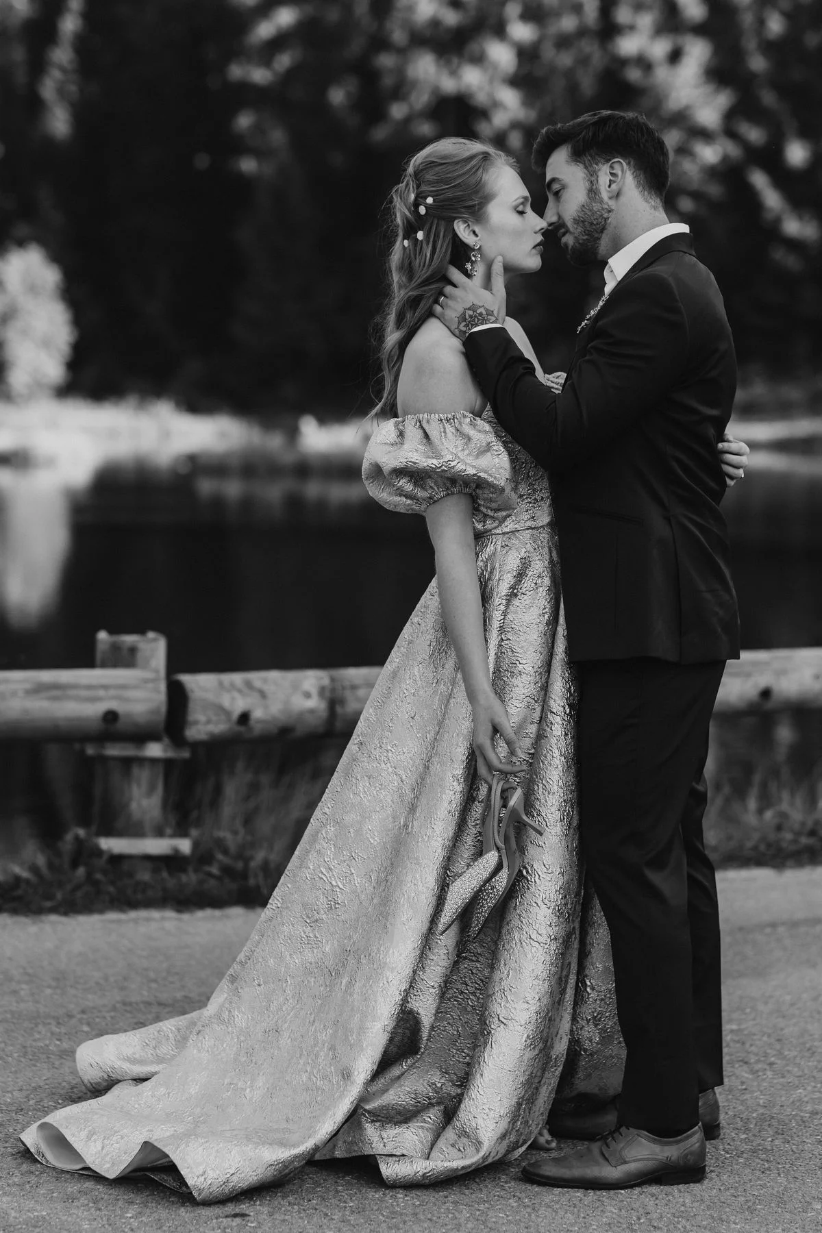 Pour les tenues et la mise en beauté, nous souhaitions insister sur le côté couture, tendance et naturel. La robe Olténie de Maison Maélie était parfaite pour notre modèle Maroussia, mettant en valeur sa chevelure flamboyante et rappelant la brillance des lacs de la région. Charlène de Beige Hair l‘a magnifiée avec une mise en beauté lumineuse et une coiffure moderne accessoirisée par les créations de La Chambre Blanche. Alex, notre égérie de la région Rhône-Alpes en 2022, portait un costume Blandin & Delloye dont la teinte rappelait la couleur des sapins. Il a été orné d‘une boutonnière, bijoux de La Chambre Blanche, assortie aux accessoires de Maroussia.