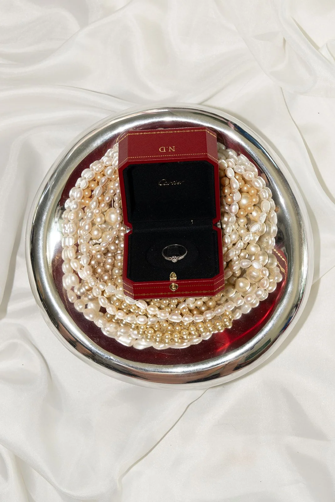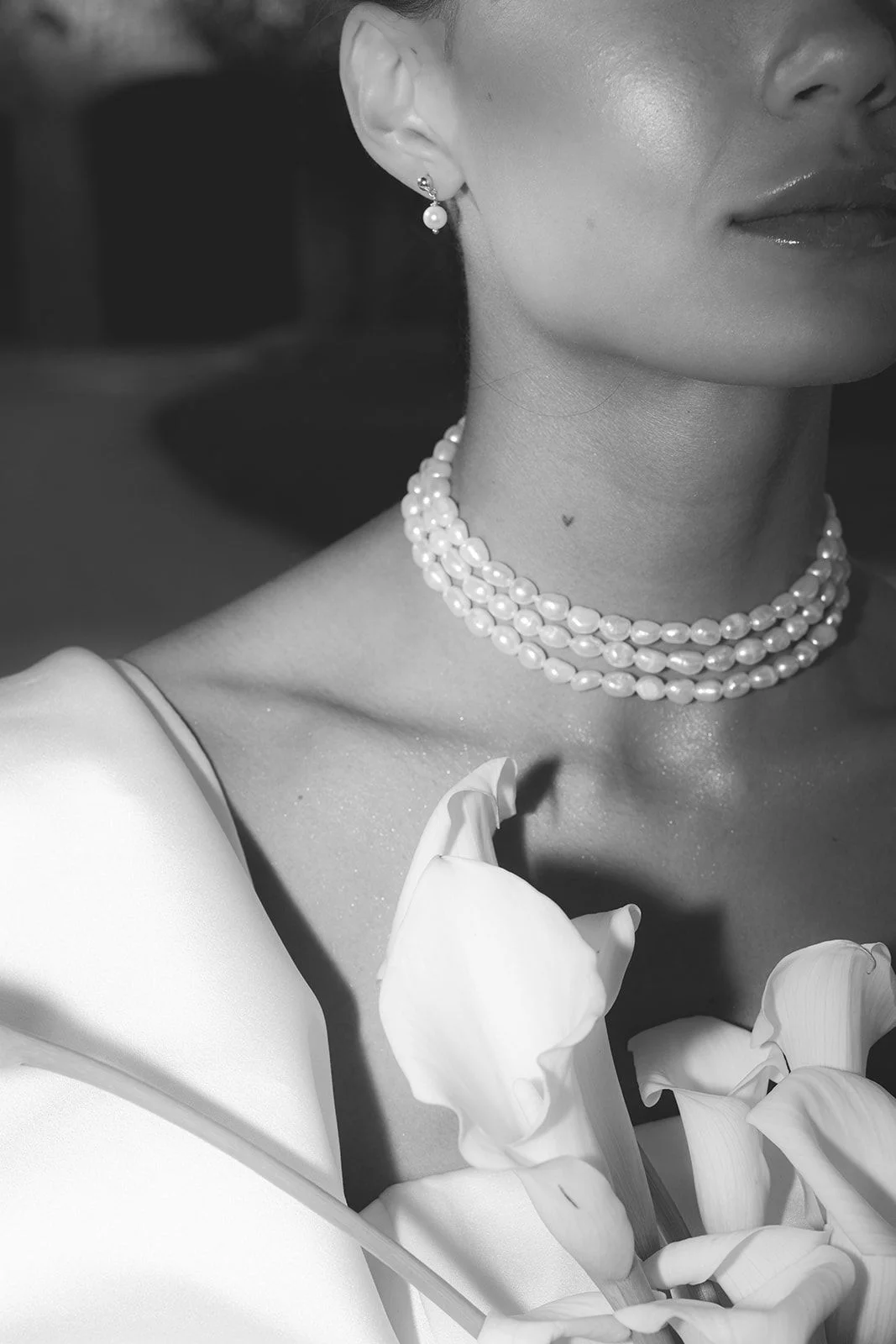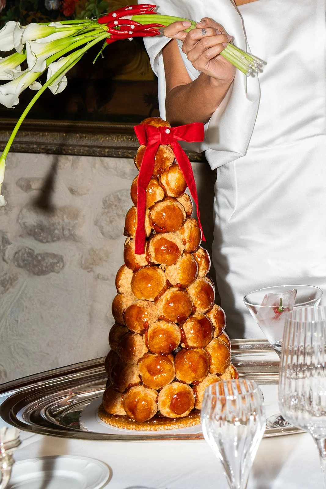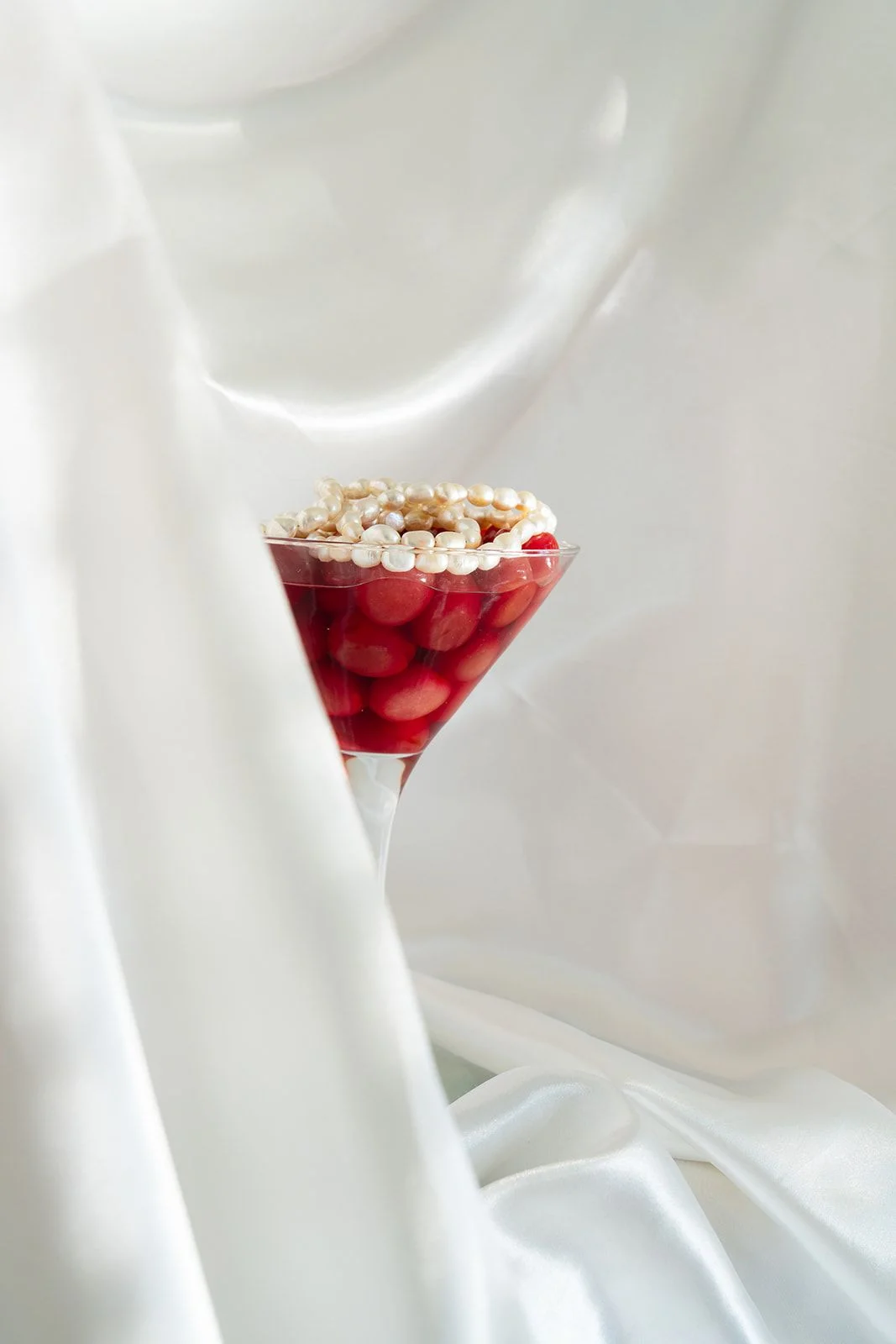 En discutant un soir, on s’est souvenu de notre pied de piment qui poussait sur la terrasse. On trouvait la couleur incroyable, la texture aussi; ce rouge vif, un peu brut, organique, asymétrique. On s’est dit que ce serait une belle idée de point de départ, à la fois symbolique et inattendue. Ça racontait la chaleur, la passion, l’intensité… sans avoir besoin d’en faire trop. Et que cet élément se mariait extrêmement bien avec le côté doux des bijoux perlés et de la robe satinée.