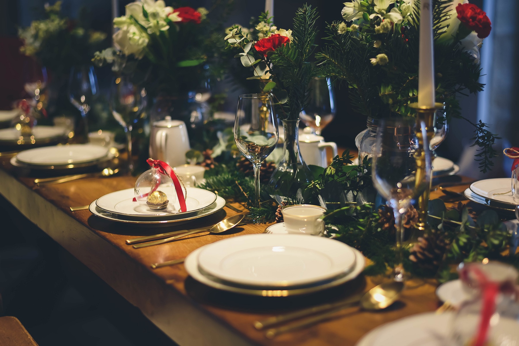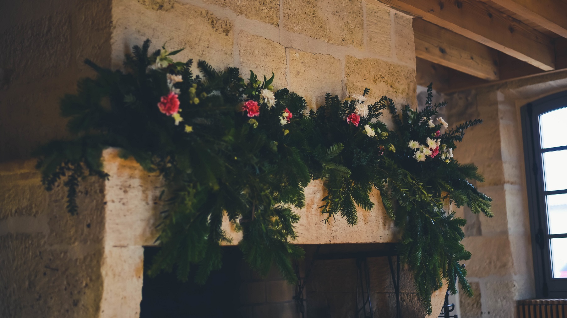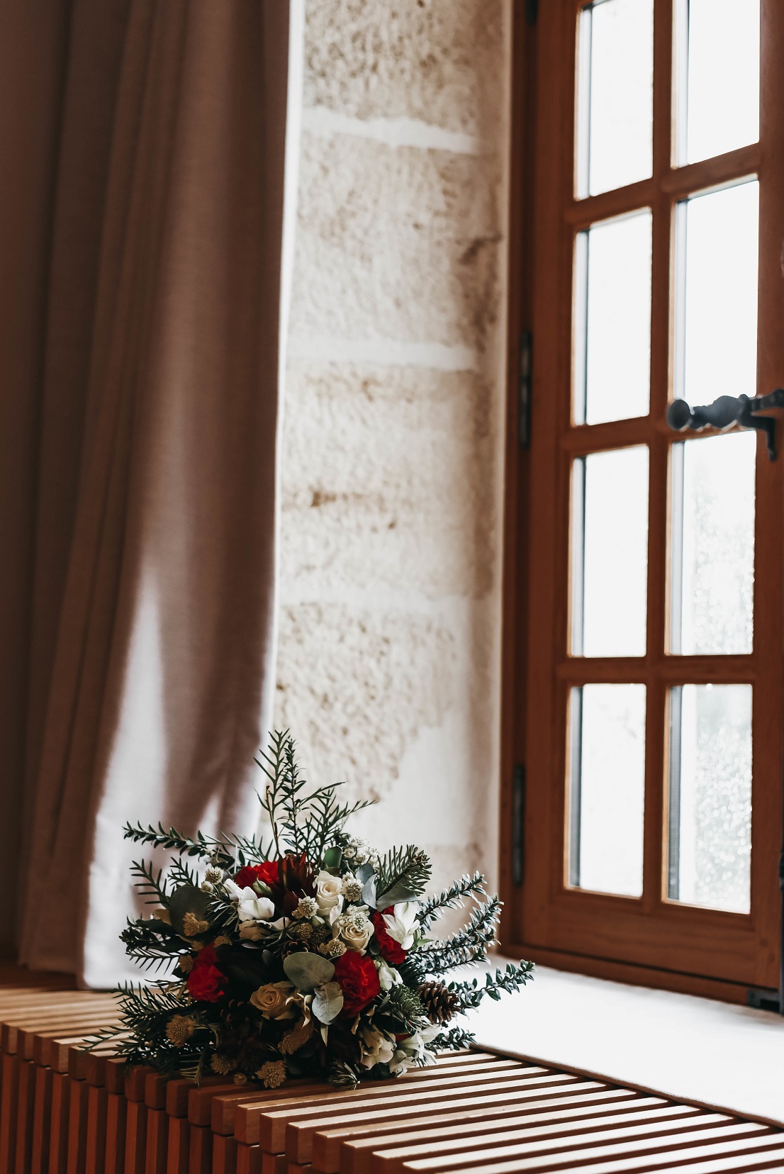 J’ai installé des plaids à poils longs sur les bancs faisant écho à la cheminée présente dans la pièce et deux plaids rouges bordeaux pour les chaises des mariés afin de créer une réelle ambiance cocooning. Une vaisselle sobre et élégante avec un liserée doré rappelant les chandeliers présent sur la table. Pour les fleurs, nous sommes restés dans le même esprit, des fleurs de saison uniquement avec des petites touches de rouge pour ramener un peu de chaleur.