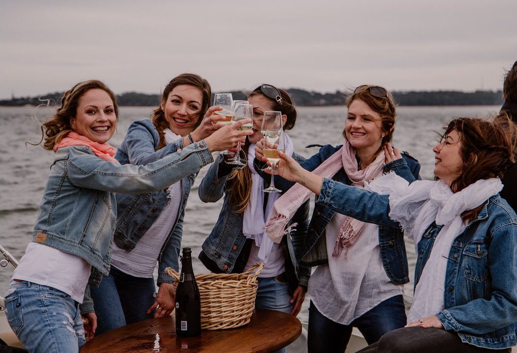 « Coté prestataires, je me suis entourée de personnes avec qui j’ai l’habitude de travailler sur des mariages. L’idée était aussi de proposer aux teams une mise en beauté de la future mariée, le petit instant girly que certaines recherchent lors d’un week-end EVFJ ! Comme nous sommes sur le Bassin d’Arcachon, une sortie en bateau me semblait évidente ! Flâner sur l’eau entre filles, avec une bouteille de champagne face à la Dune du Pilat… Je crois qu’il y a pire comme EVJF ! »