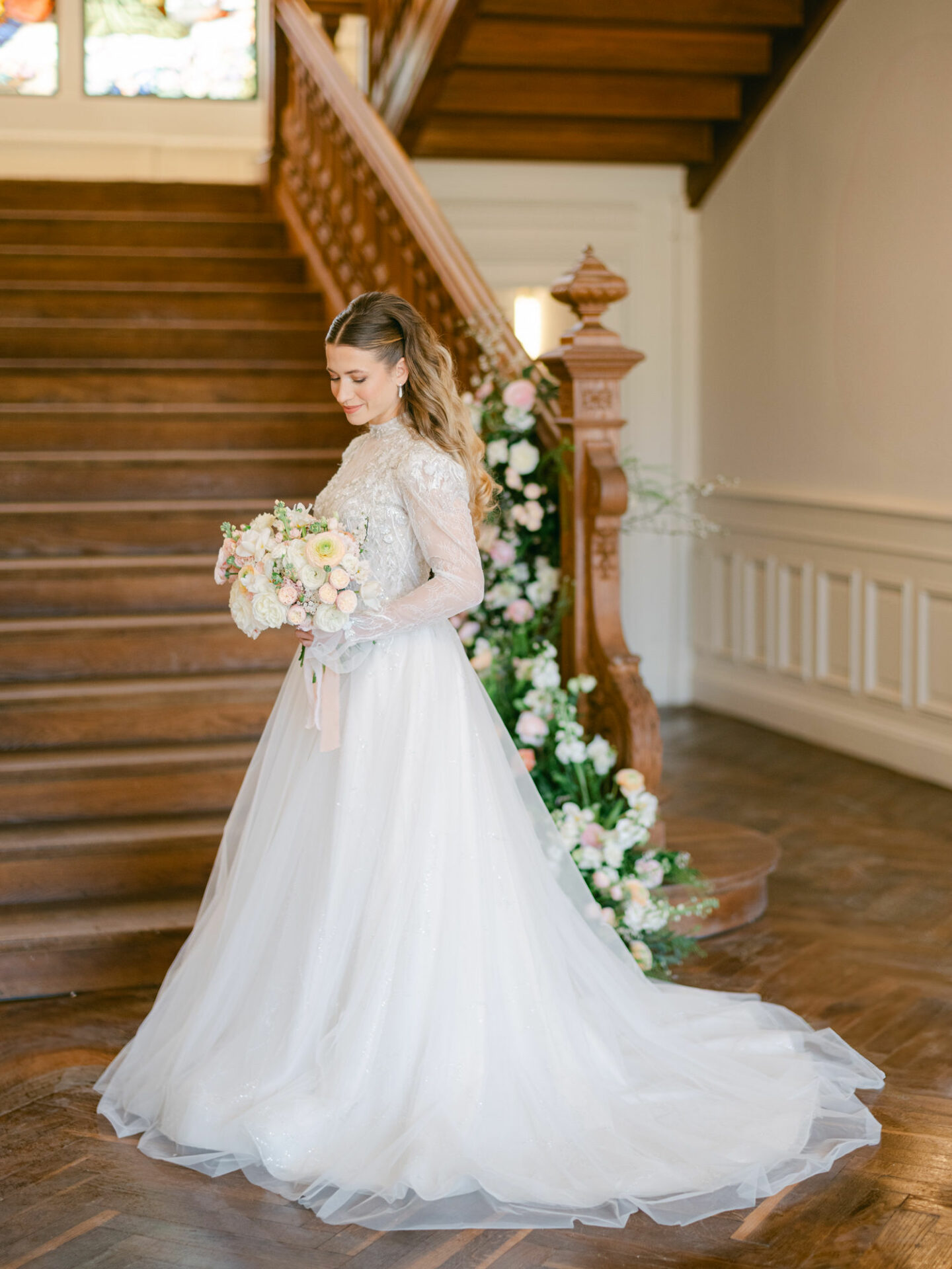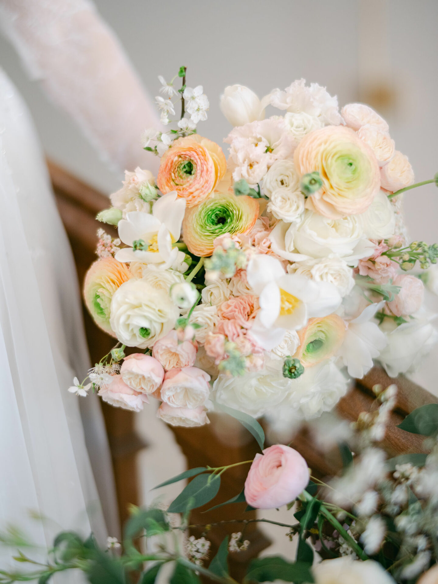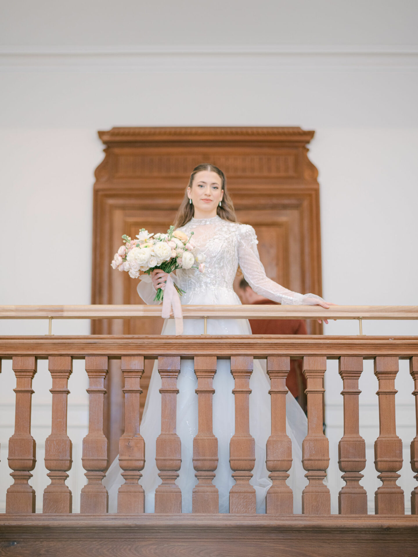 Dès l’entrée, un escalier majestueux, sublimé par une cascade de fleurs fraîches, menait les regards vers un vitrail spectaculaire, véritable trésor du château, captant la lumière et offrant une toile de fond magique à notre mariée. Celle-ci évoluait avec grâce dans une somptueuse robe signée Robe Élysée, une création fluide, féminine et délicate, en parfaite harmonie avec l’esprit du lieu. Son bouquet, frais et léger, associait des fleurs de saison dans des tons tendres, capturant l’essence du printemps.