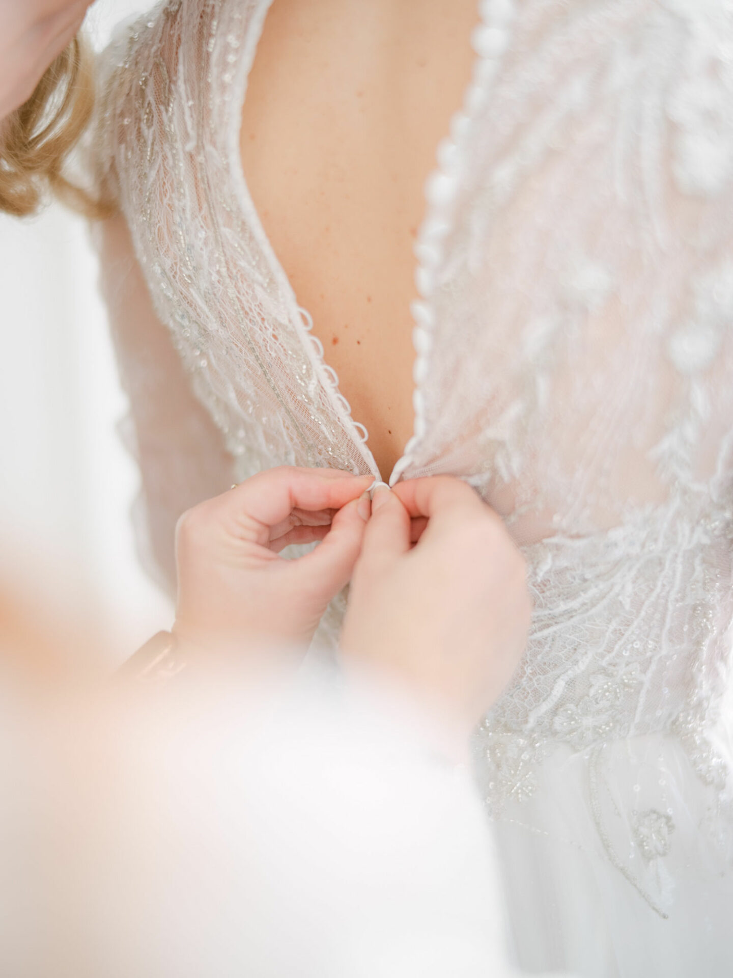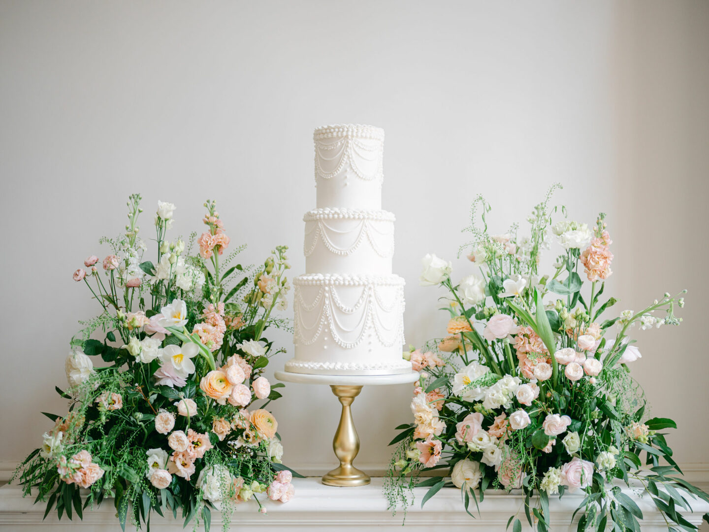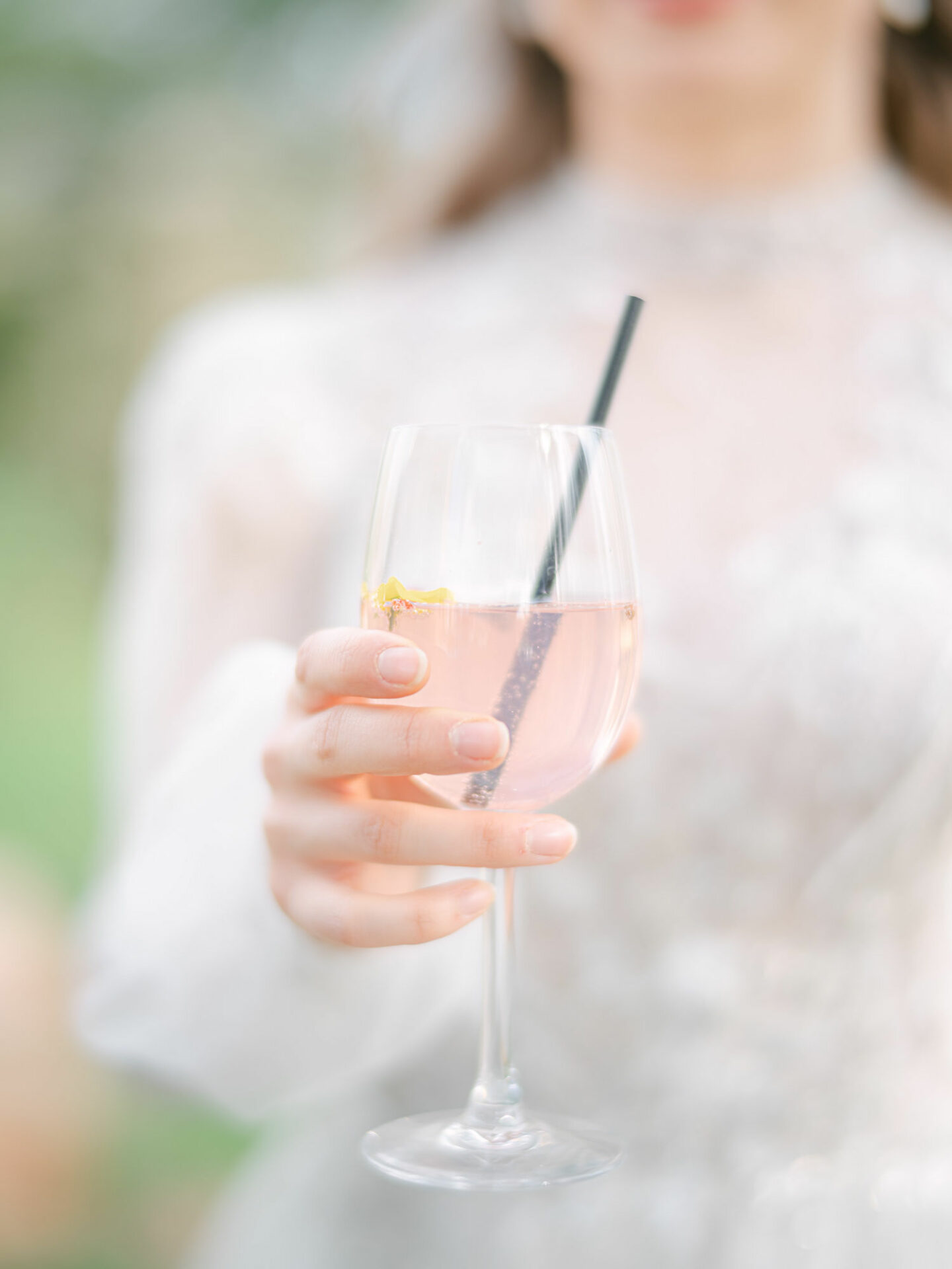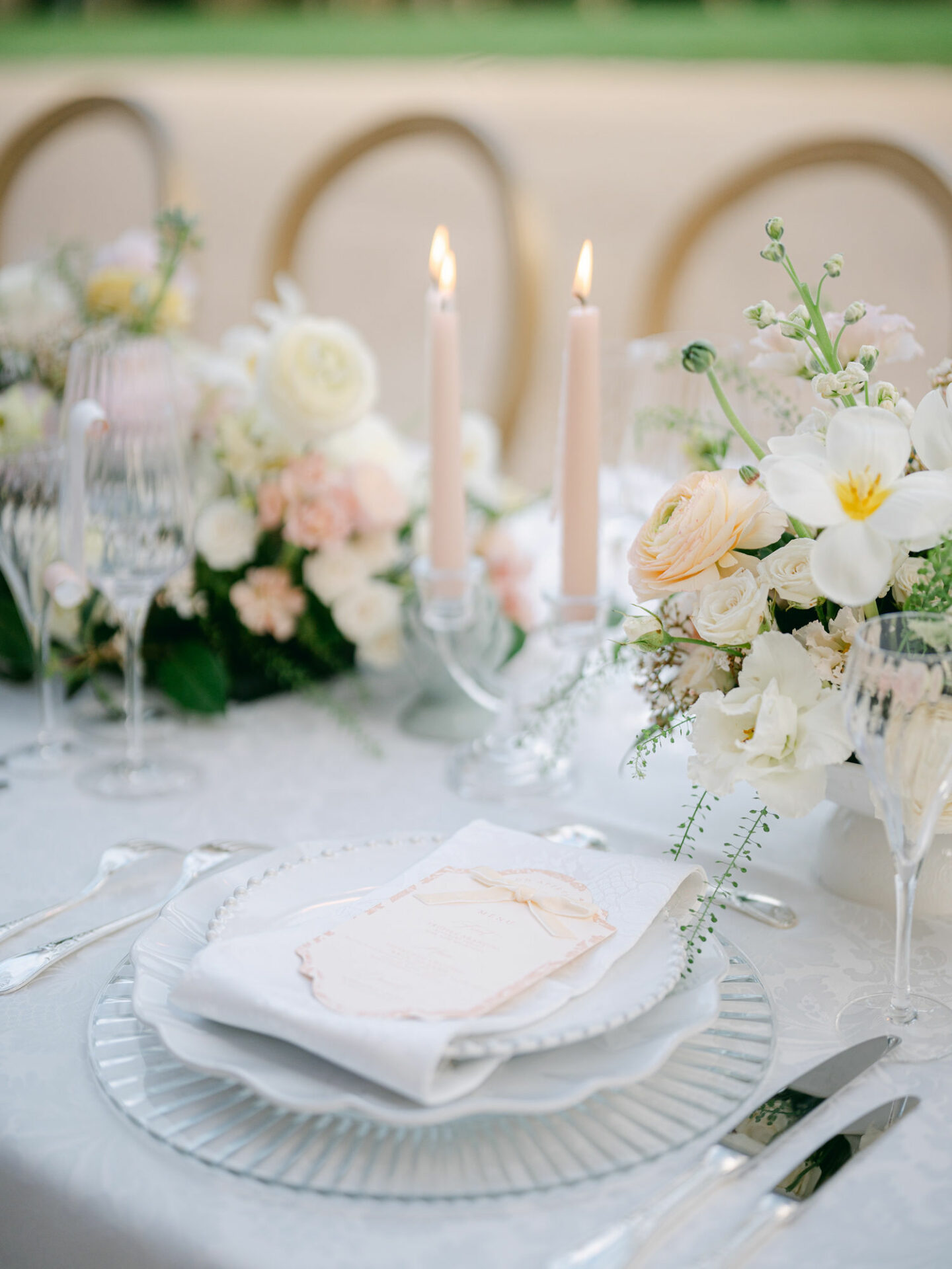 À l’extérieur, nous avons dressé une table élégante devant la magnifique façade du château. La vaisselle raffinée, choisie avec soin, dialoguait avec une papeterie délicate aux finitions précieuses, tandis que les compositions florales ponctuaient la table d’éclats de couleurs douces. Le gâteau de mariage, véritable œuvre d’art, reprenait les codes du shooting : légèreté, romantisme et raffinement, pour une touche finale aussi gourmande que poétique.