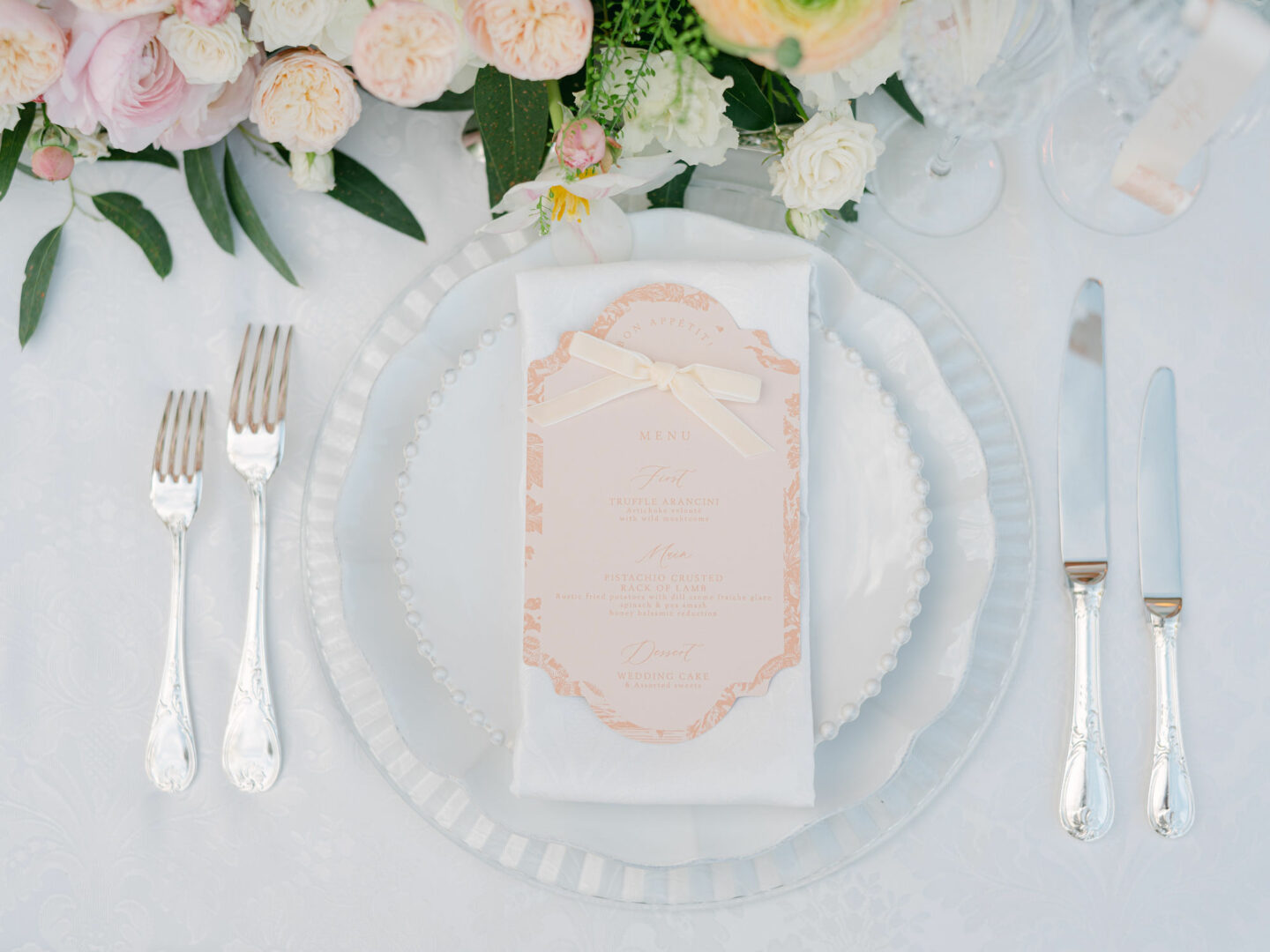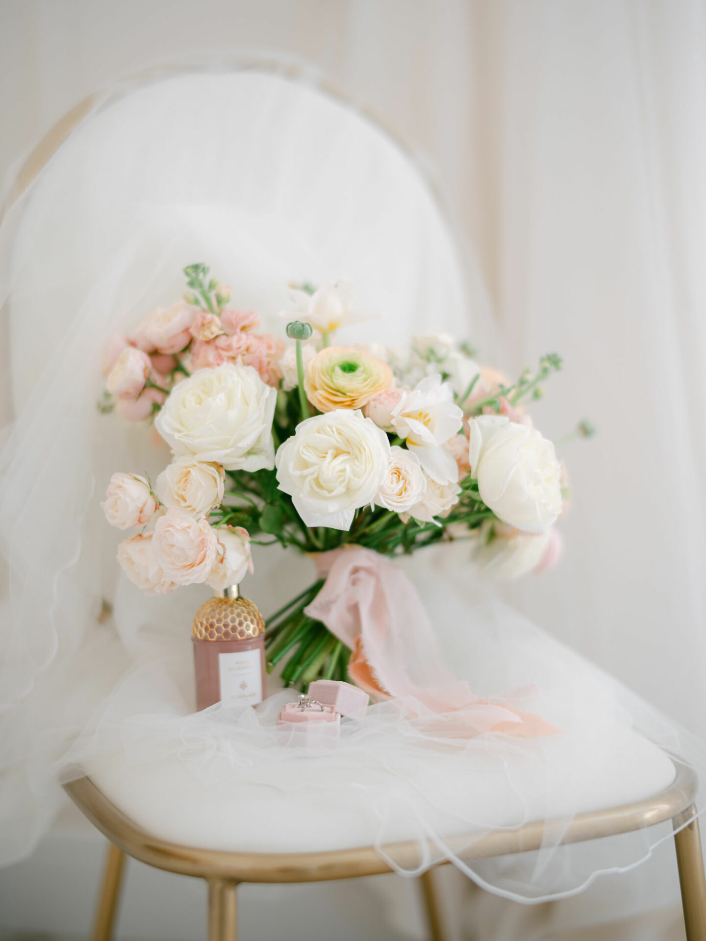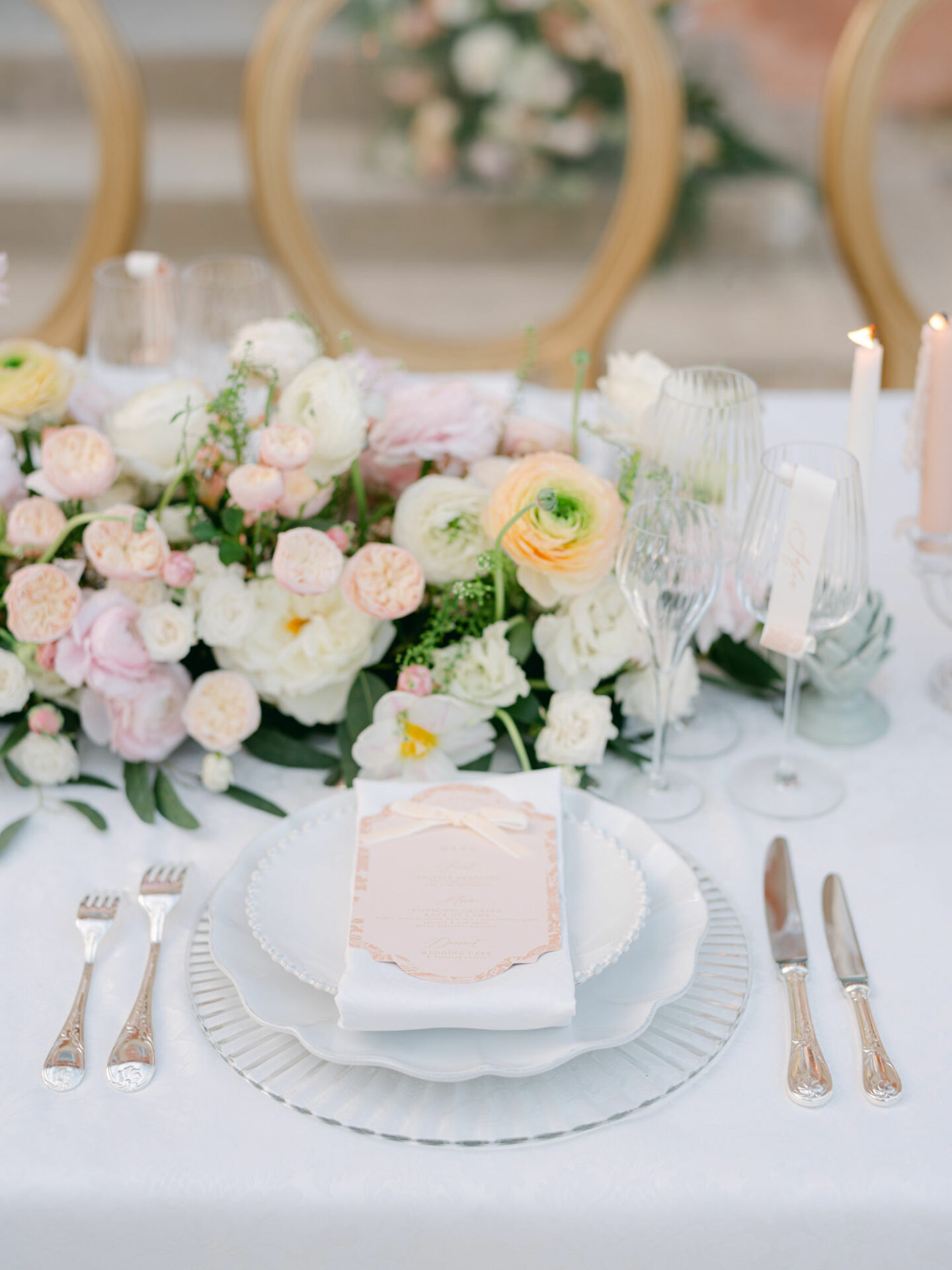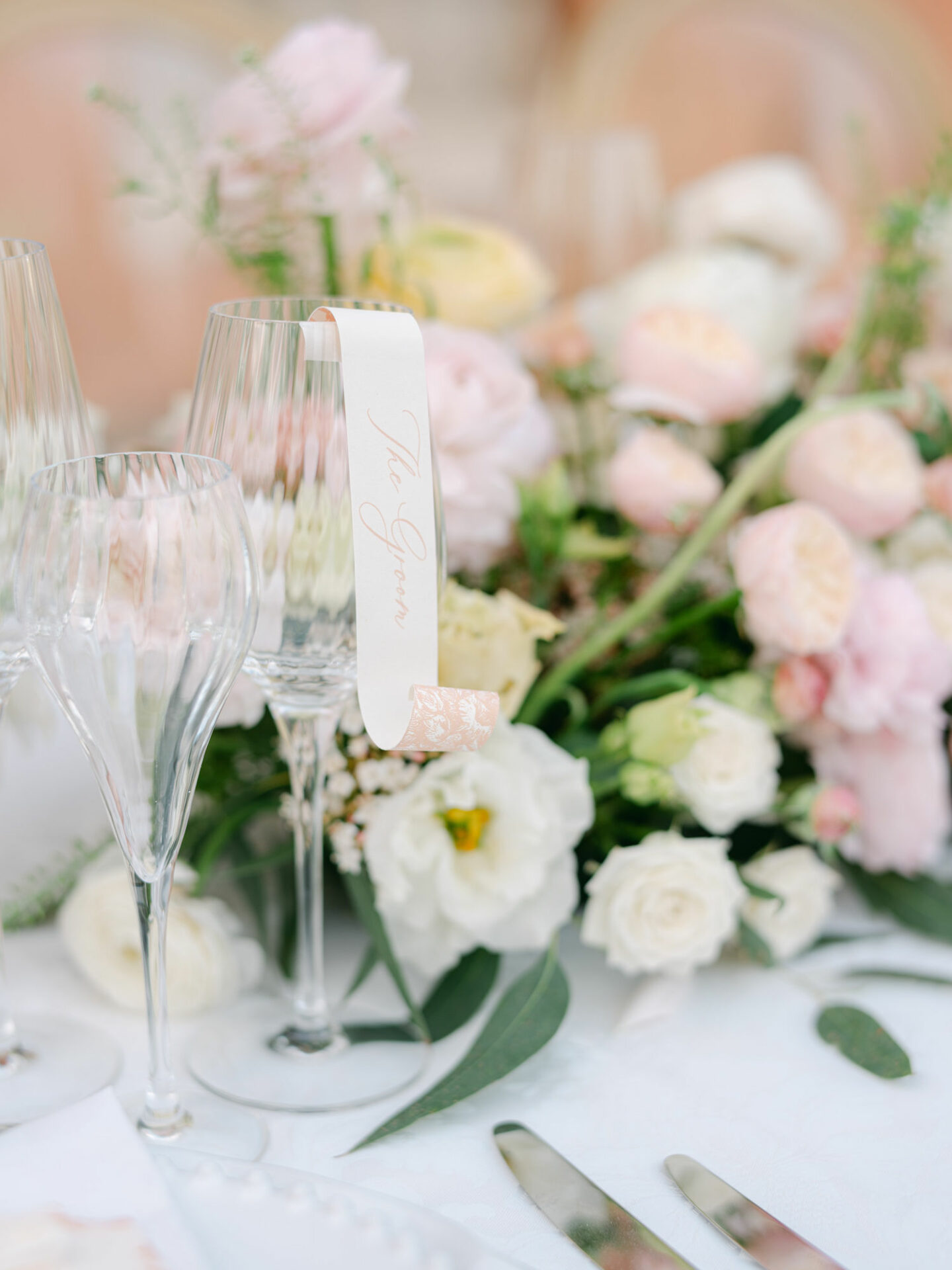 La scénographie a été pensée comme un prolongement du château avec Sophie, ma wedding designer depuis quelques années : une palette douce de blush, ivoire et pêche, pour créer une ambiance lumineuse et poétique. Les compositions florales apportaient de la vie et du mouvement, investissant aussi bien les espaces intérieurs que les extérieurs.