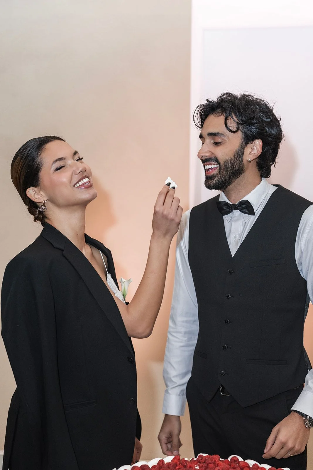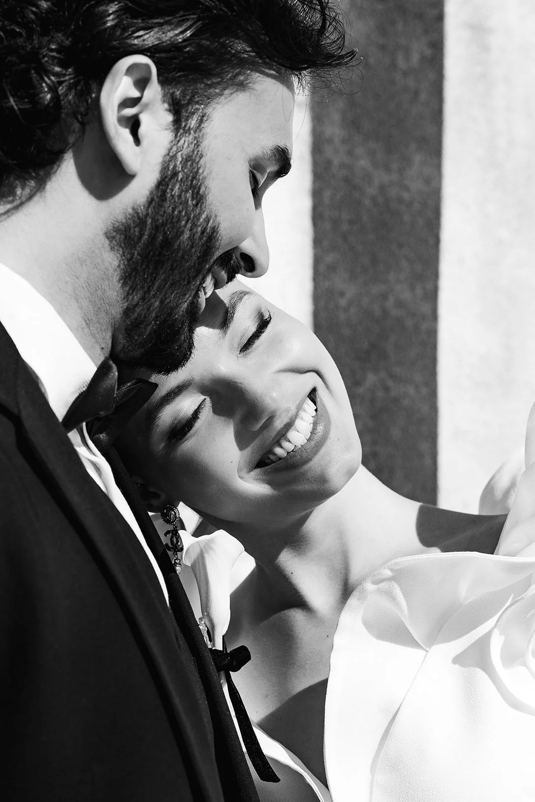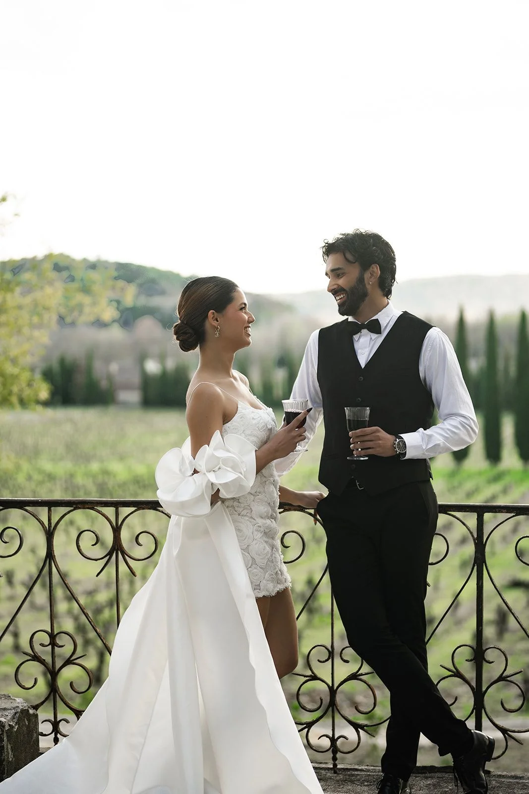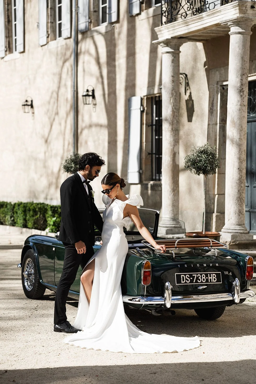 Tout au long de la journée, le couple évolue dans les espaces du château. Jardins baignés de lumière, piscine et tour de pierre deviennent le théâtre d’instants captés avec justesse. La mise en beauté signée L’Oréegance révèle la pureté des lignes et souligne la modernité de cet éditorial, tandis que les silhouettes se déploient dans une élégance affirmée. Chaque élément de la scénographie participe à cette vision : la table habillée des fleurs de So’Floral, la papeterie raffinée de Kaligrafia, le wedding cake signé Bec Sucré Événementiel. Un ensemble pensé comme une ode à l’art de recevoir, entre chic et poésie.”