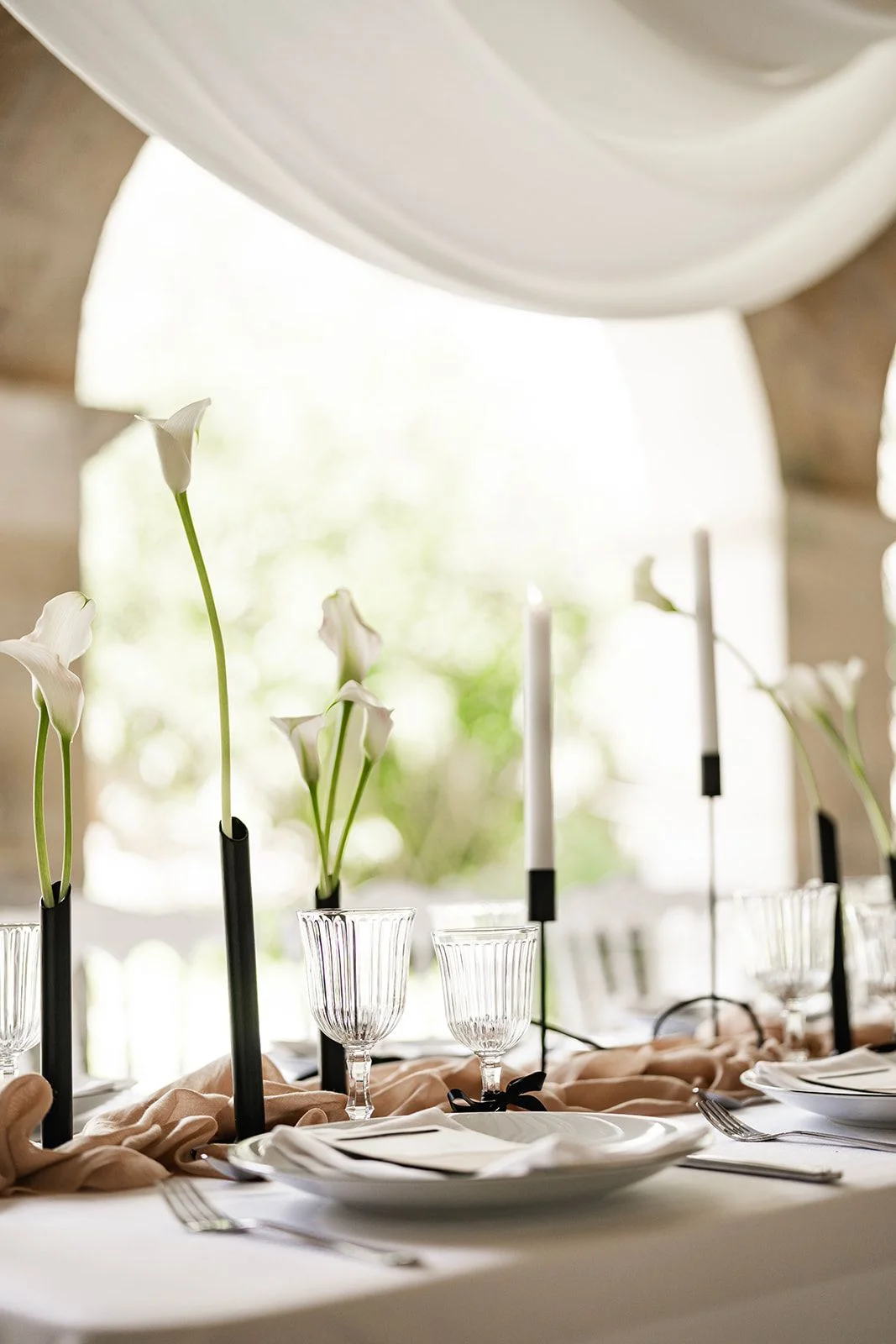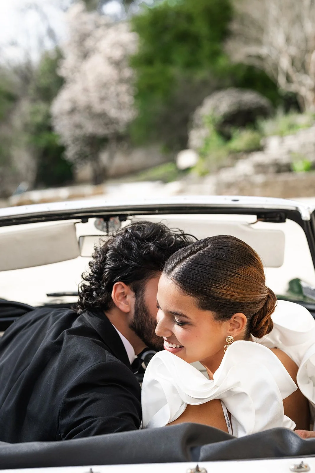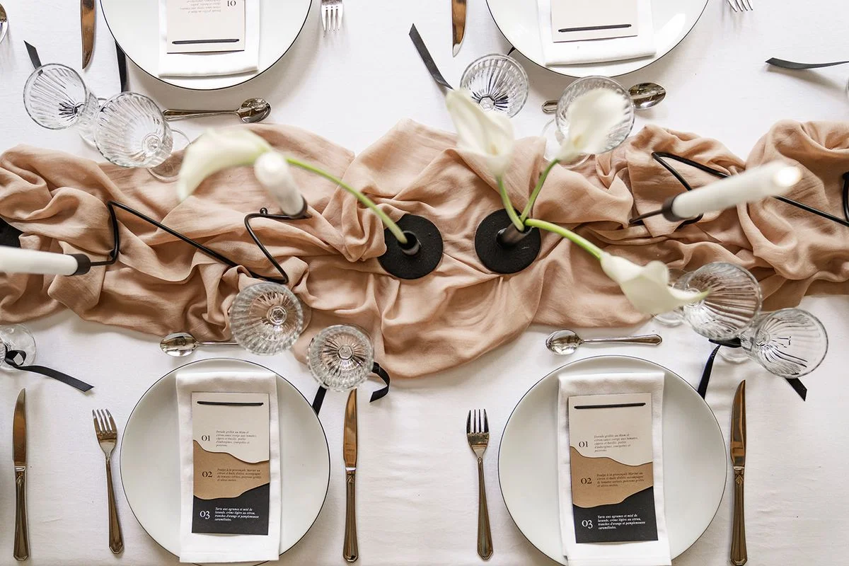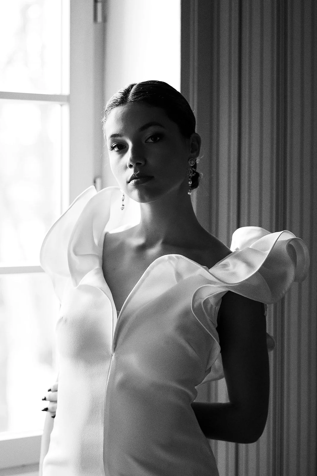 Tout au long de la journée, le couple évolue dans les espaces du château. Jardins baignés de lumière, piscine et tour de pierre deviennent le théâtre d’instants captés avec justesse. La mise en beauté signée L’Oréegance révèle la pureté des lignes et souligne la modernité de cet éditorial, tandis que les silhouettes se déploient dans une élégance affirmée. Chaque élément de la scénographie participe à cette vision : la table habillée des fleurs de So’Floral, la papeterie raffinée de Kaligrafia, le wedding cake signé Bec Sucré Événementiel. Un ensemble pensé comme une ode à l’art de recevoir, entre chic et poésie.”