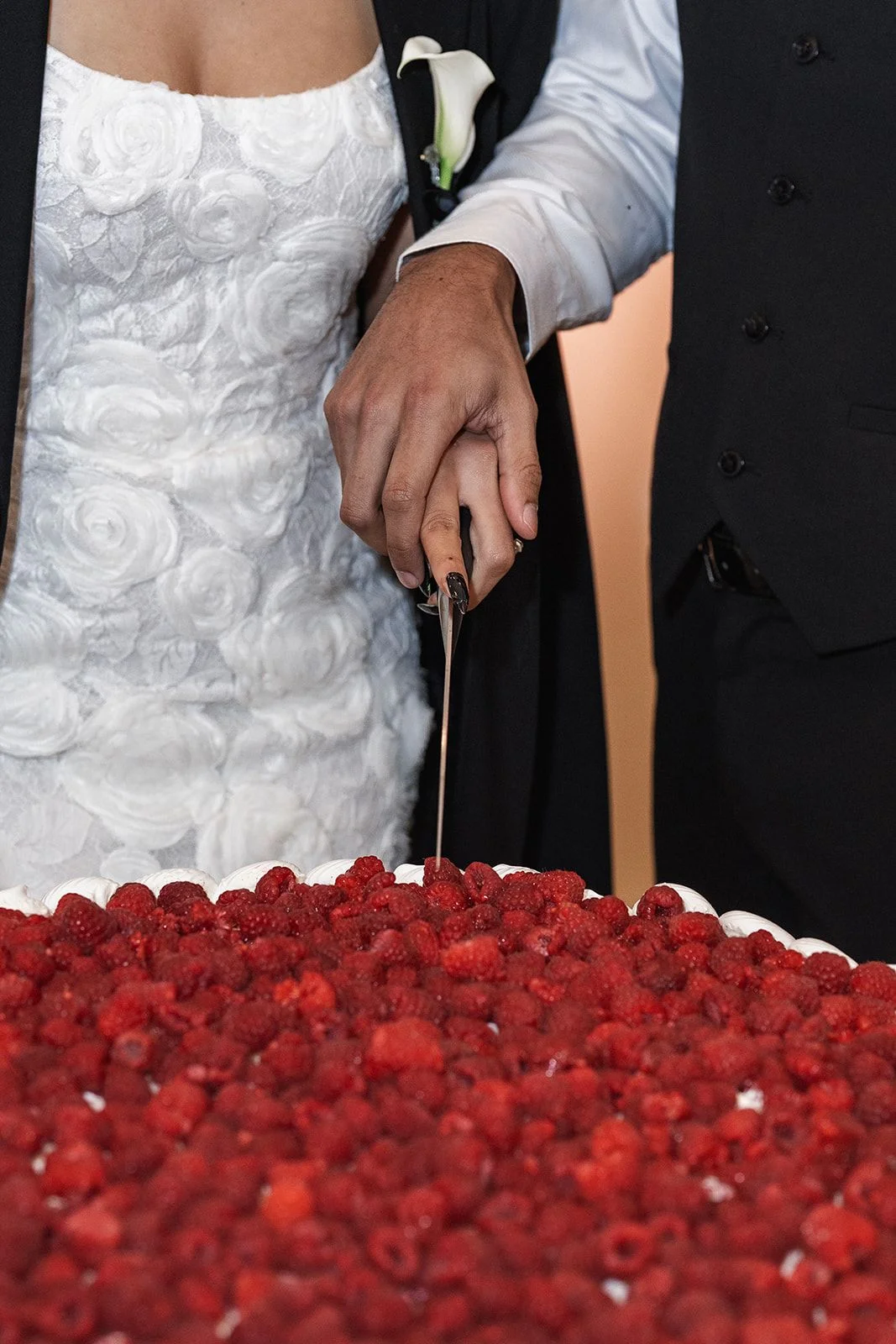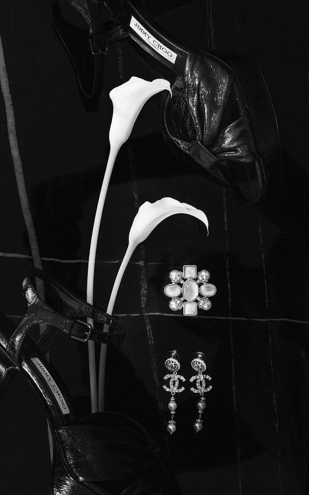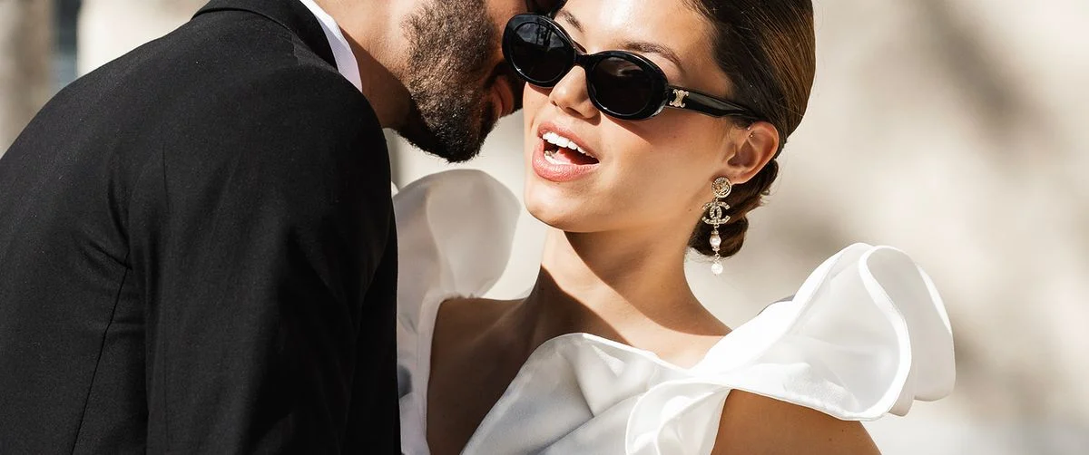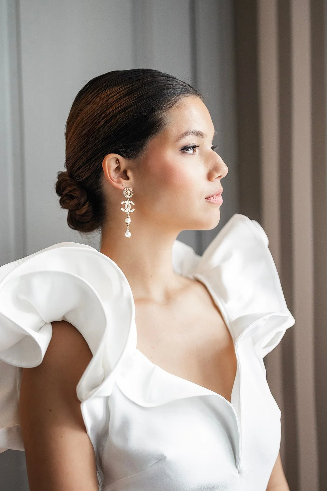 Tout au long de la journée, le couple évolue dans les espaces du château. Jardins baignés de lumière, piscine et tour de pierre deviennent le théâtre d’instants captés avec justesse. La mise en beauté signée L’Oréegance révèle la pureté des lignes et souligne la modernité de cet éditorial, tandis que les silhouettes se déploient dans une élégance affirmée. Chaque élément de la scénographie participe à cette vision : la table habillée des fleurs de So’Floral, la papeterie raffinée de Kaligrafia, le wedding cake signé Bec Sucré Événementiel. Un ensemble pensé comme une ode à l’art de recevoir, entre chic et poésie.”