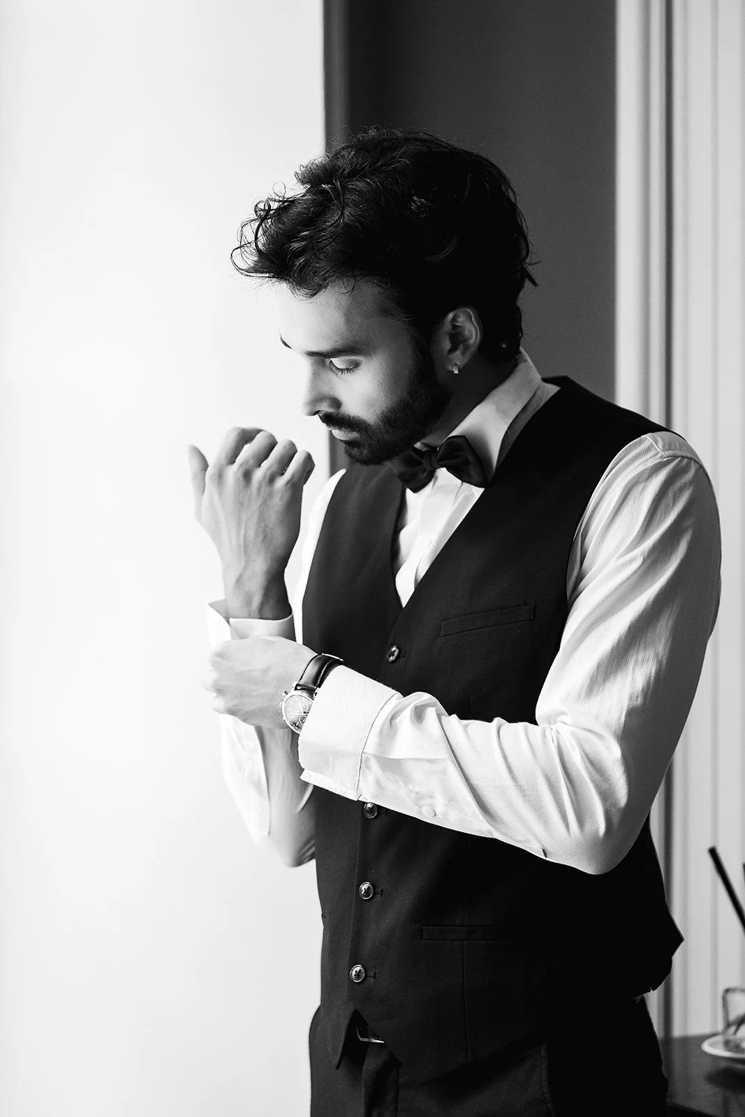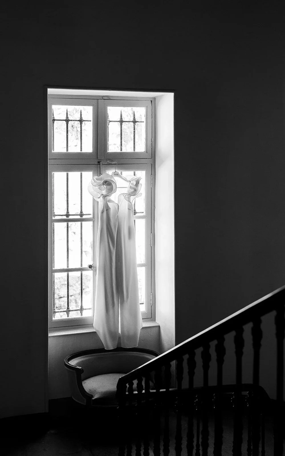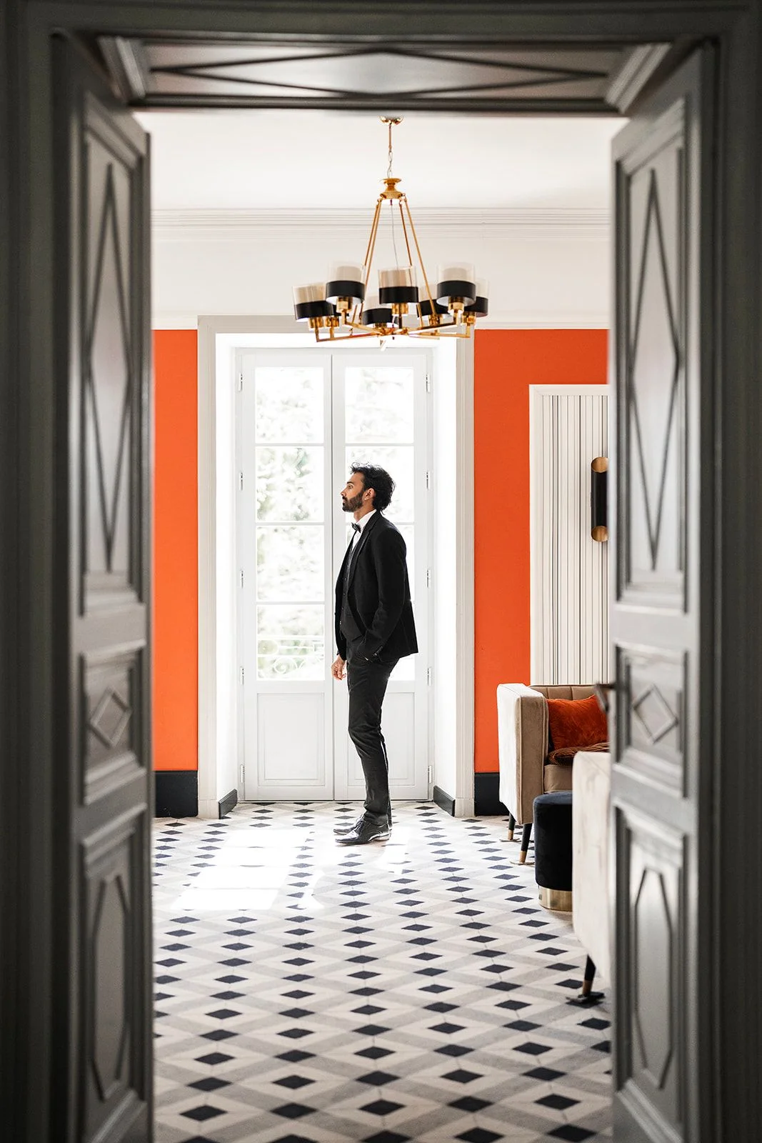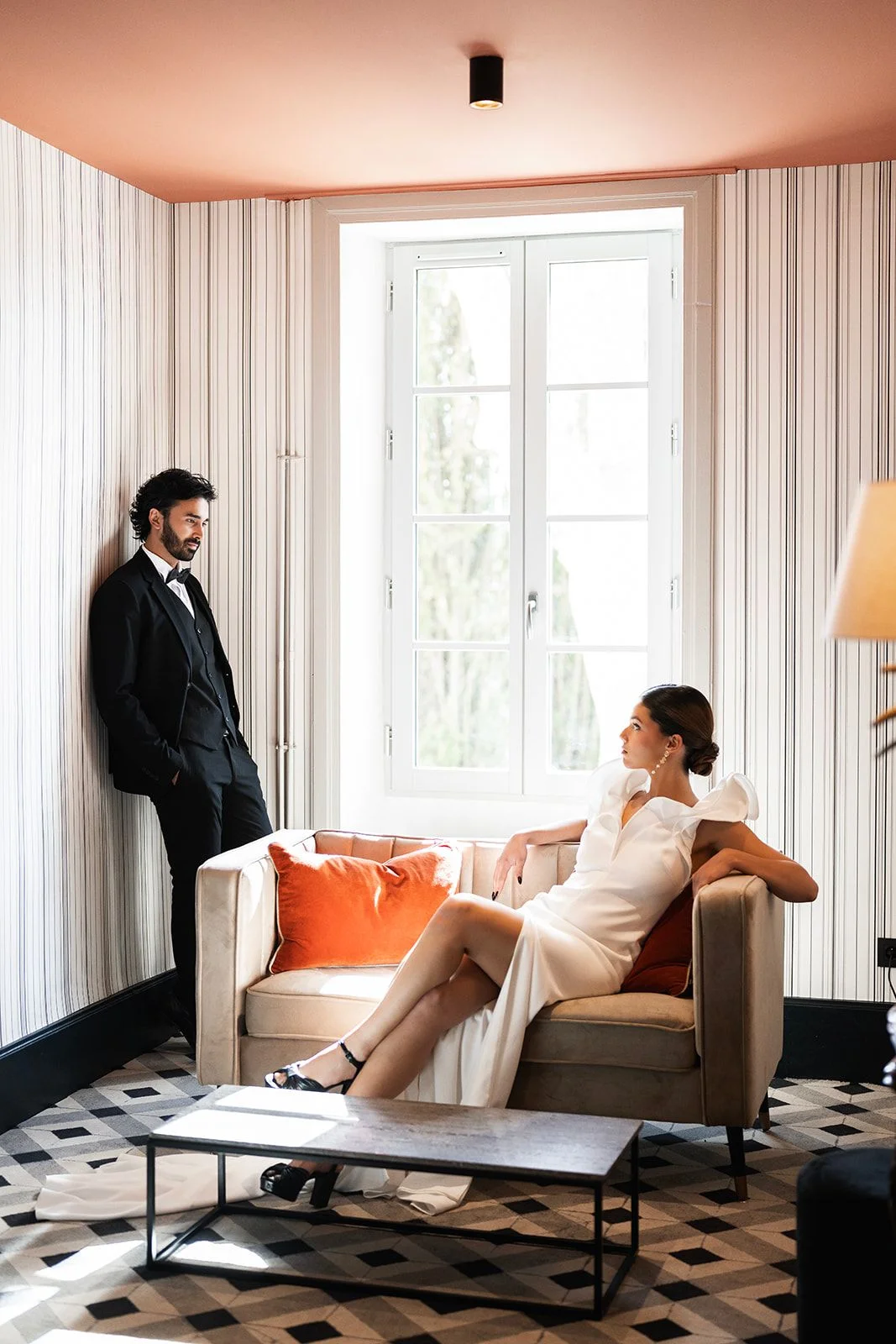Dans la suite nuptiale, véritable havre élégant et intimiste, la mariée prend le temps de savourer les préparatifs. Les étoffes raffinées, les moulures d’époque et la lumière naturelle qui traverse les grandes fenêtres composent un décor apaisant. Le marié, de son côté, profite d’un salon au caractère affirmé. Entre boiseries élégantes et touches contemporaines, il se prépare dans une ambiance chic et détendue. Chaque détail reflète cette esthétique mode, pensée comme une parenthèse précieuse avant la rencontre.