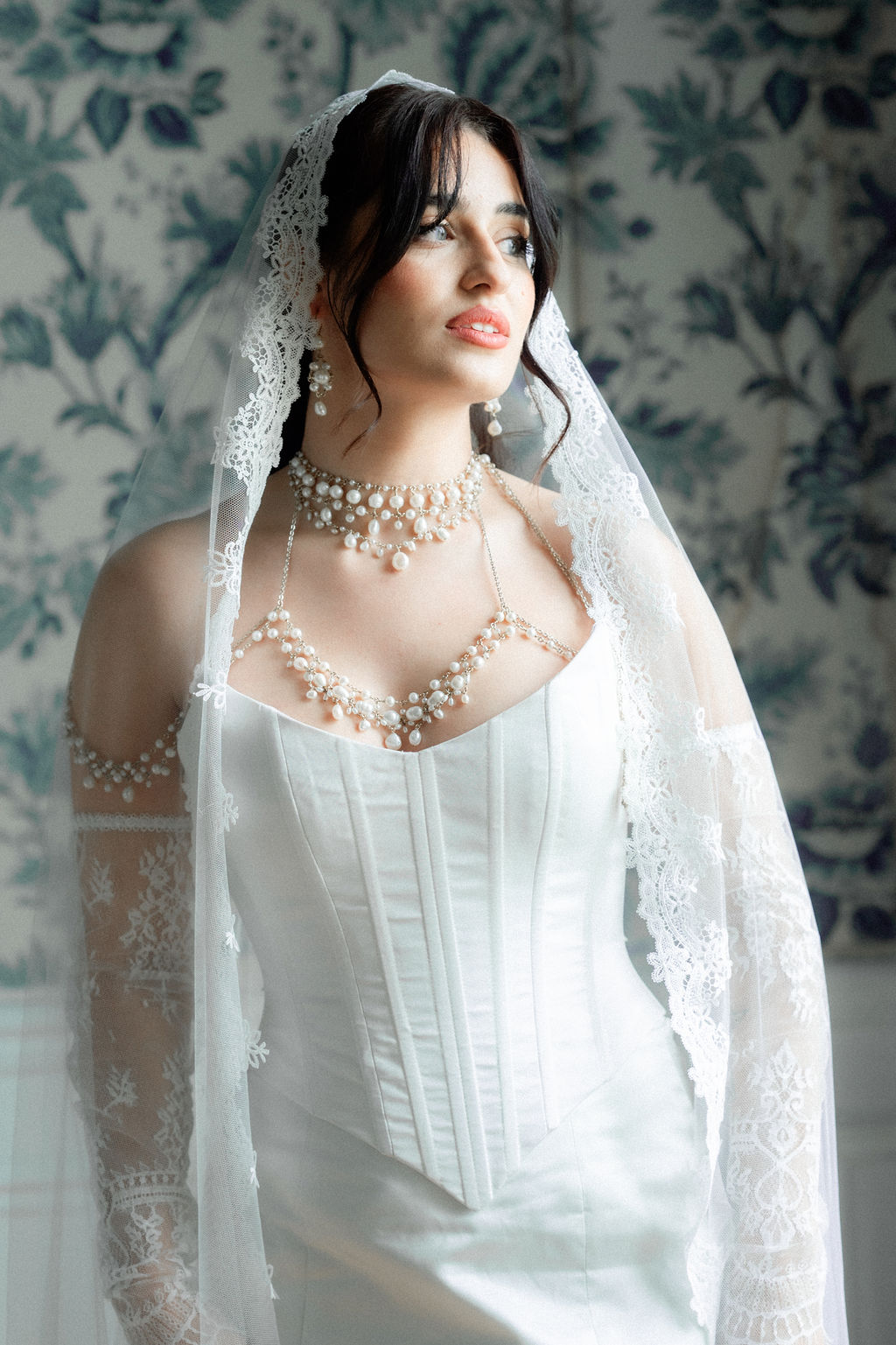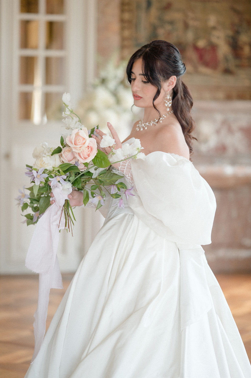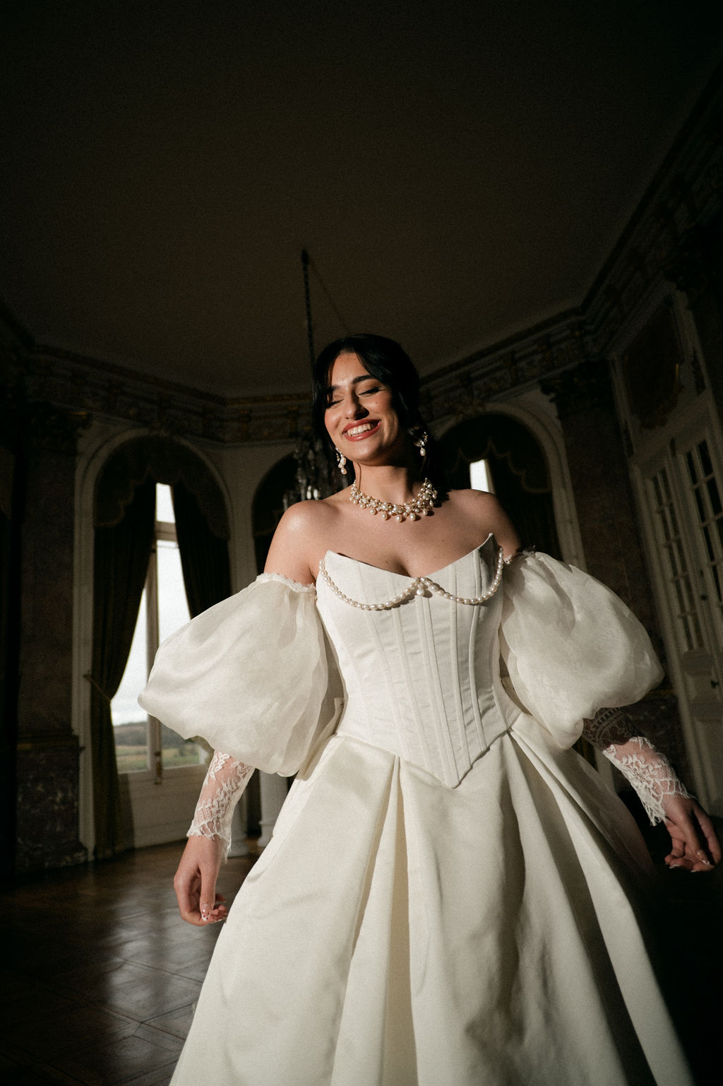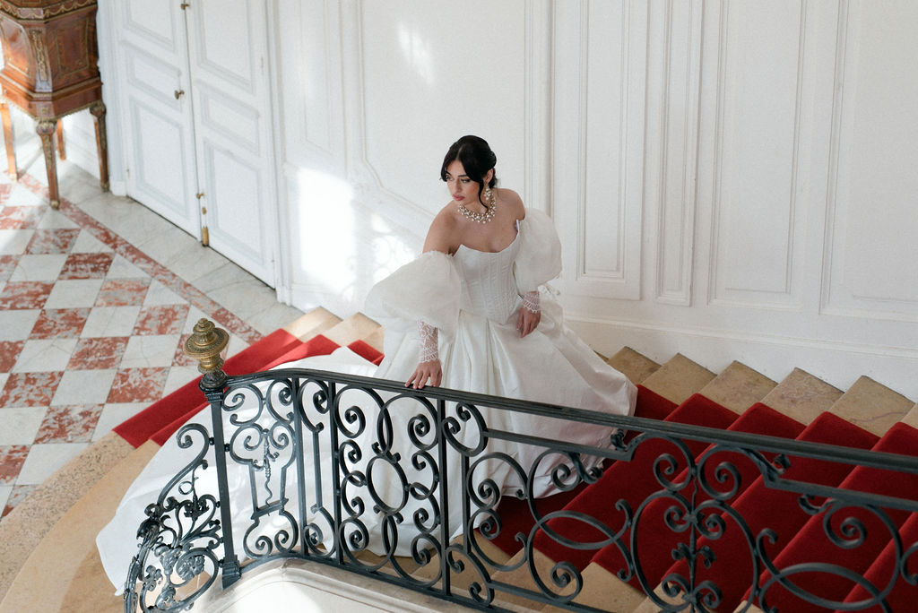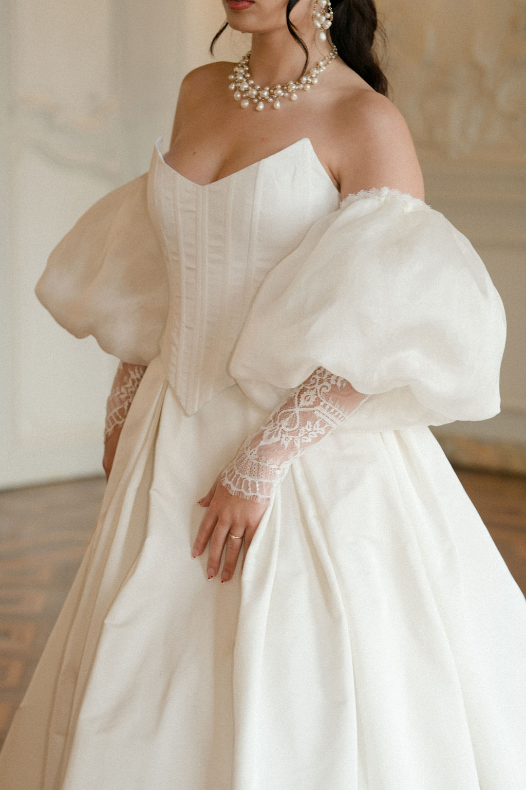 Le corset lacé sculpte la silhouette, tandis que les grandes manches ballons ajoutent une touche théâtrale. Le décolleté architectural souligne le port de tête avec grâce. Les jeux de transparences entre dentelle et organza captent la lumière et révèlent avec subtilité la délicatesse du travail artisanal. Les nuances crémeuses subliment le teint de notre mariée brune aux yeux bleus.