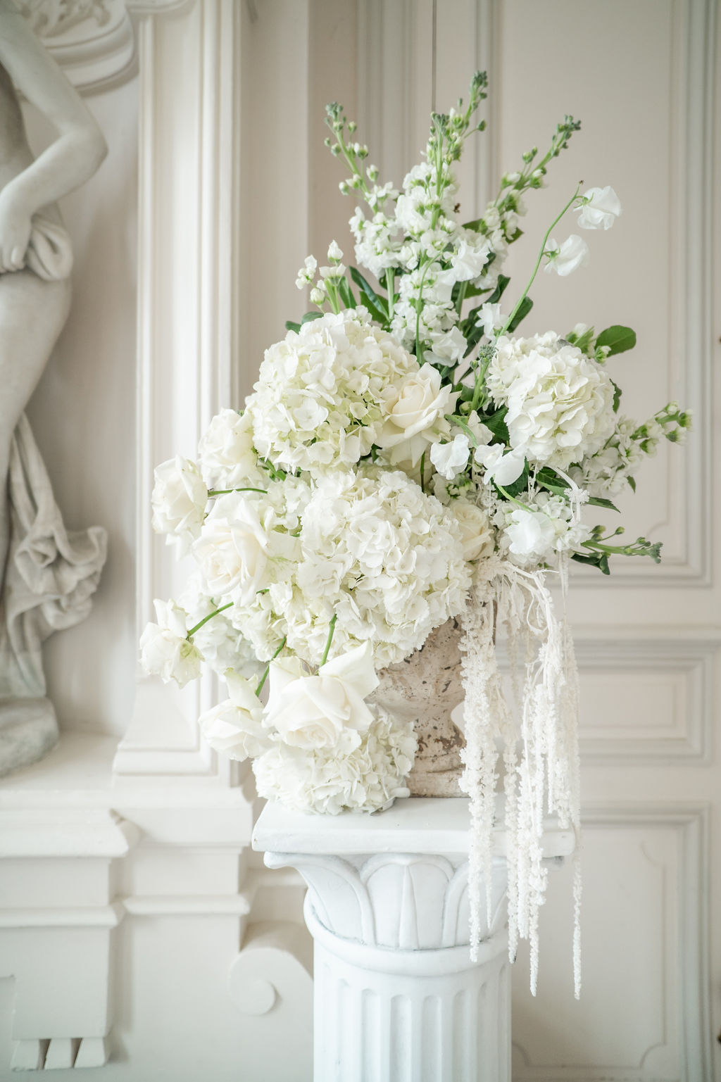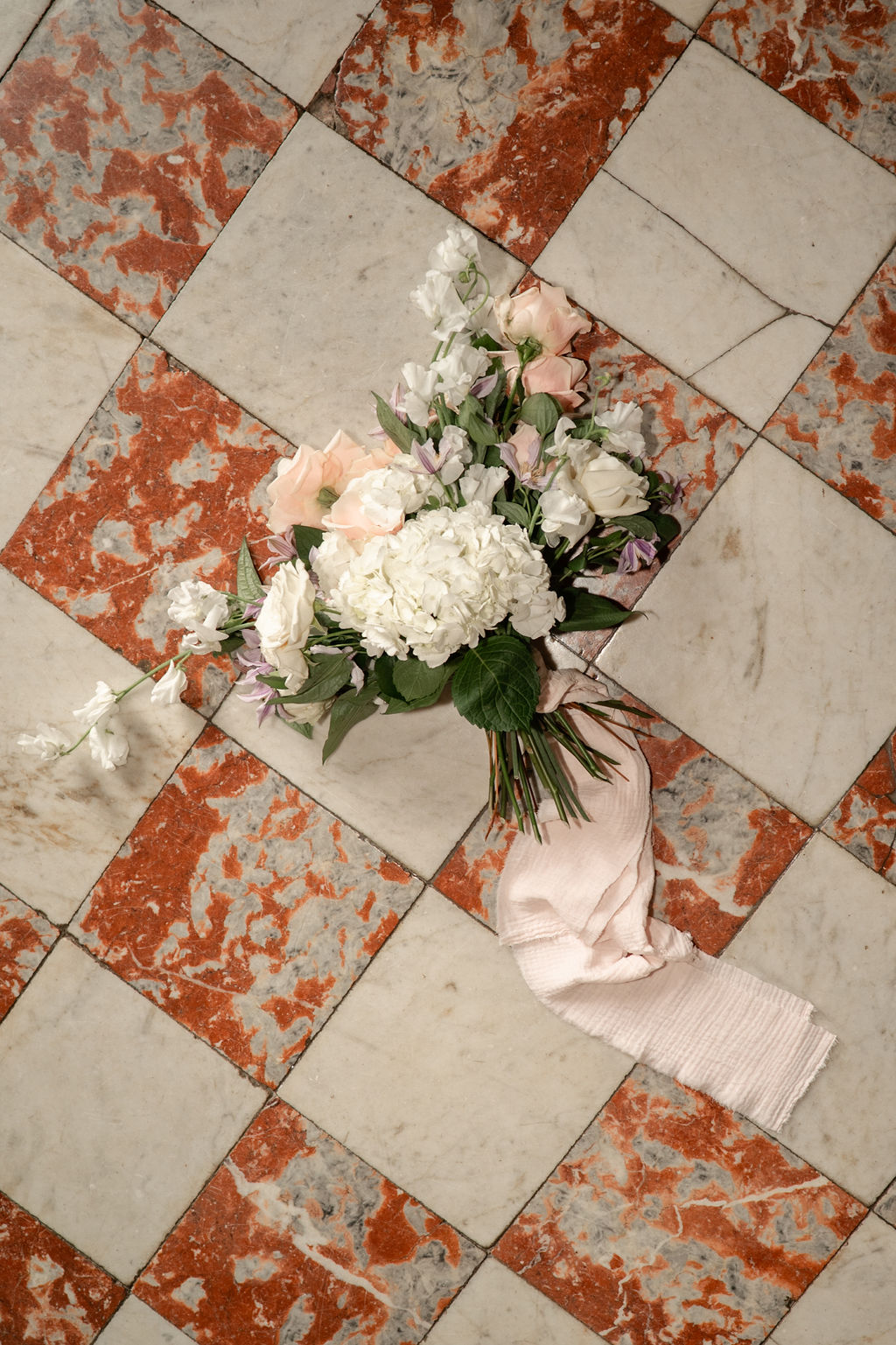 “Notre choix d’une scénographie épurée ne pouvait toutefois pas se passer d’elles : les fleurs ! Elles ont insufflé douceur et élégance à plusieurs de nos tableaux. Le bouquet et les compositions étaient composées d’hortensia et de roses. Leur forme asymétrique et gracieusement désordonnée rappelle les arabesques et motifs de l’art rococo.”