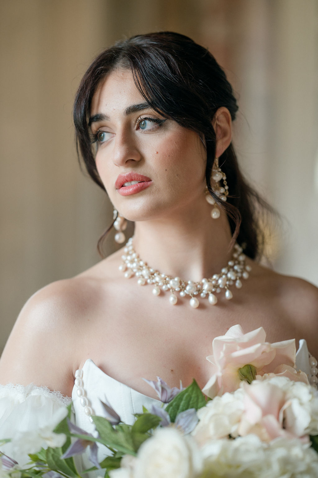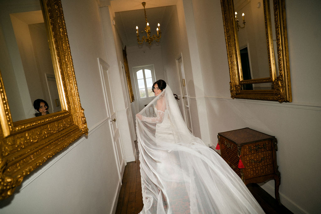 “La coiffure s’inspire de l’univers baroque tout en lui ajoutant une part de douceur et de légèreté. Le make-up a sublimé la beauté naturelle de notre mariée : le teint lumineux, légèrement poudré, et les lèvres d’une nuance nude rosé, évoquent la douceur des portraits d’époque, tandis que l’intensité de son regard a été délicatement souligné.”