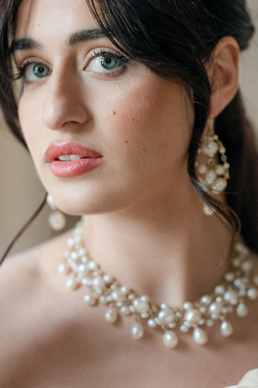 “Le collier et les boucles d’oreilles sont des pièces uniques, créées sur mesure. Le collier de perles incarne l’exubérance du baroque avec son enchevêtrement de perles de différentes tailles, créant un effet de luxuriance et de volume. La disposition asymétrique et légèrement irrégulière des perles évoque l’aspect naturel et organique propre aux bijoux baroques, où l’accumulation et la grandeur priment. Il apporte une présence forte et théâtrale, soulignant la ligne du cou.
