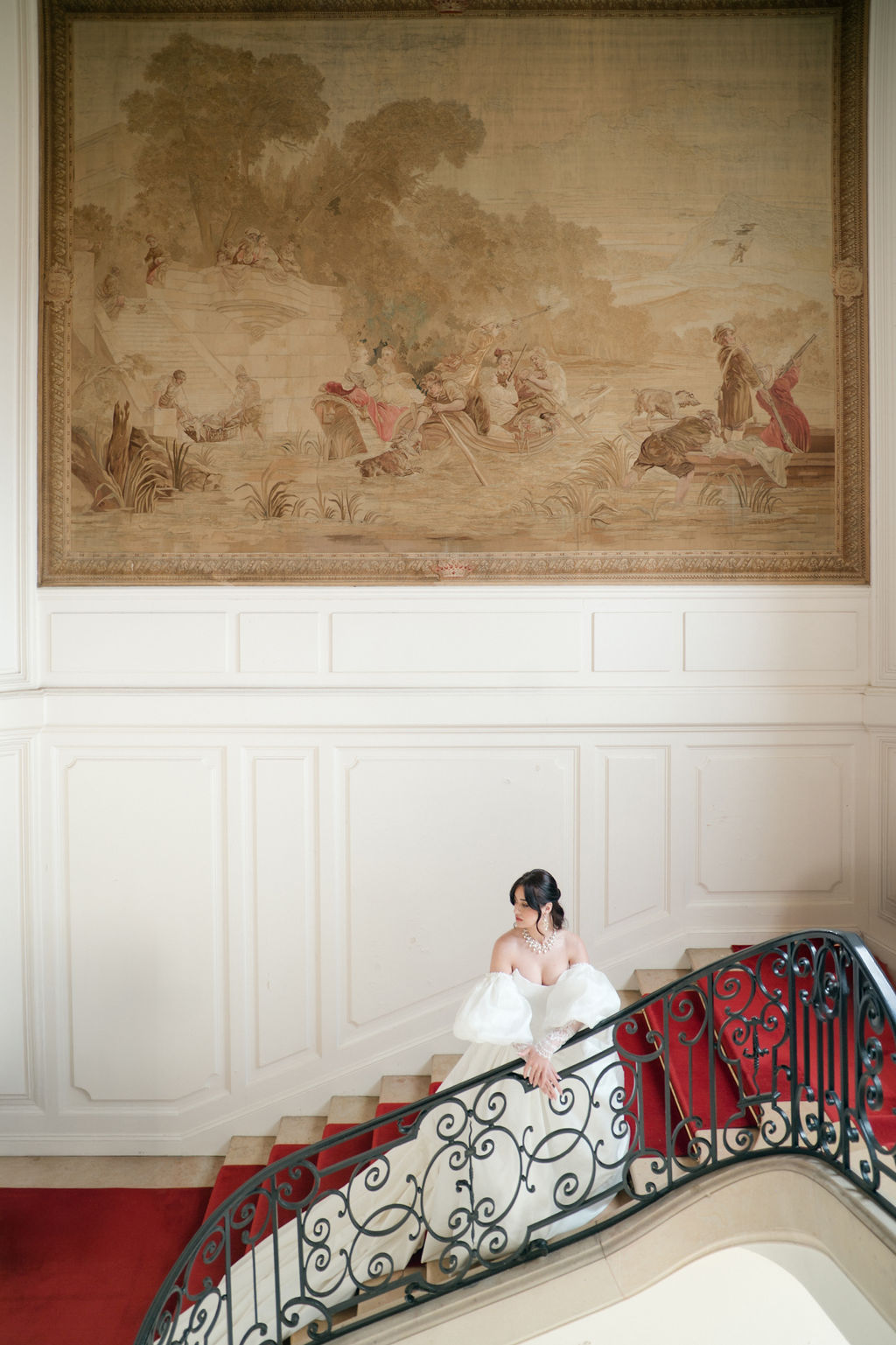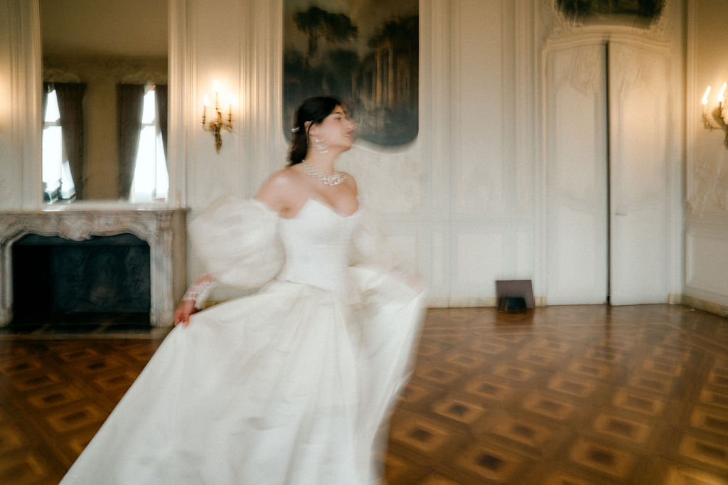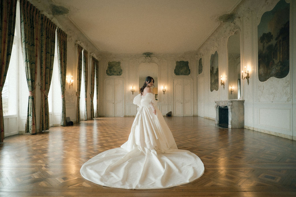 “Le Château Dangu, avec son esthétique à la fois raffinée et opulente, était le cadre parfait pour ce shooting où nous souhaitions mettre en avant la féminité d’un style à la fois glamour et baroque, inspiré du rococo. Notre modèle, Romane, en a été l’héroïne parfaite, apportant le charisme d’une héroïne de conte moderne au charme d’une féminité à fleur de peau.”