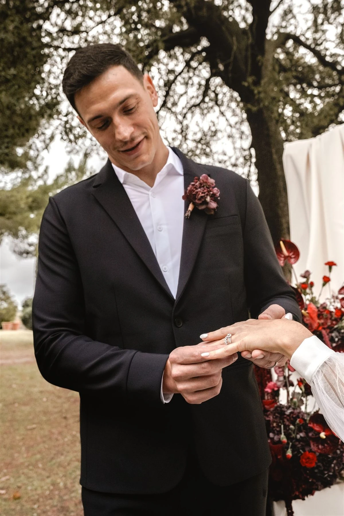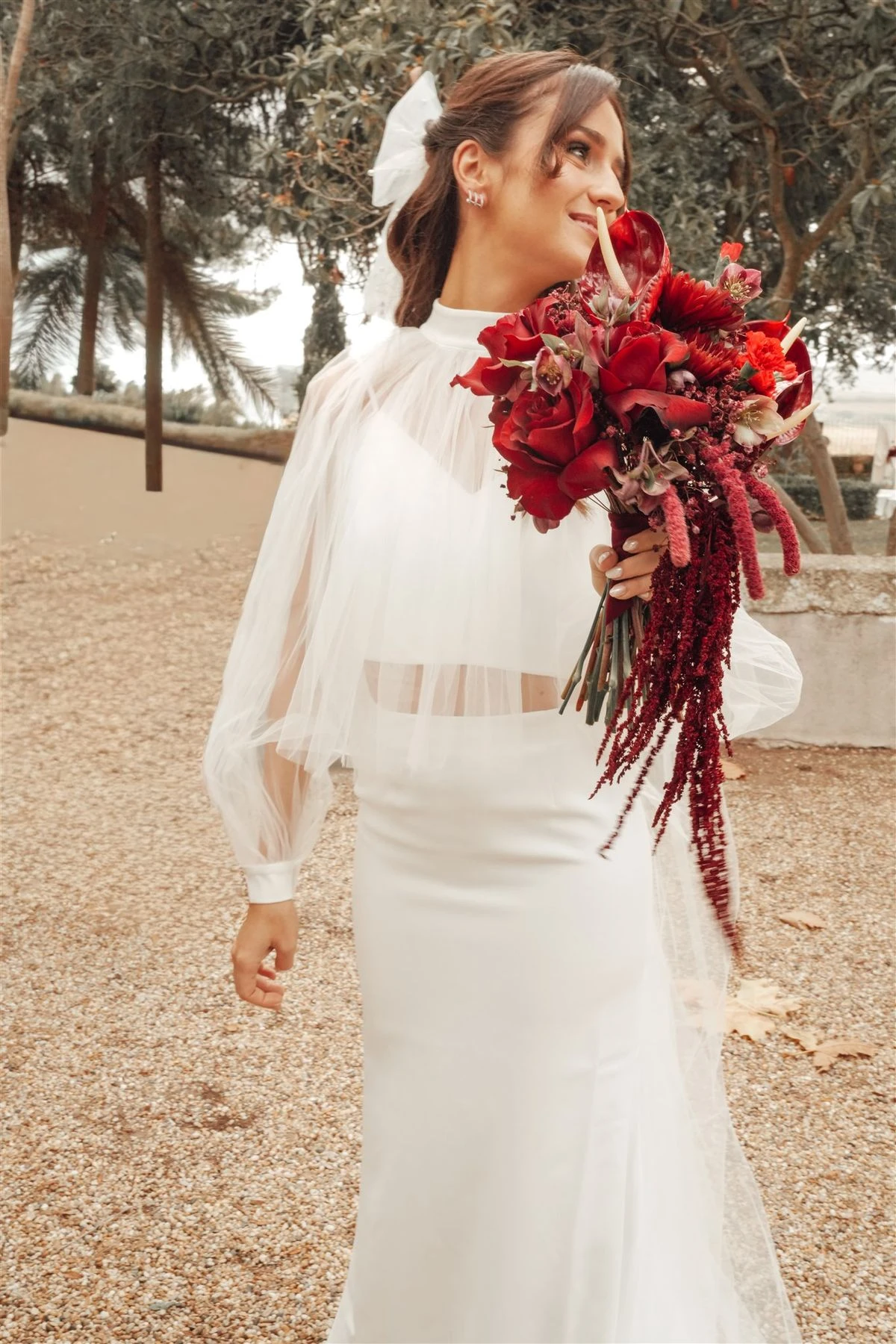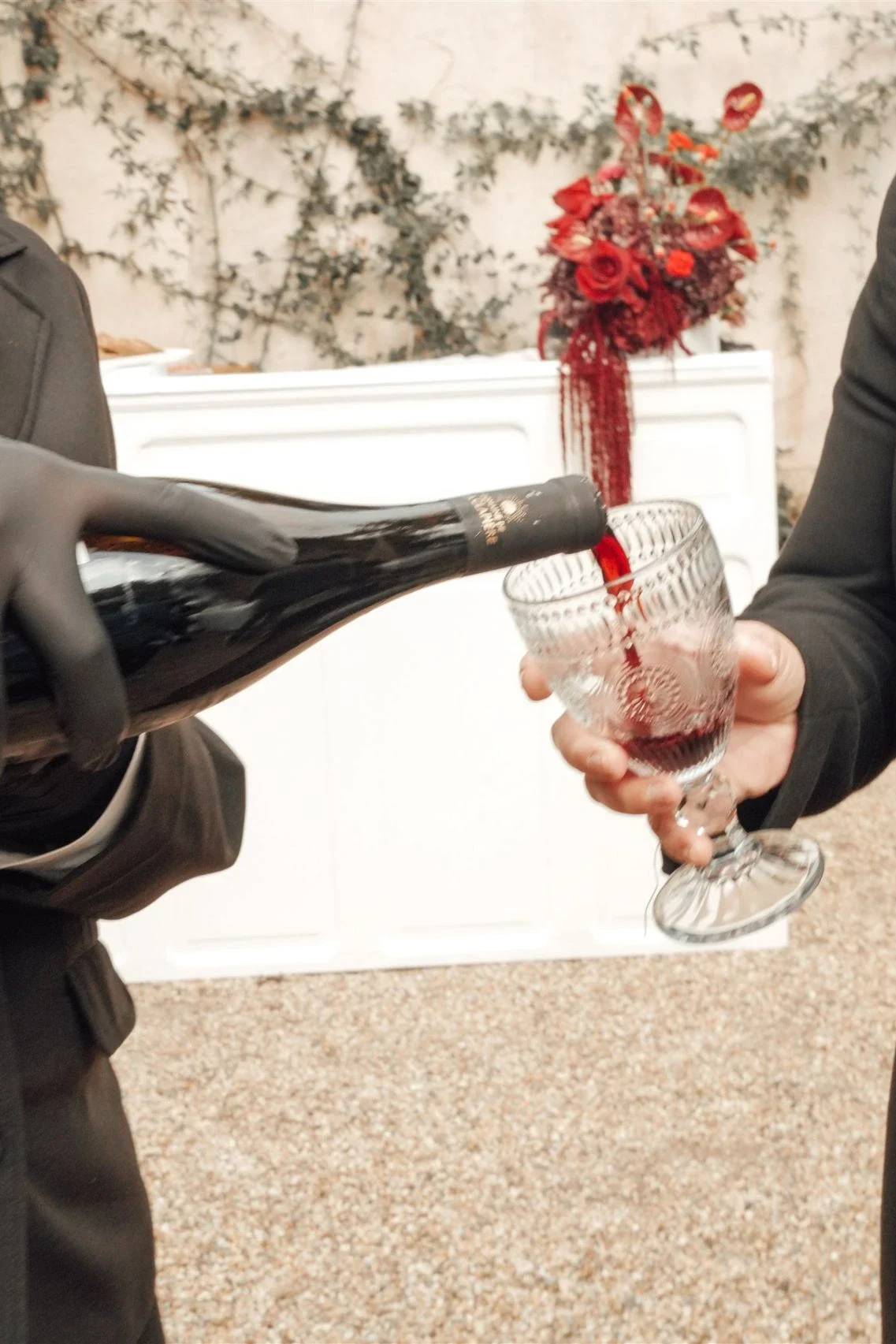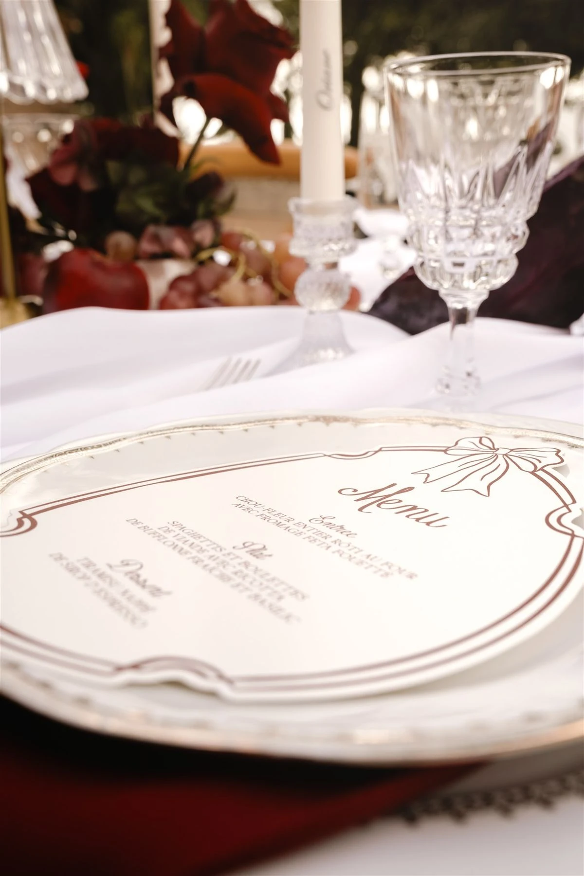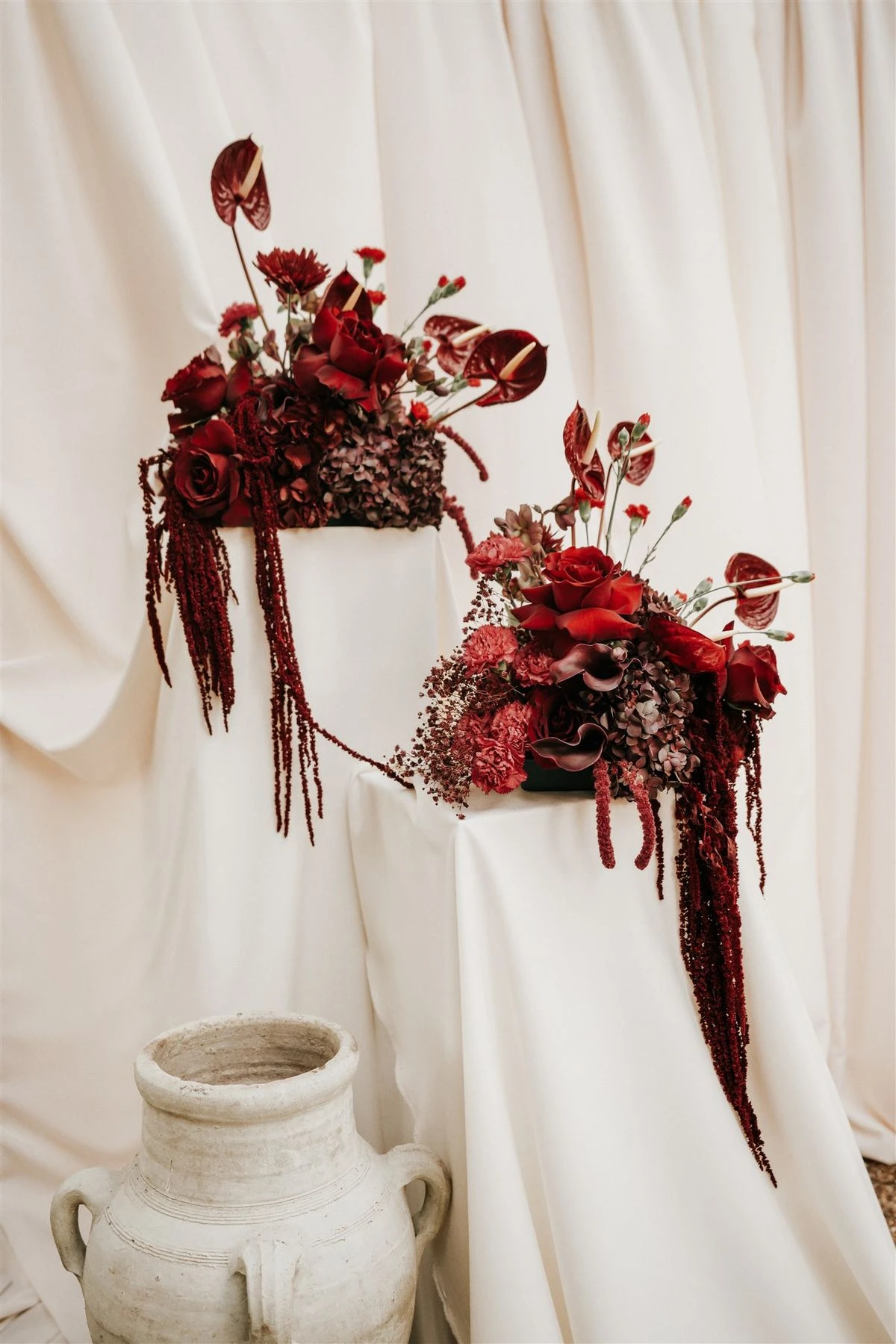 “Ce shooting d’inspiration mariage est une ode à une élégance intemporelle, mêlant la pureté du blanc à la profondeur chaleureuse du rouge bordeaux.