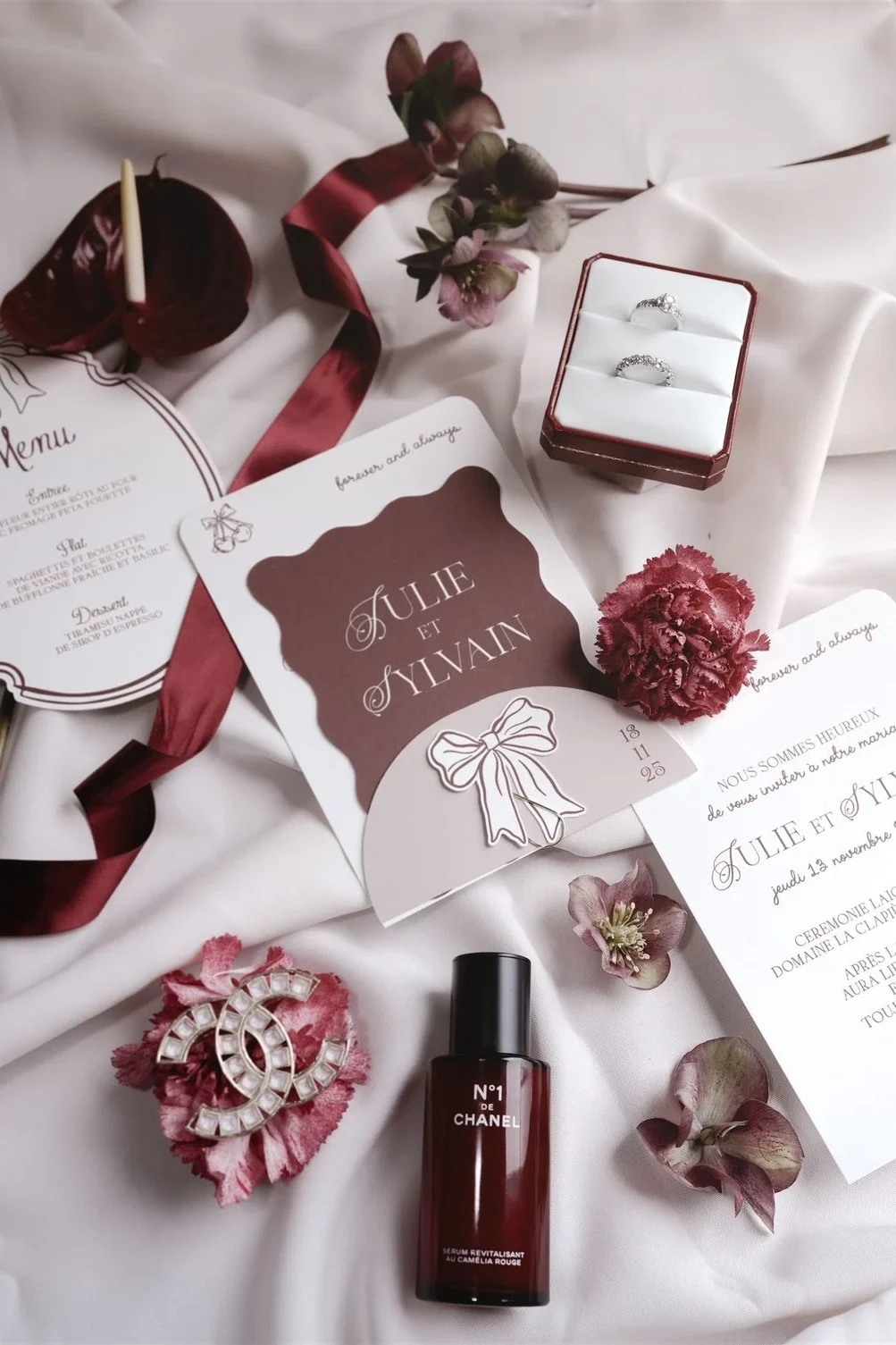 “Ce shooting d’inspiration mariage est une ode à une élégance intemporelle, mêlant la pureté du blanc à la profondeur chaleureuse du rouge bordeaux.