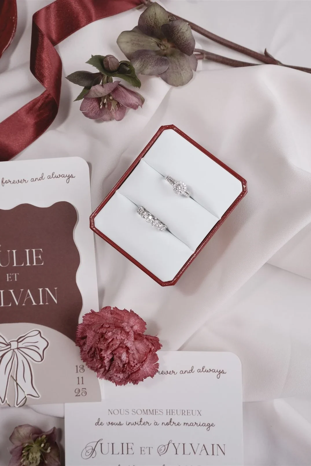 Imaginé comme un mariage chic et raffiné, ce projet met en scène un couple uni par un amour sincère et passionné. Le blanc apporte la lumière, la douceur et la simplicité, tandis que le bordeaux révèle une dimension plus intense, symbole de passion, de maturité et d’émotion.