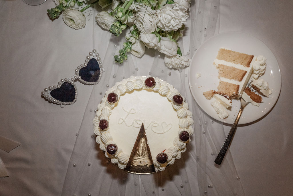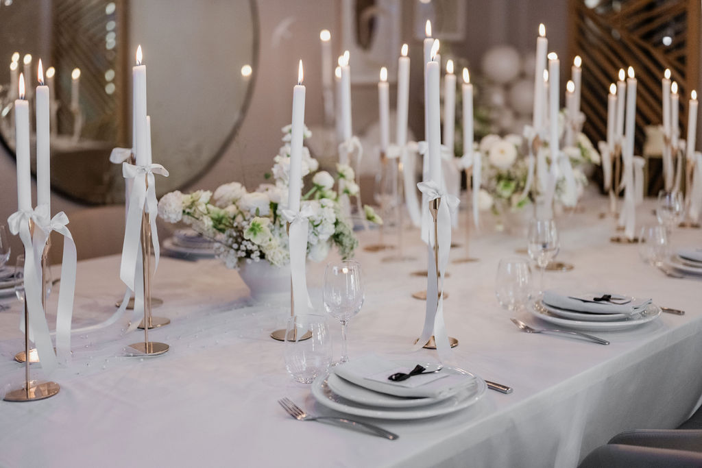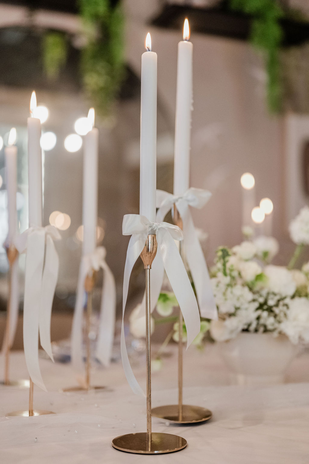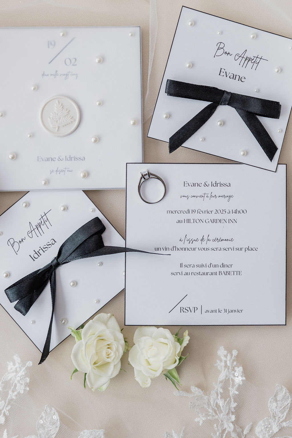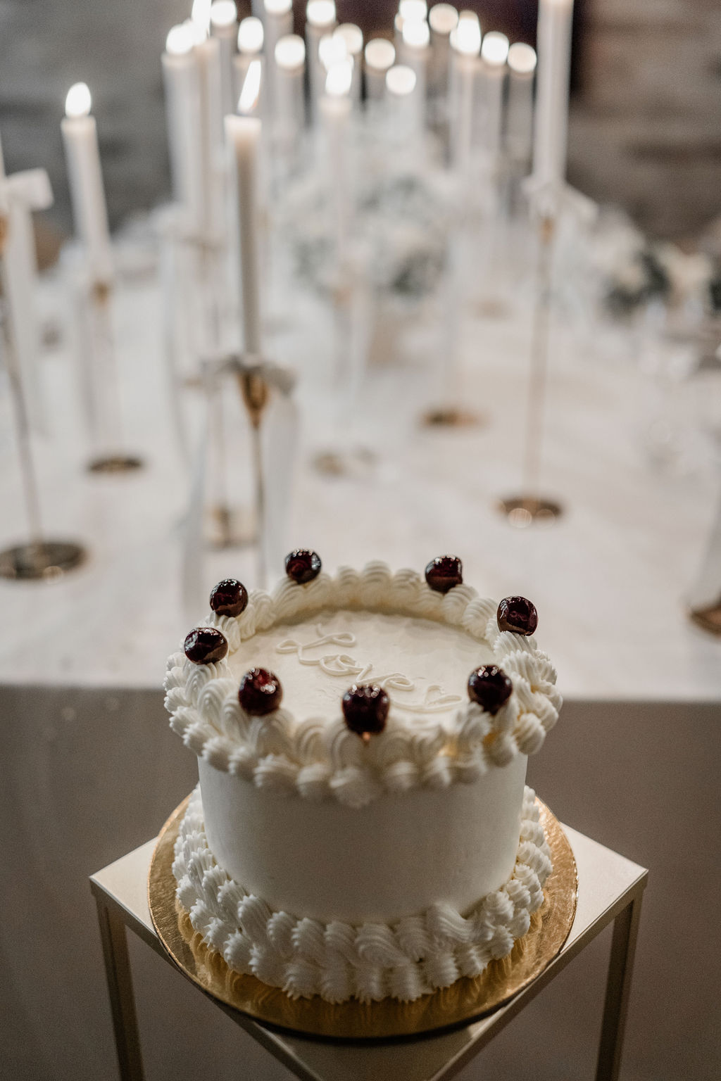 La papeterie, signée La Petite Noceuse, joue avec un contraste en noir et blanc pour accentuer le raffinement et le glamour. Pour la mise en scène de la table, le blanc a été mis à l’honneur, symbole de pureté et d’élégance. Une nappe blanche a été sublimée par un long voile de tulle perlé, avec une trentaine de bougies blanches, délicatement nouées de satin, créant une ambiance intimiste et chaleureuse. Le gâteau de mariage, conçu par L’Atelier Gourmand, s’inscrit dans cette esthétique épurée et sophistiquée : blanc et délicat, il est sublimé par des griottes pour une touche de gourmandise.