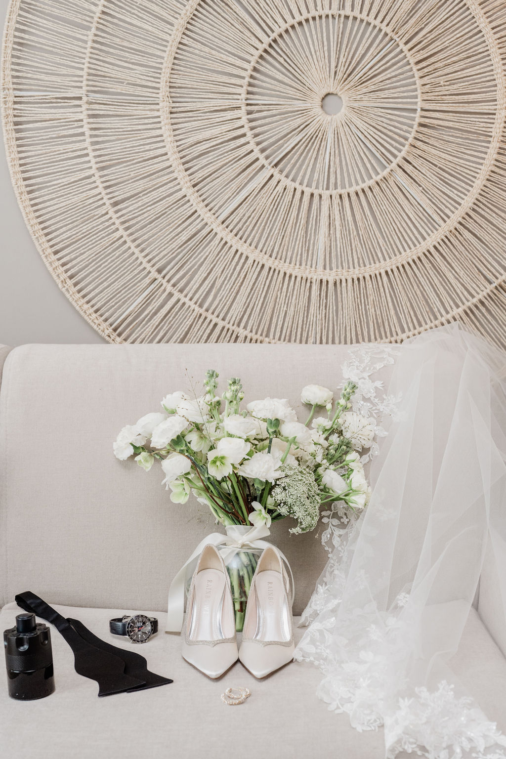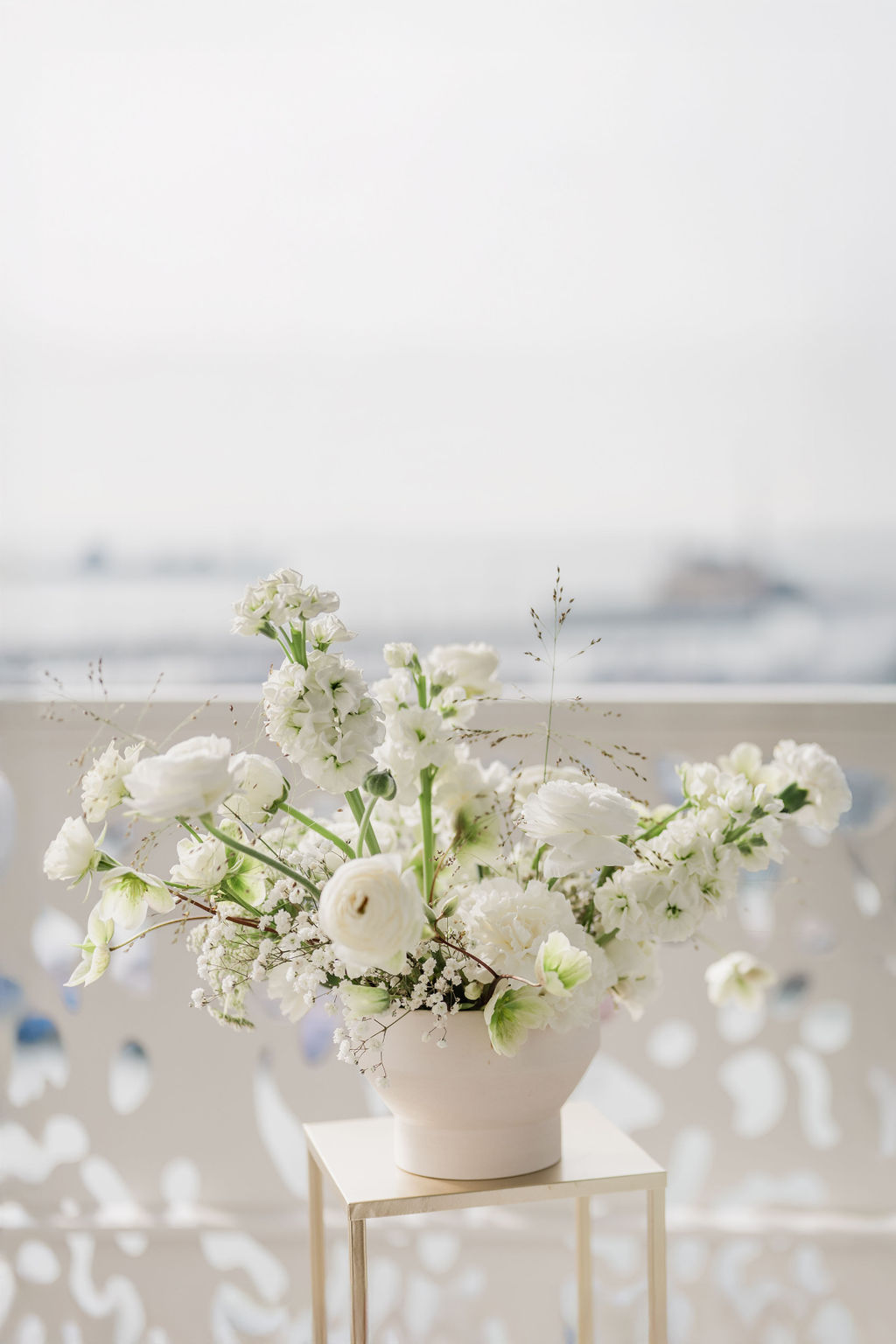 Pour parfaire cette ambiance floral glamour, Pensée Bohème a imaginé des compositions élégantes et raffinées avec des fleurs blanches de saison, d’origine française. Les renoncules blanches délicates incarnent la beauté, le charme et l’amour sincère. Elles se marient à merveille avec un mariage chic. Les hellébores, fleurs discrètes d’une grande beauté, portent chance et bonheur. Les giroflées ajoutent une note de vivacité, et les graminées apportent un effet aérien et naturel à l’ensemble.