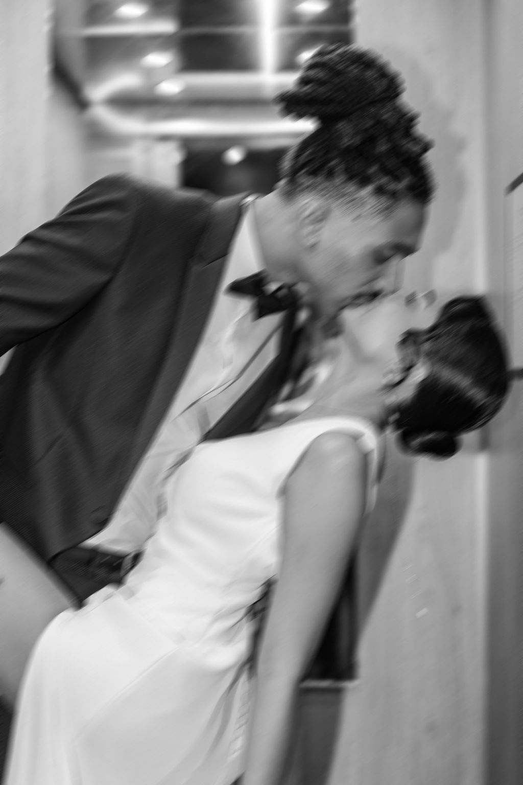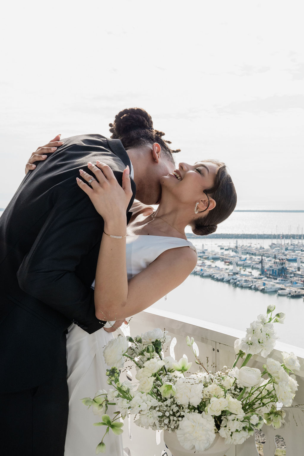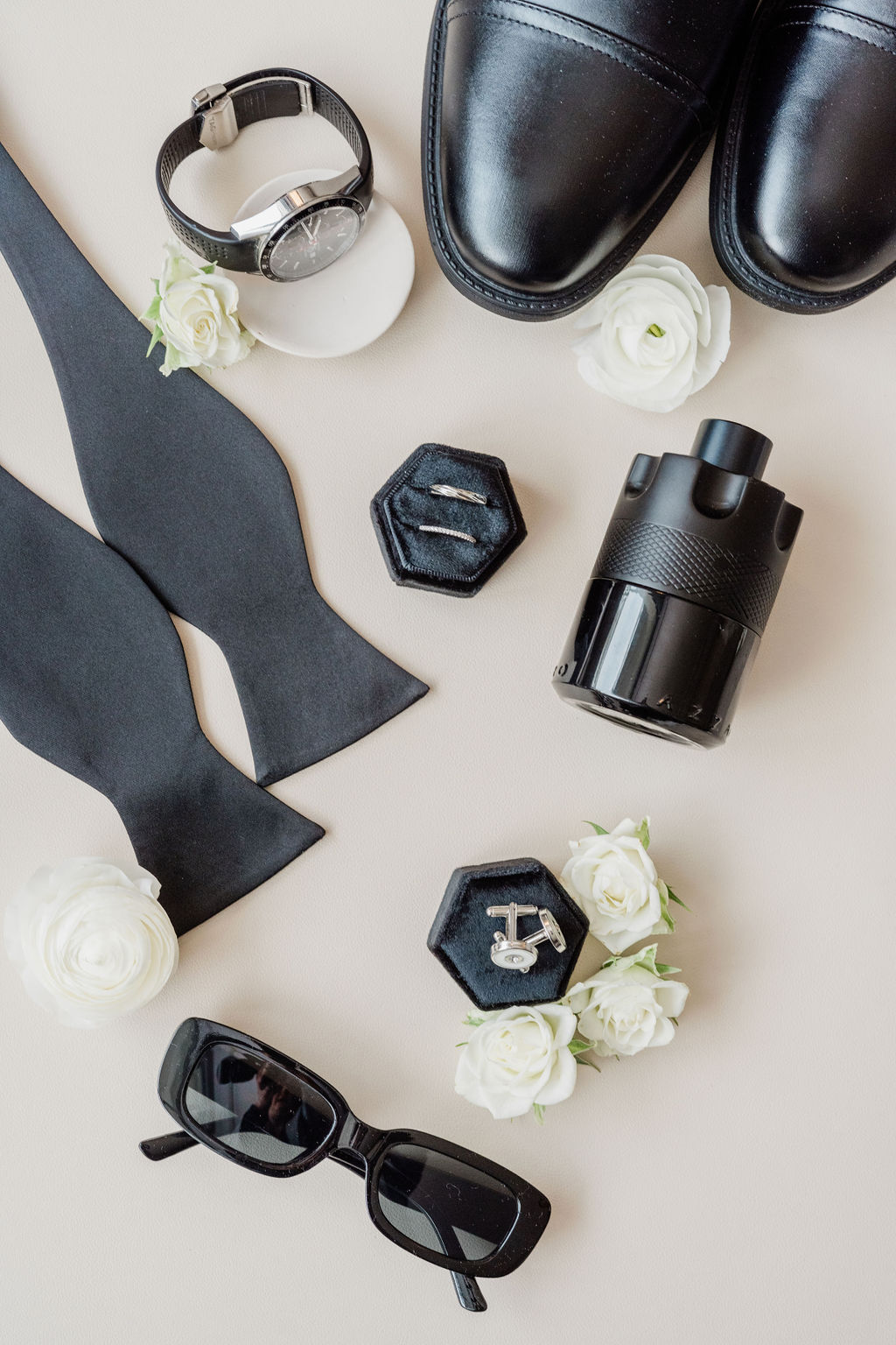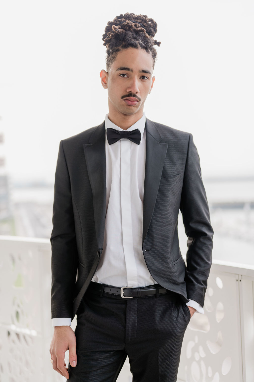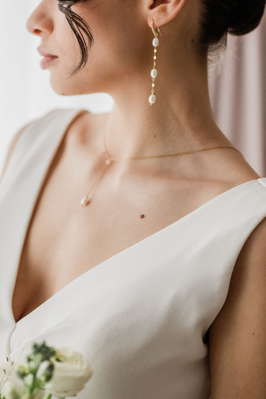 Pour le marié, nous avons imaginé un look sobre et intemporel : un costume noir ajusté. La mariée, quant à elle, porte une robe fluide et moderne, trouvée au Showroom de Céline D’Al à Bolbec (76), qui évoque à la fois la grâce et la modernité. Les bijoux, créés sur mesure par la talentueuse marque Atelier23 du Havre (76), apportent de l’éclat et de la finesse. Composées de perles d’eau douce, ces pièces uniques ajoutent une élégance subtile à la mariée. Sa mise en beauté a été confiée à des expertes : une coiffure sobre et sophistiquée réalisée par Les Coiffures d’Anaïs, accompagnée d’un maquillage glamour signé Aurora Make Up, qui sublime son éclat naturel tout en renforçant l’atmosphère hollywoodienne du shooting.