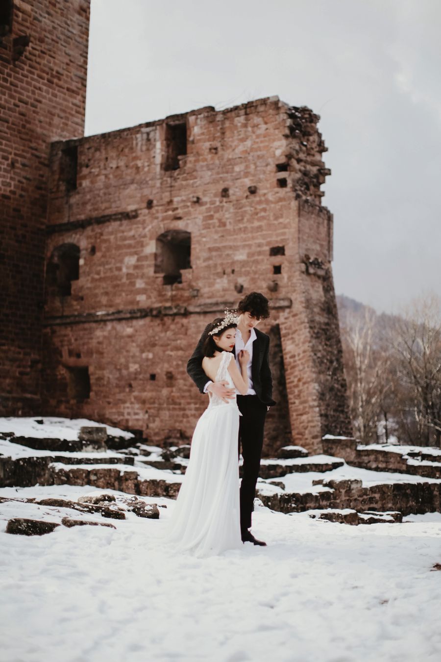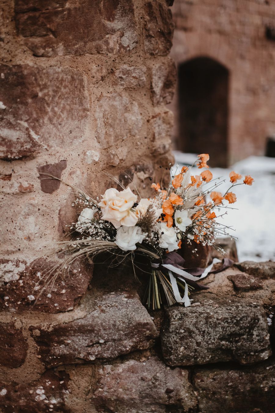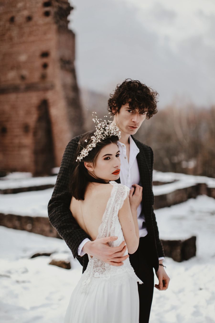 C’est sous une douce lumière d’hiver que tout les membres de l’équipe de ce shooting se sont donné rendez-vous pour donner vie à leur vision d’un mariage bohème avec une touche médiévale. L’idée était de jouer avec les saisons. L’hiver est représenté par le décor et l’ambiance avec les ruines de château enneigé. Et la robe Elsa Gary au grand décolleté de dos ainsi que les fleurs et le maquillage aux teintes chaudes donnent un coté plus estivale.