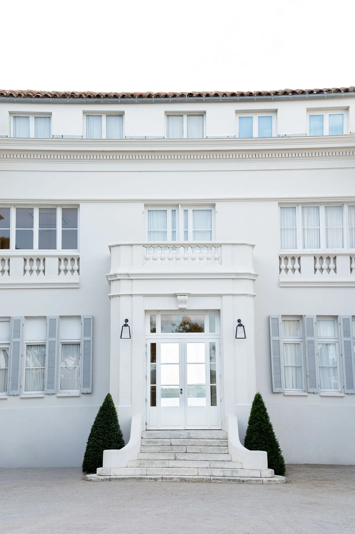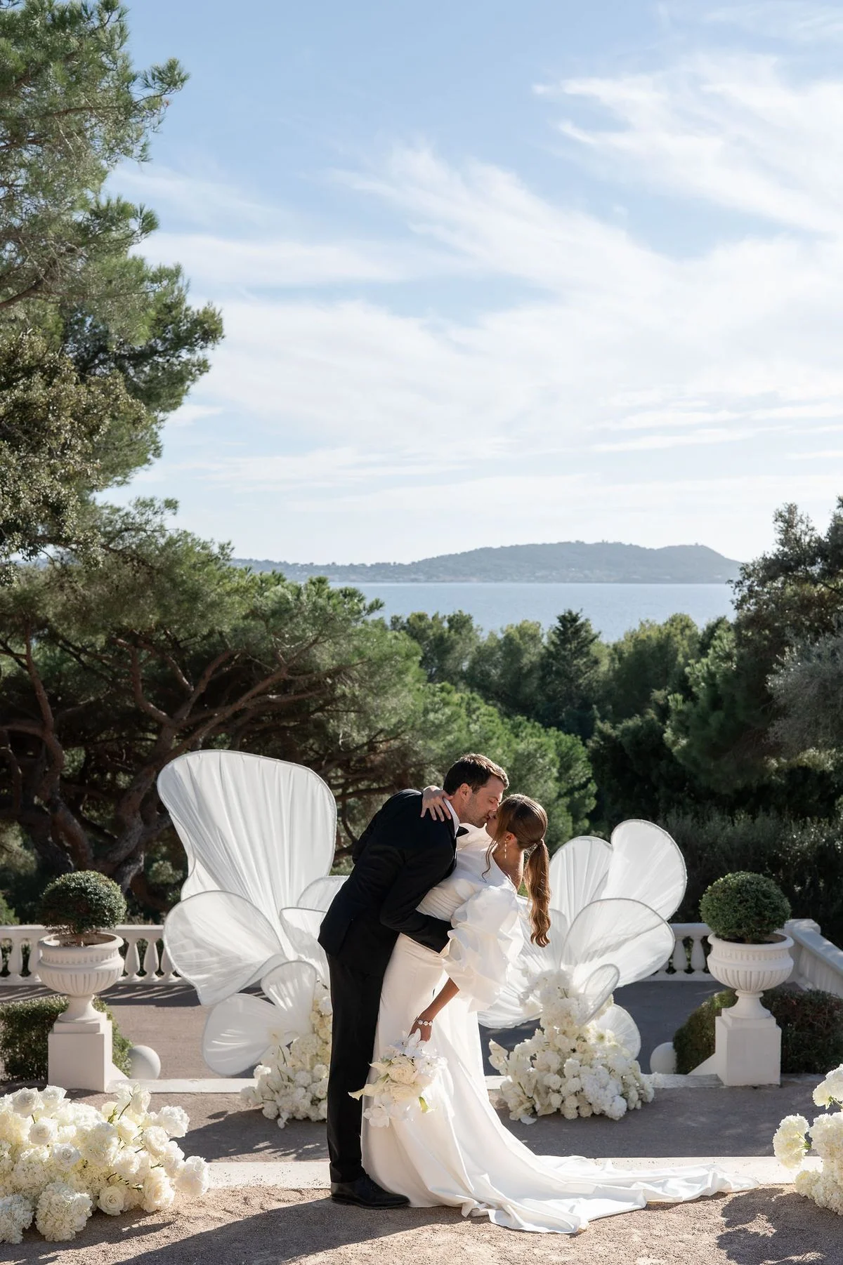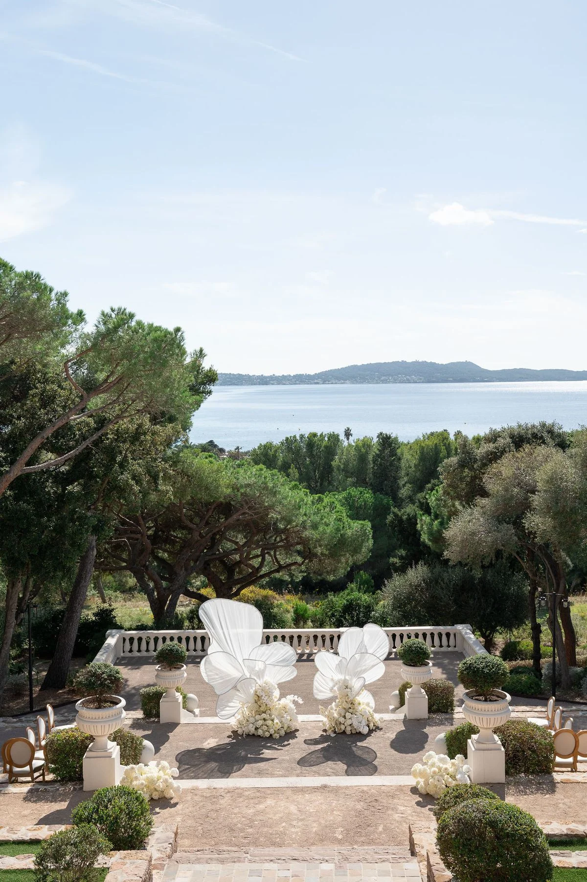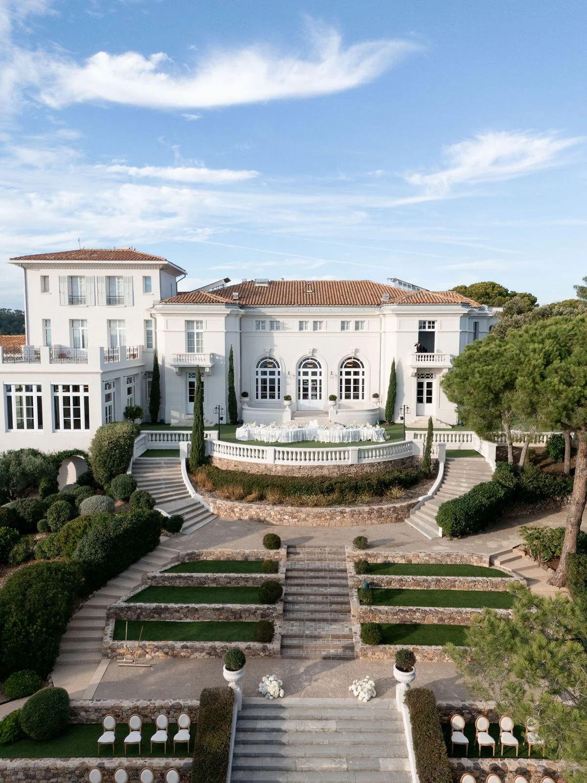 “Initialement construit en 1900 en tant que maison de villégiature, le Castel Bay par sa localisation et son architecture incroyable a connu bien des aventures dans le monde de la haute couture, dans l’hôtellerie de luxe mais aussi dans la santé. Avec un décor naturel, presque sauvage, contrastant avec des éléments graphiques plus marqués, le blanc de la façade est une parfaite toile de fond à la féérie d’un mariage.”