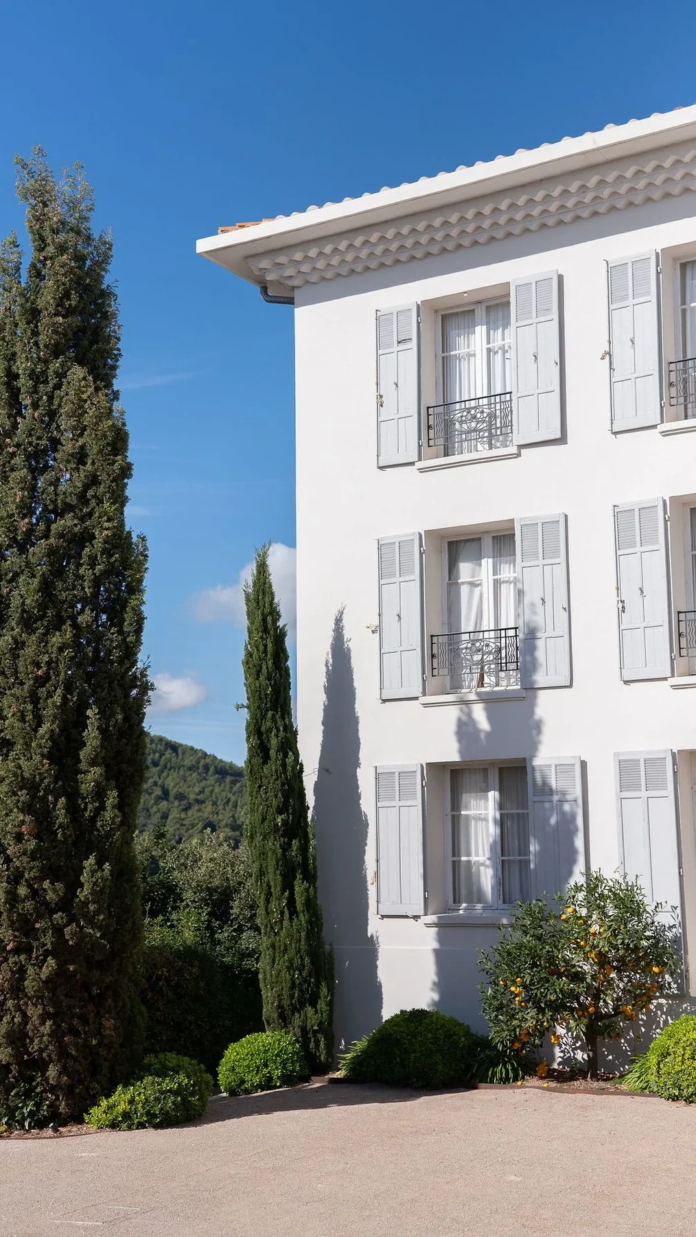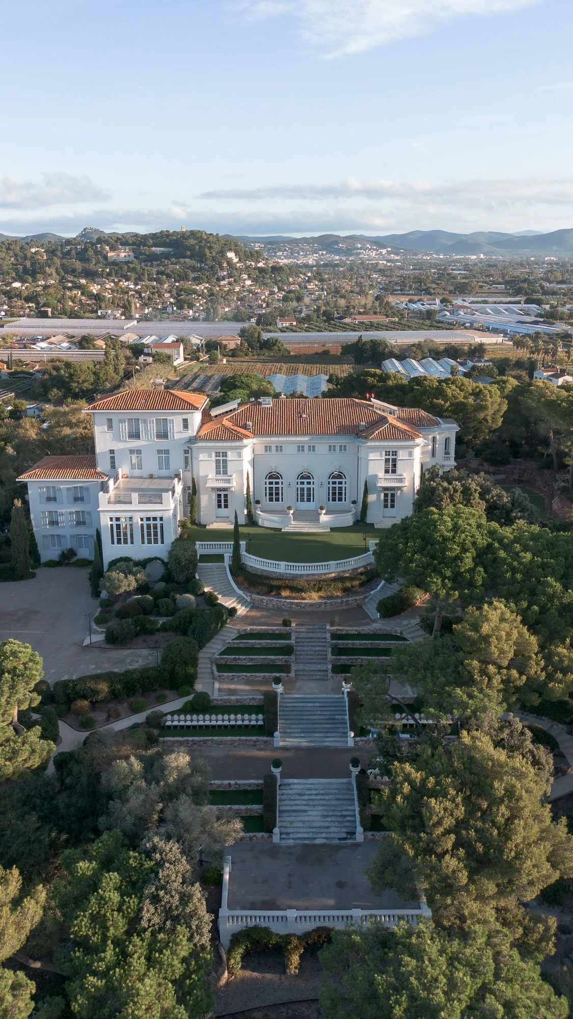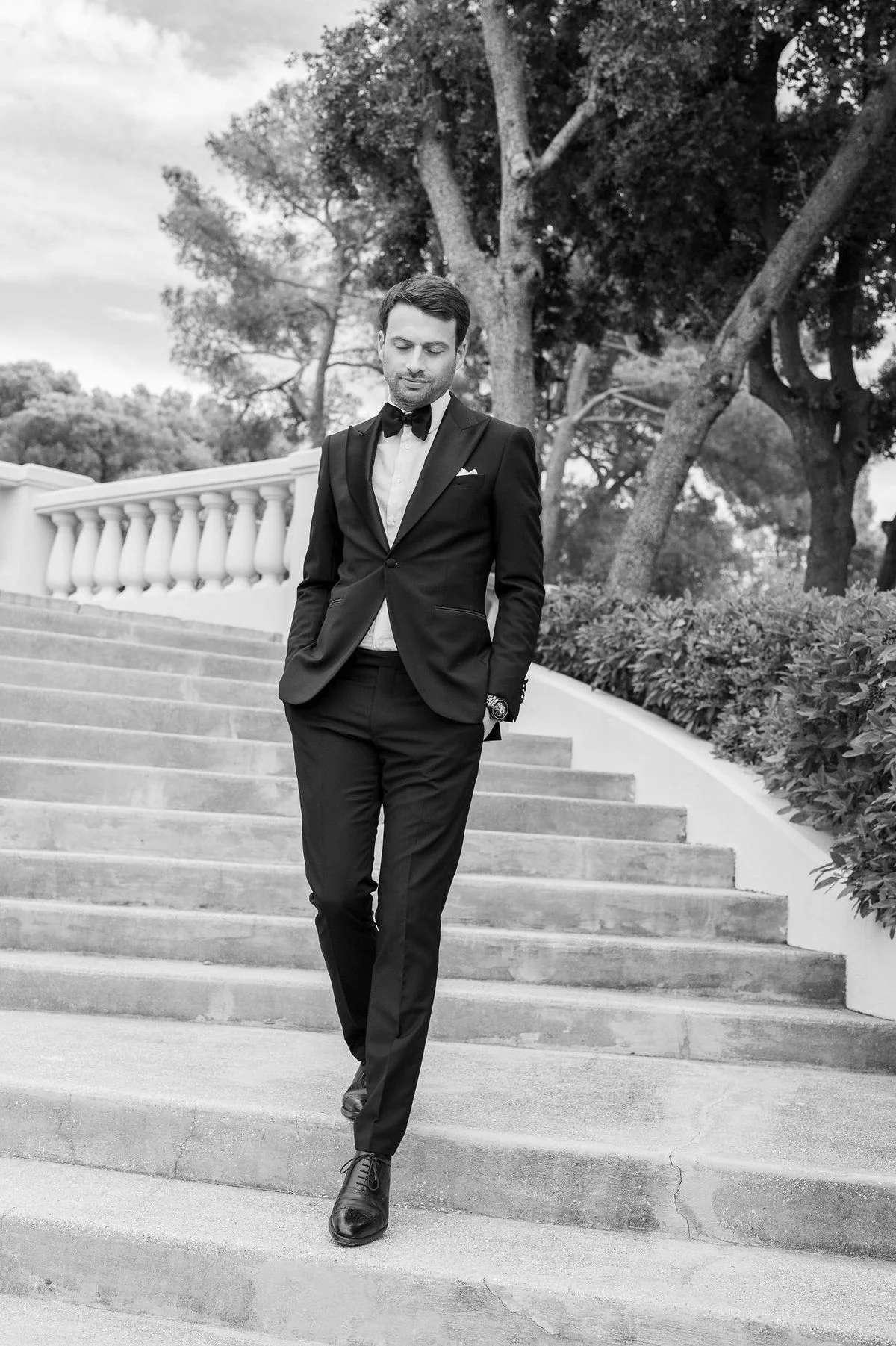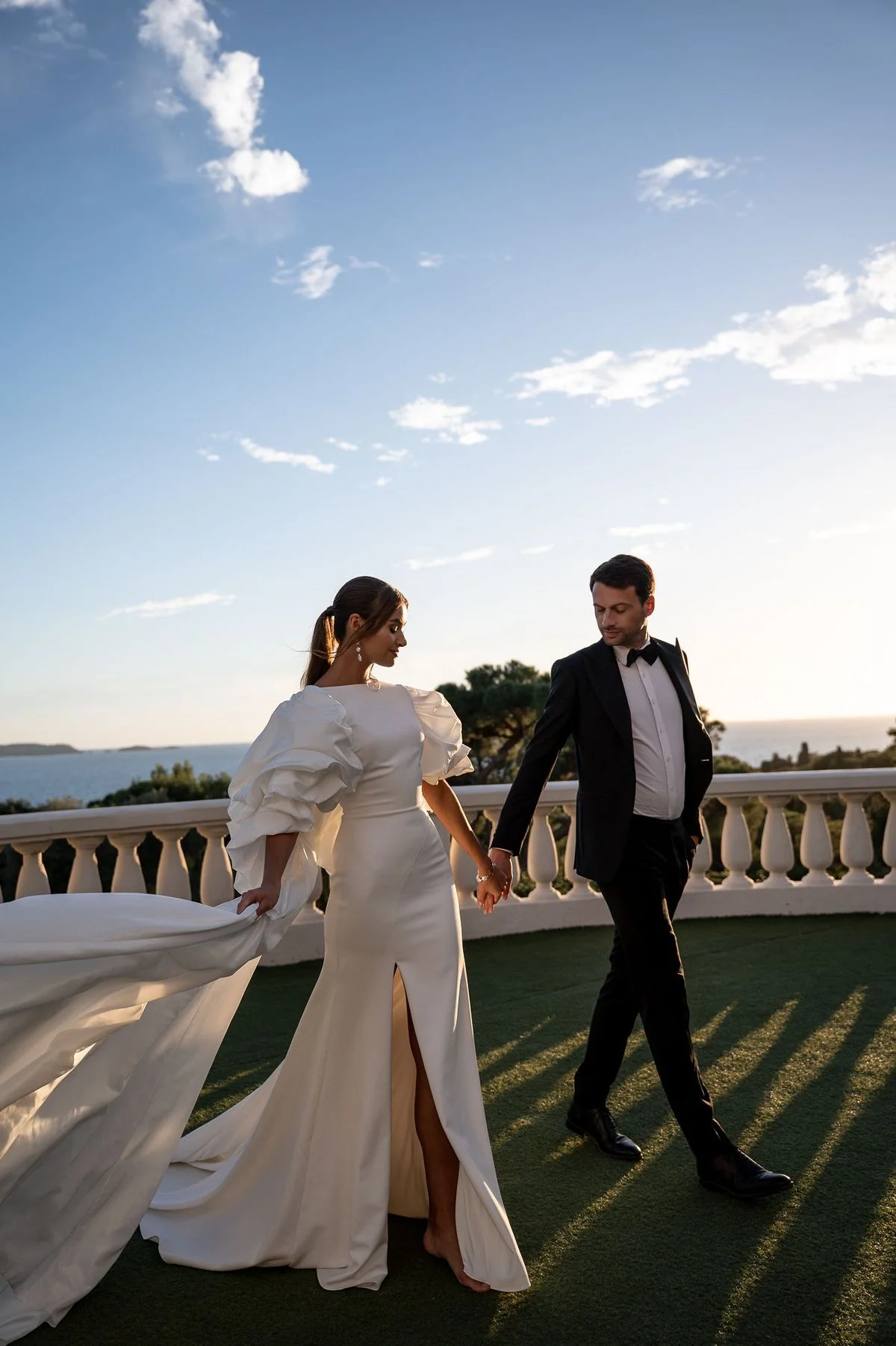 “Initialement construit en 1900 en tant que maison de villégiature, le Castel Bay par sa localisation et son architecture incroyable a connu bien des aventures dans le monde de la haute couture, dans l’hôtellerie de luxe mais aussi dans la santé. Avec un décor naturel, presque sauvage, contrastant avec des éléments graphiques plus marqués, le blanc de la façade est une parfaite toile de fond à la féérie d’un mariage.”