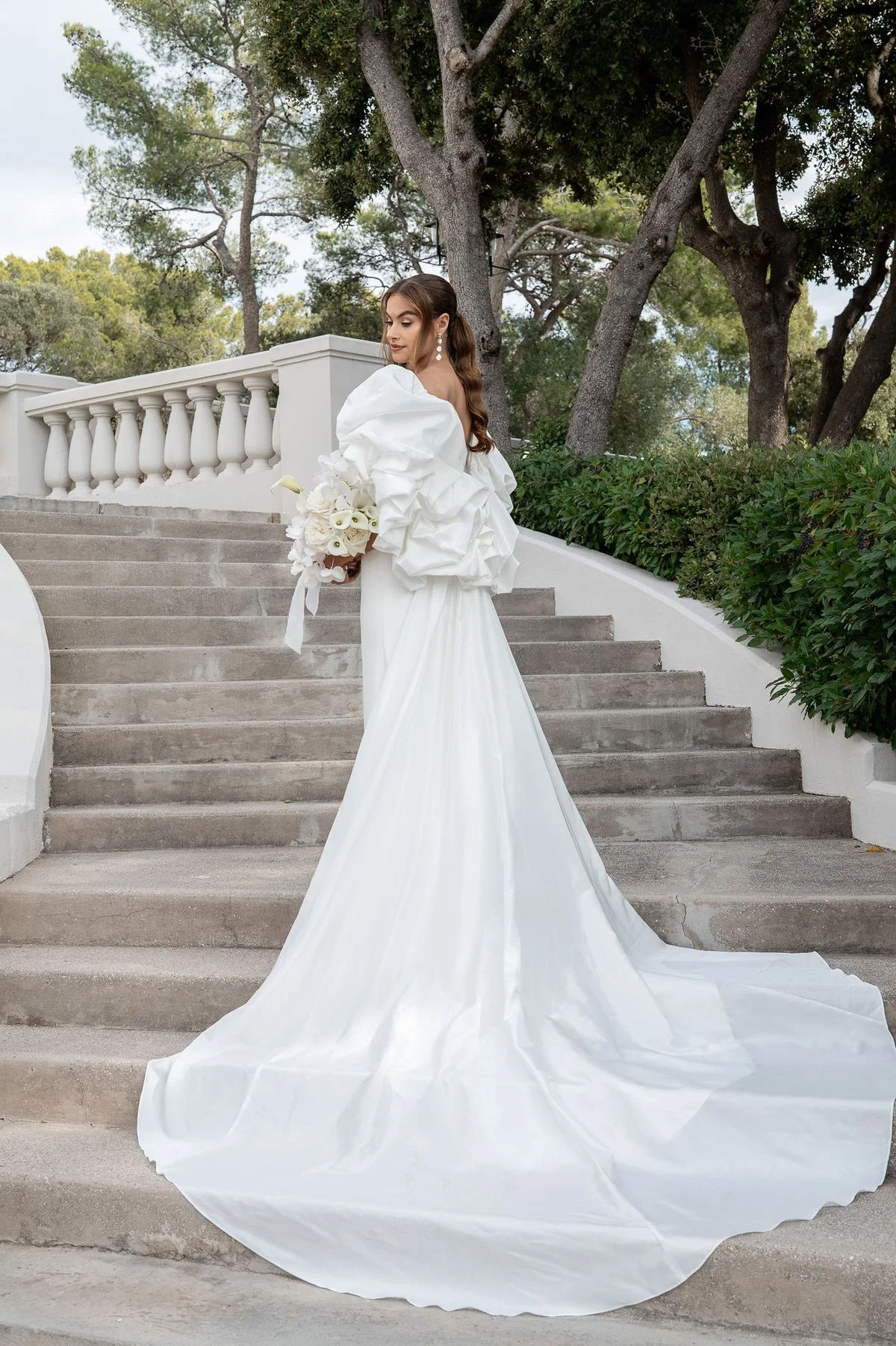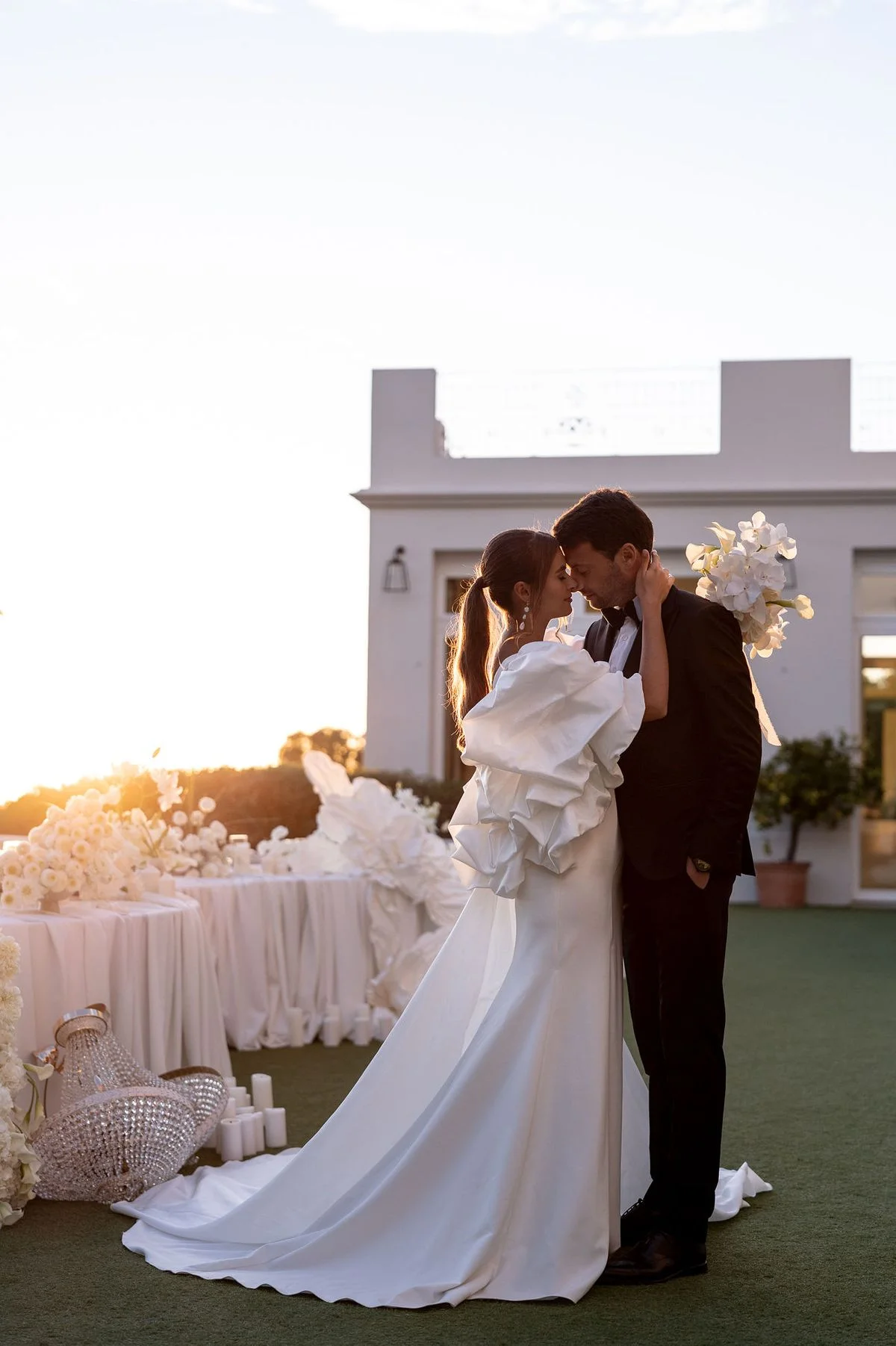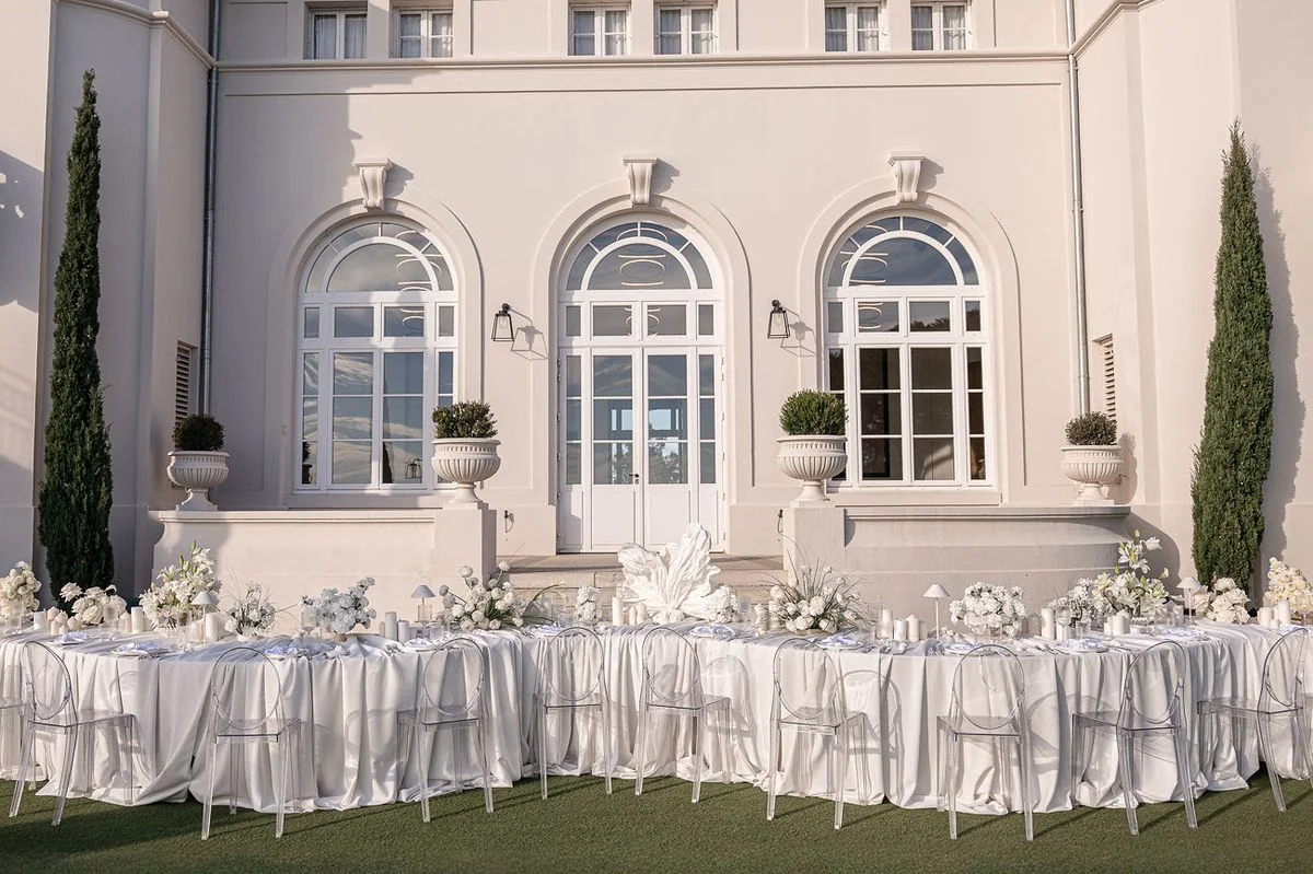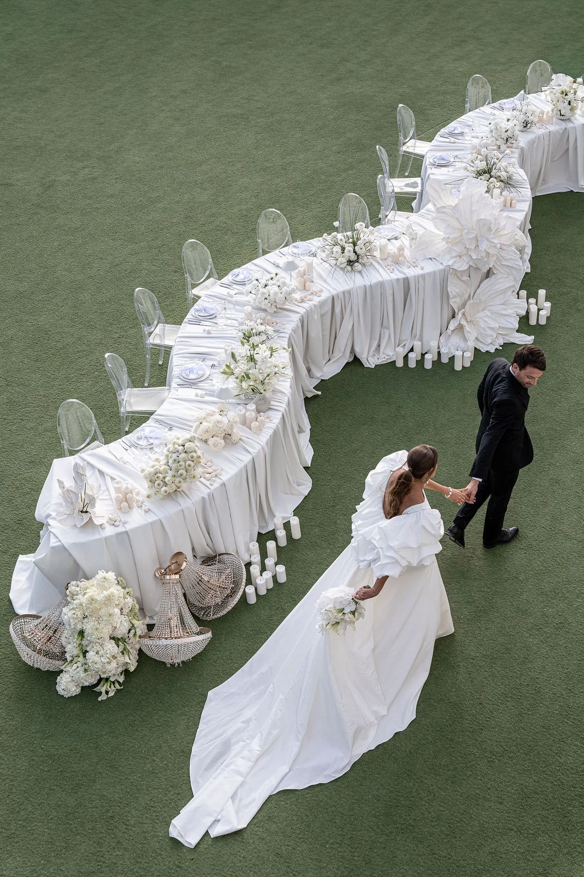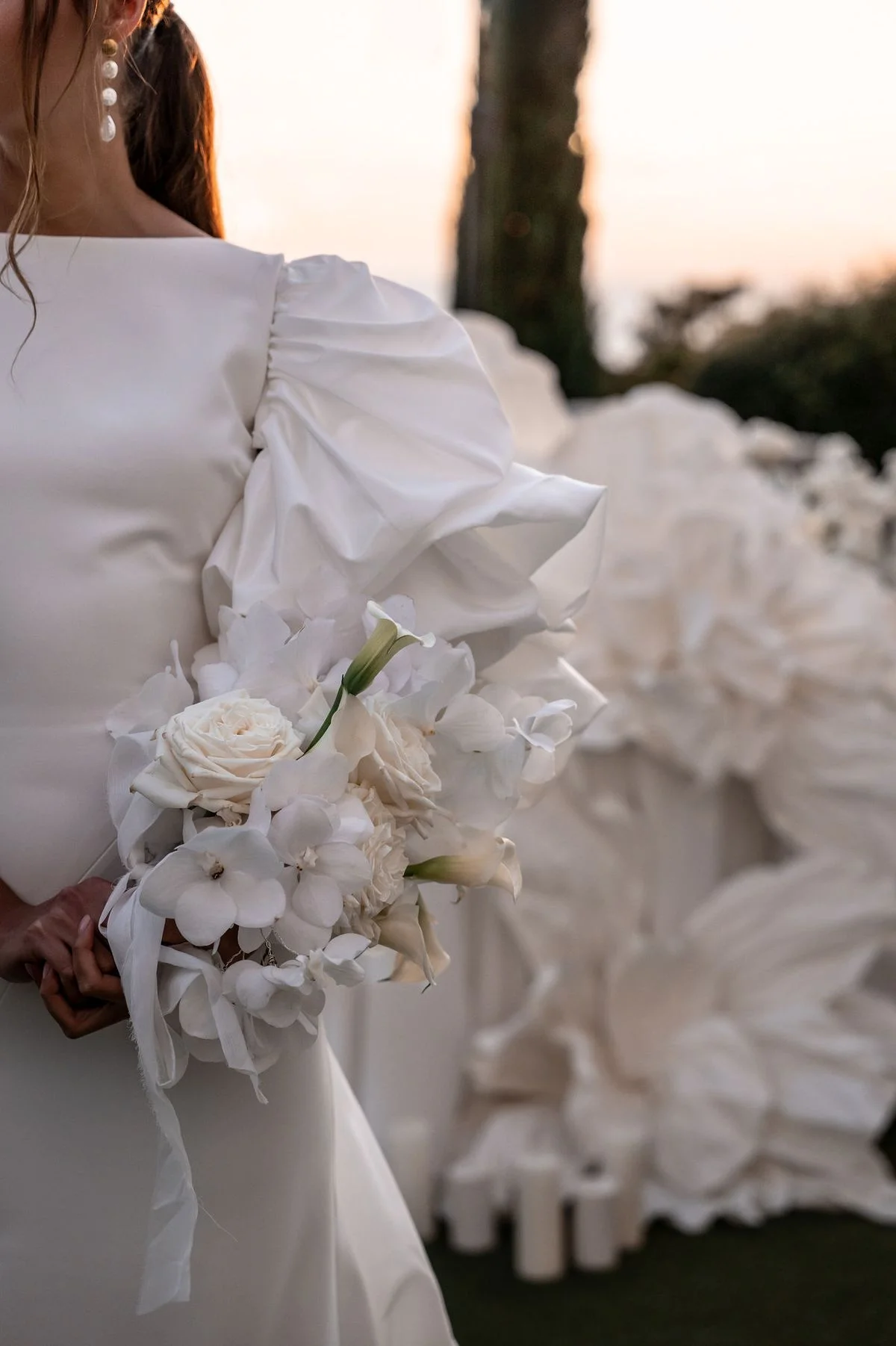 “Imaginez une demeure d’exception ancrée dans la roche et surplombant la mer, où la lumière douce du soleil se mêle aux textures légères et aériennes des éléments, tout en marquant des graphismes et des courbes avec affirmation. Un harmonieux monochrome blanc rehaussé d’une pointe de vert porte une ode à la nature avec modernité et minimalisme, tout en y mêlant la poésie de l’univers du mariage d’une élégance subtile et délicate.