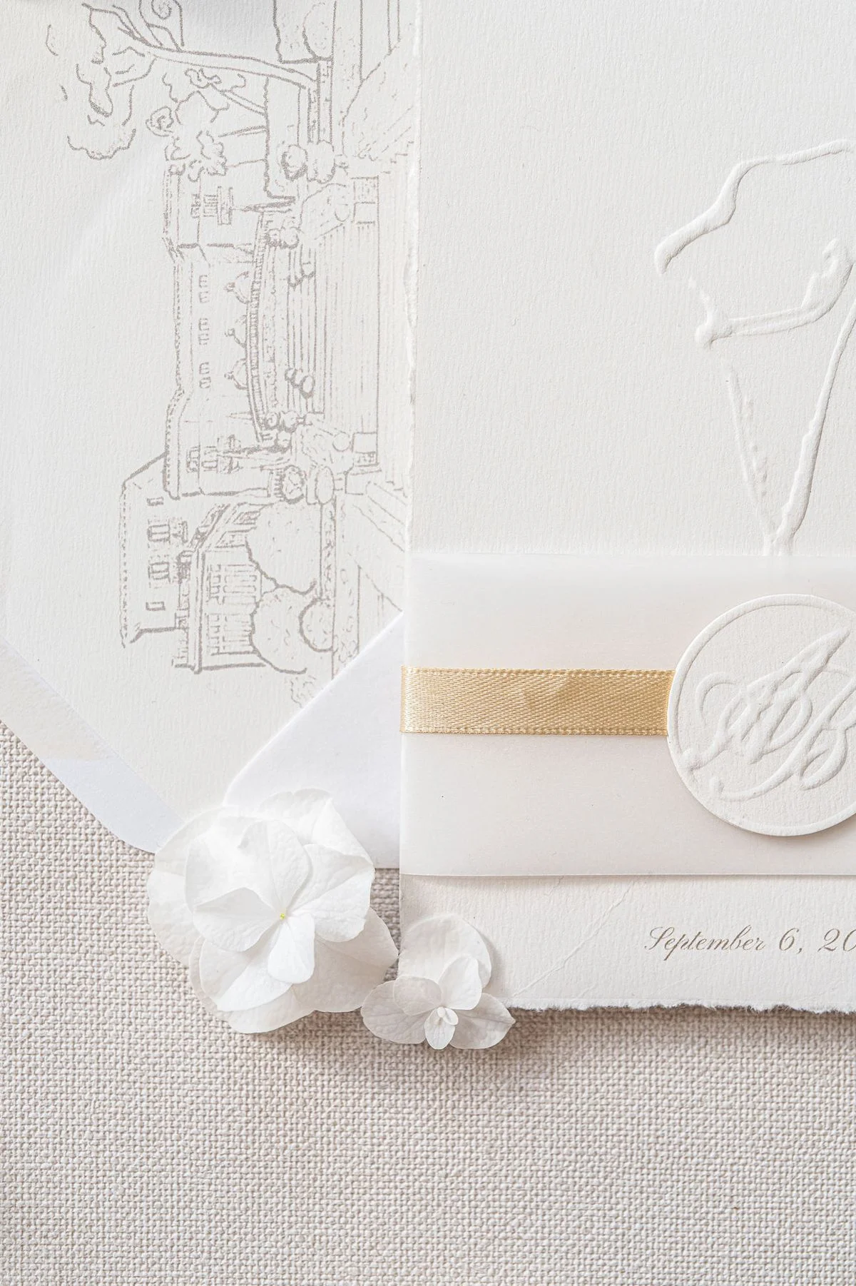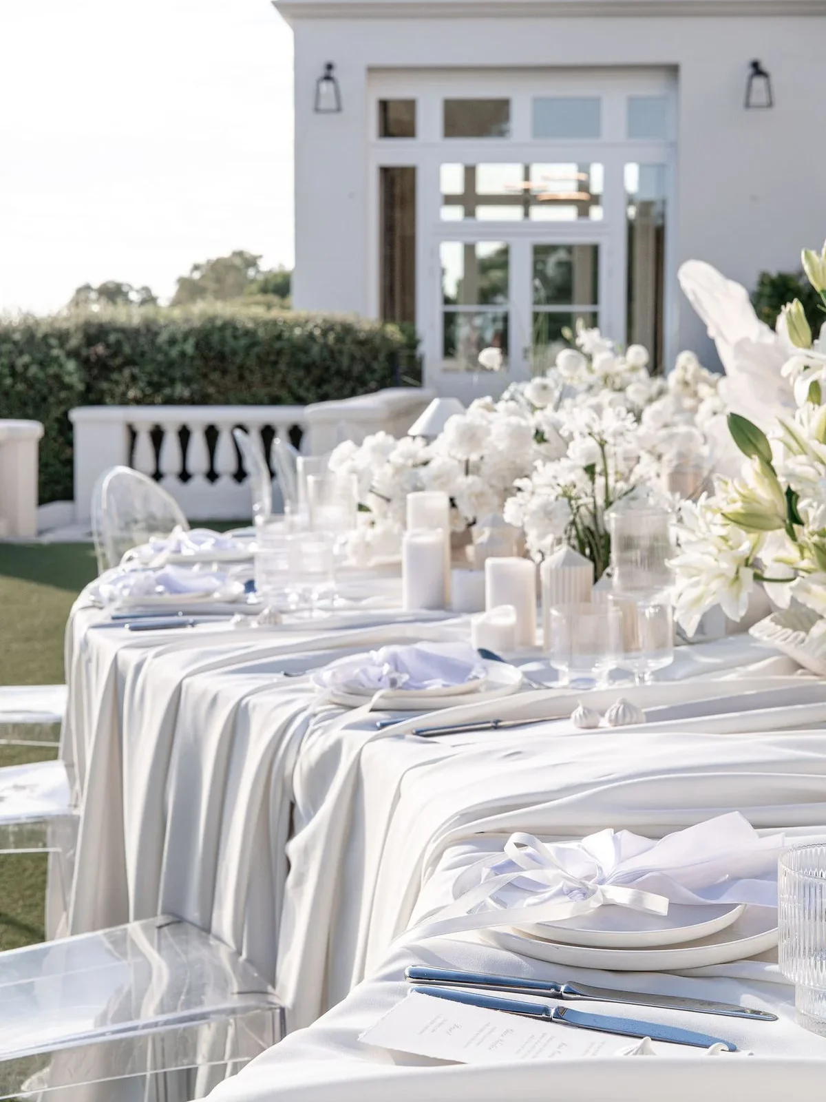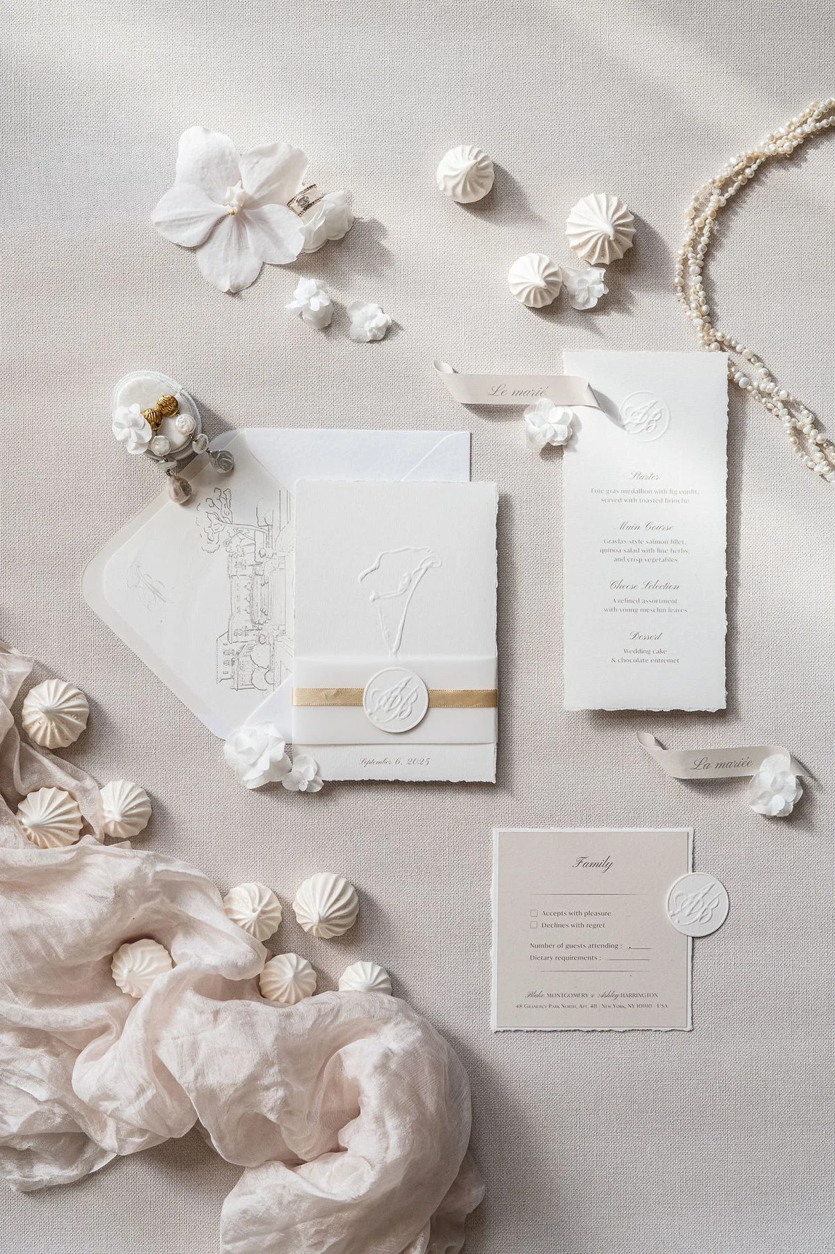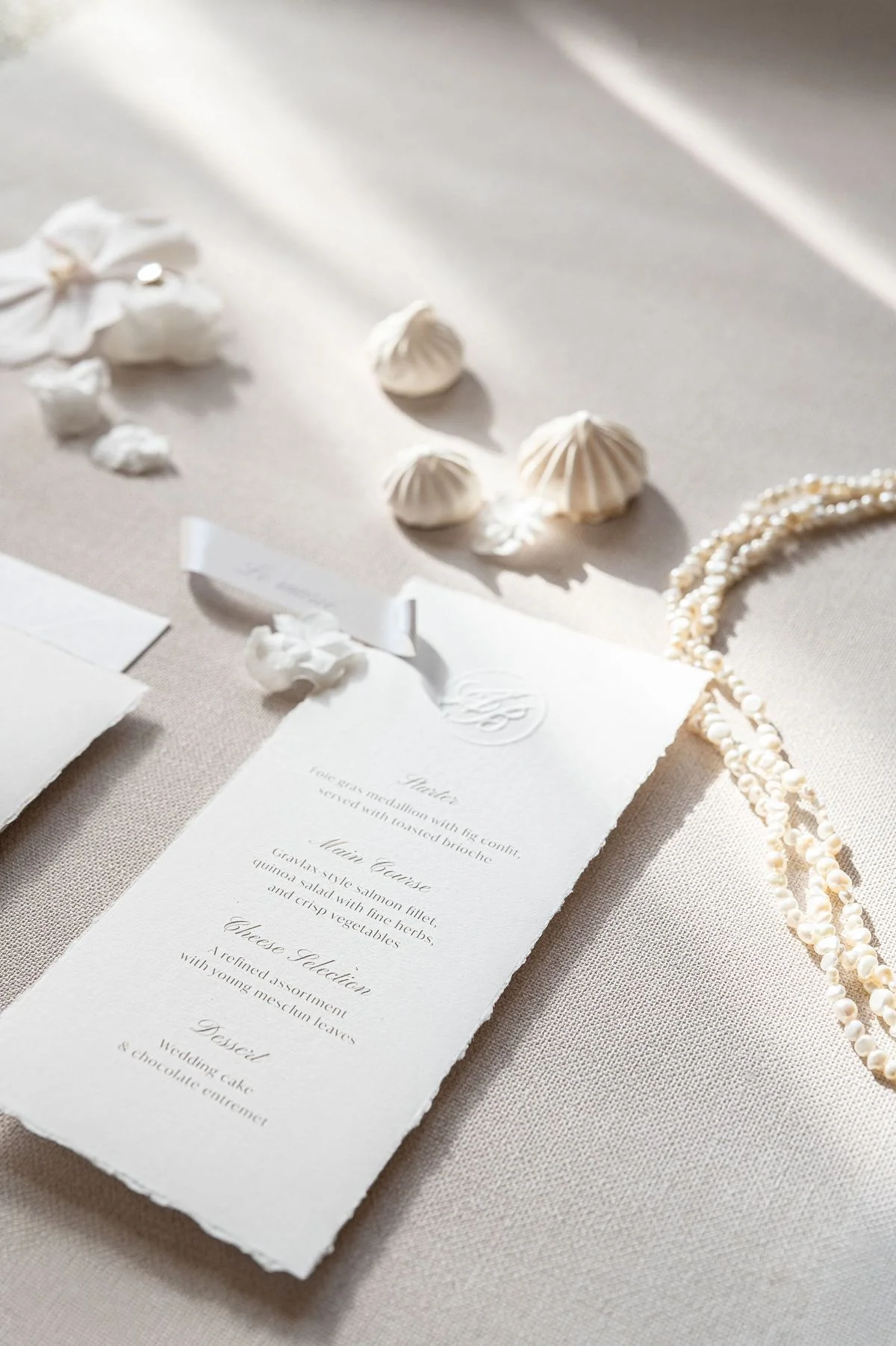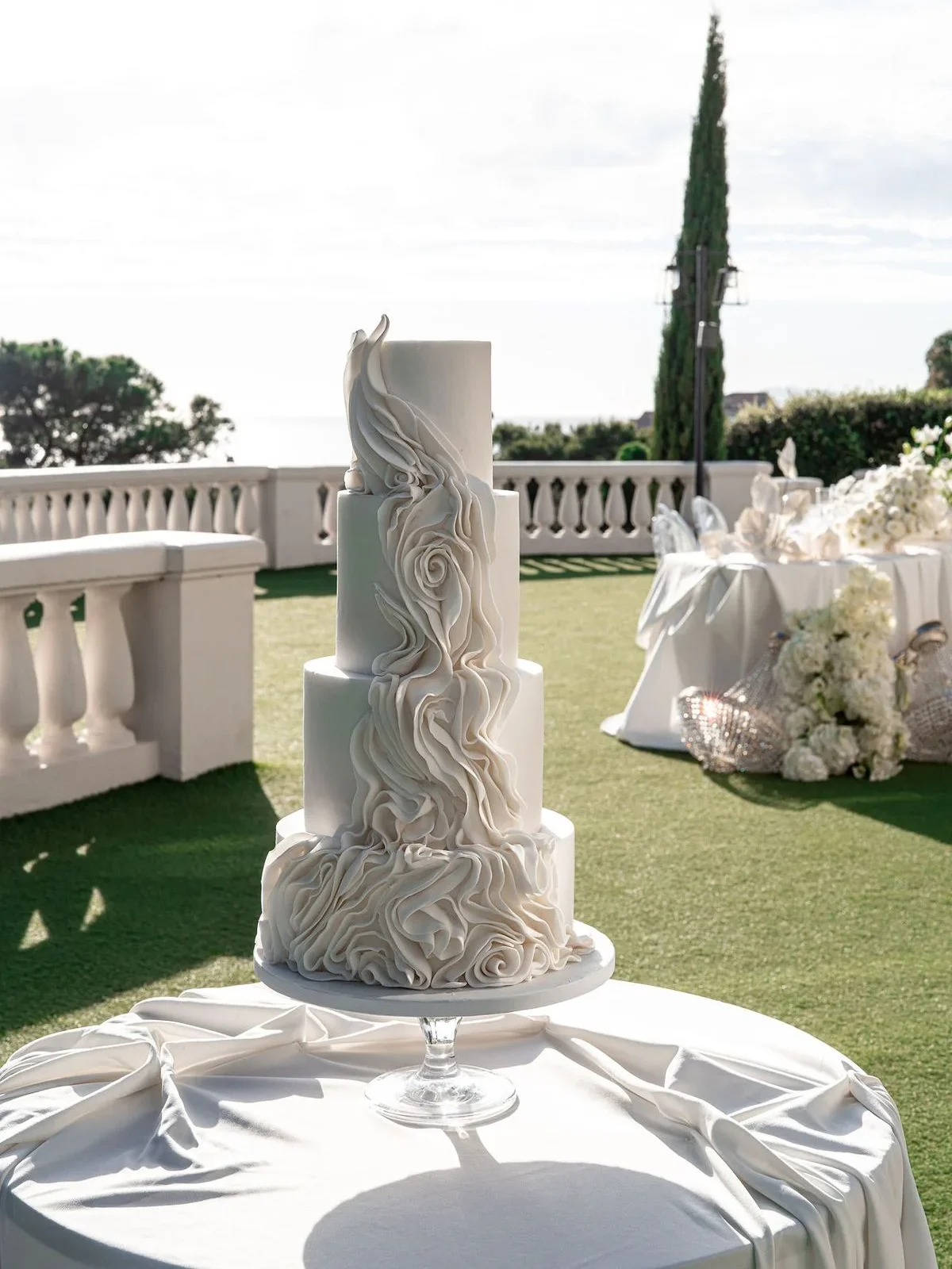 “Imaginez une demeure d’exception ancrée dans la roche et surplombant la mer, où la lumière douce du soleil se mêle aux textures légères et aériennes des éléments, tout en marquant des graphismes et des courbes avec affirmation. Un harmonieux monochrome blanc rehaussé d’une pointe de vert porte une ode à la nature avec modernité et minimalisme, tout en y mêlant la poésie de l’univers du mariage d’une élégance subtile et délicate.