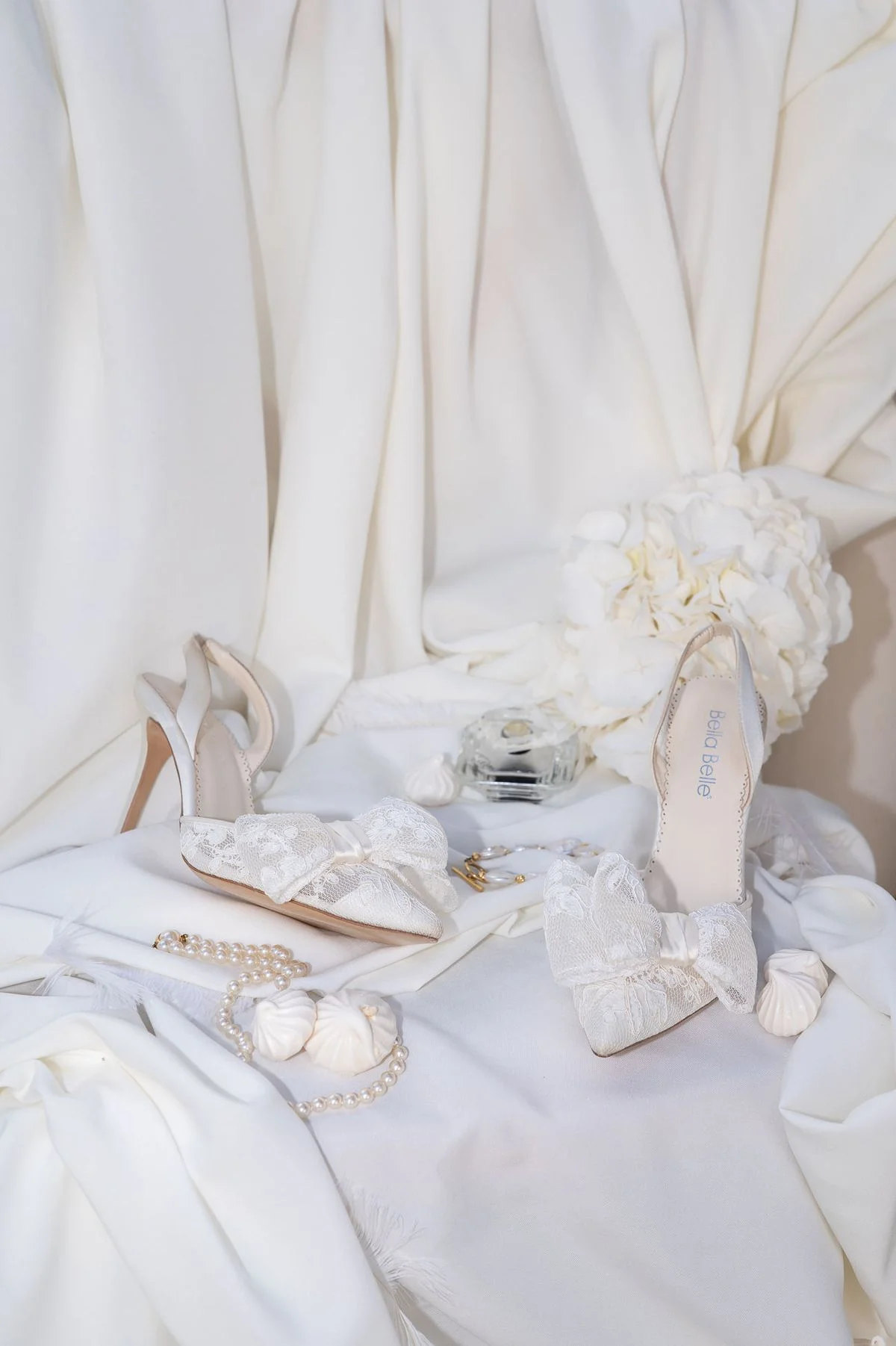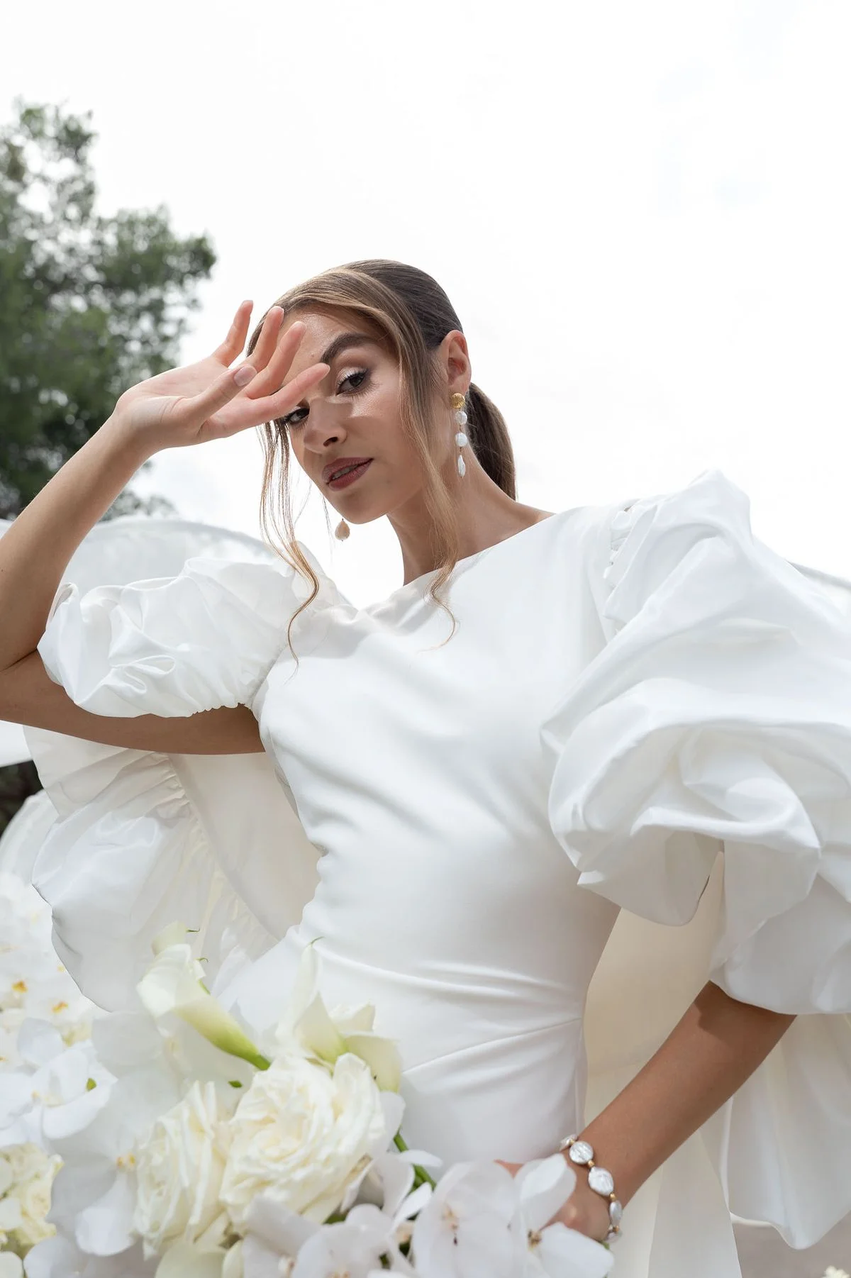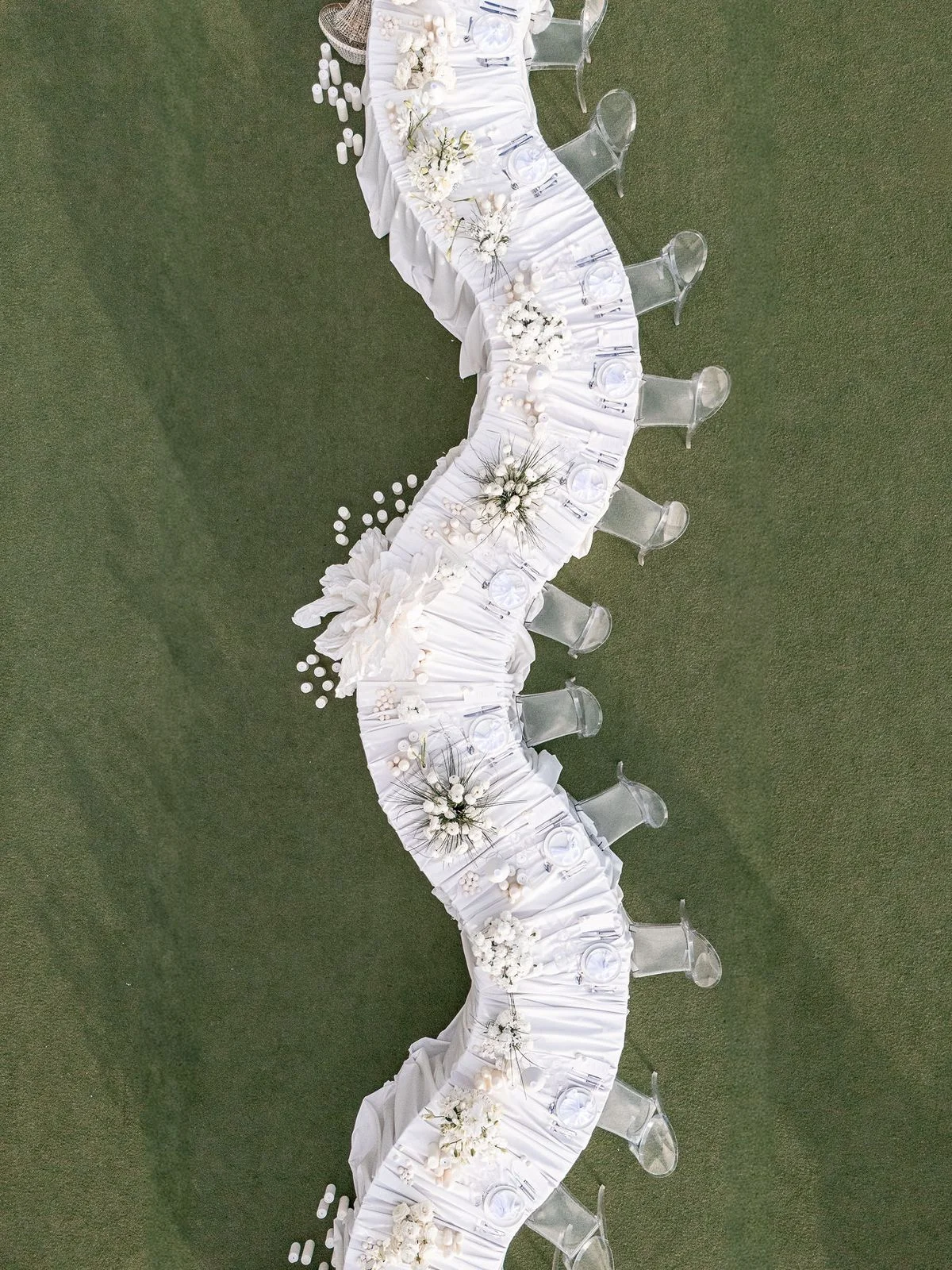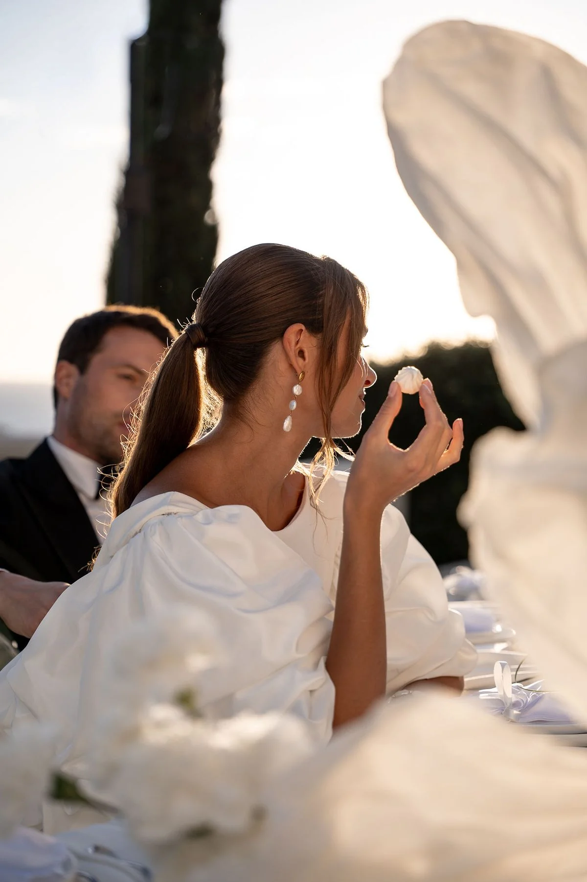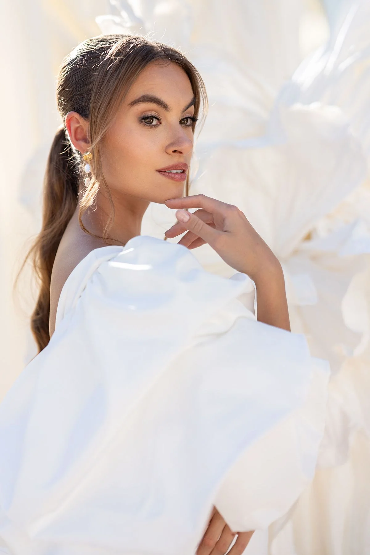 “La meringue blanche, symbole de pureté et de douceur, a été mise à l’honneur tout au long du projet. Ce monochrome blanc crée une esthétique minimaliste où chaque détail, chaque texture, devient essentiel. Des tissus fins et translucides, évoquant la meringue, se fondent dans le paysage, créant une harmonie visuelle à la fois moderne et intemporelle. Le volume et le graphisme de la meringue est également présent sur de nombreux plans, notamment dans le choix de la robe avec des manches élégantes et de caractère.”
