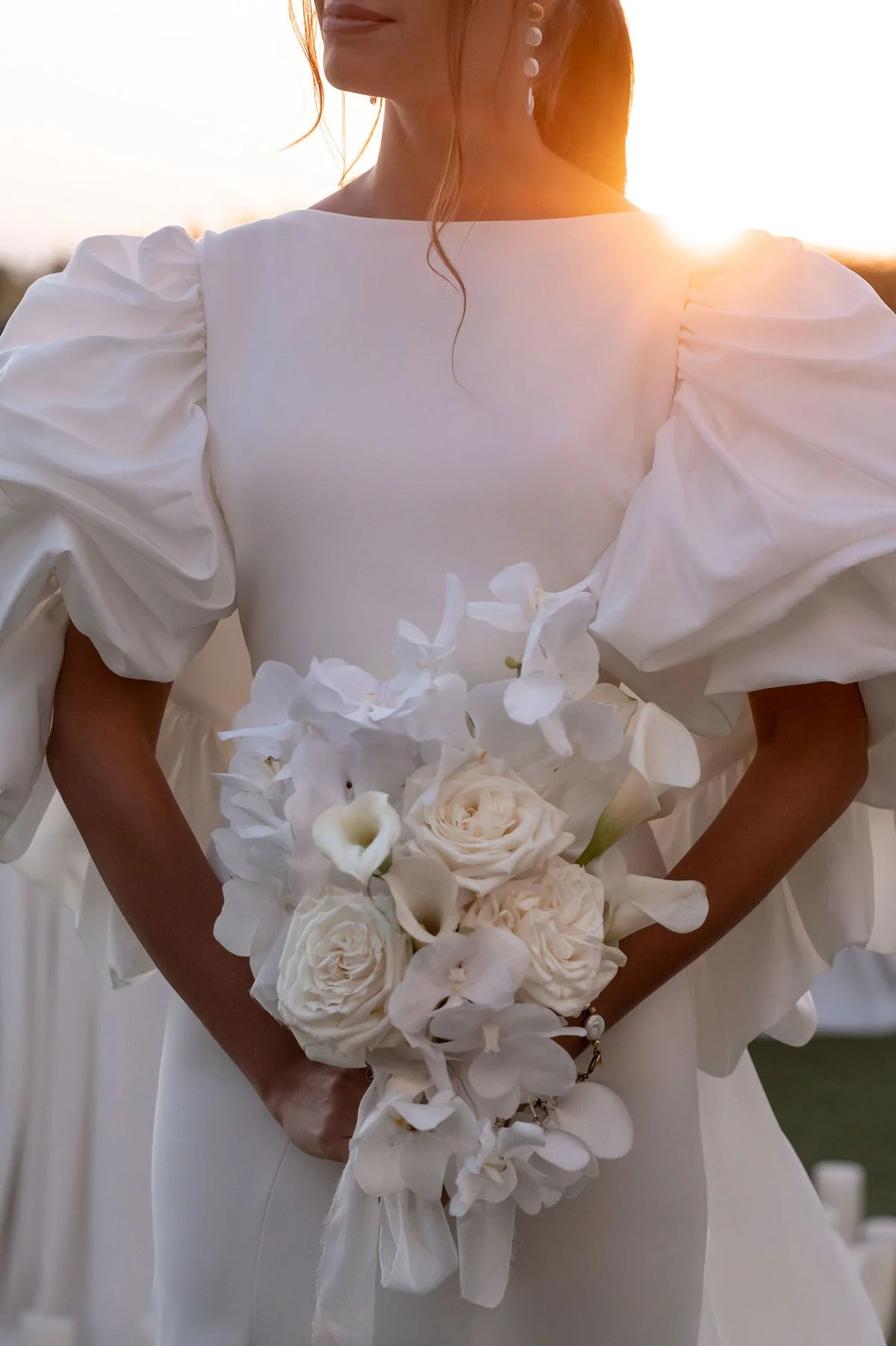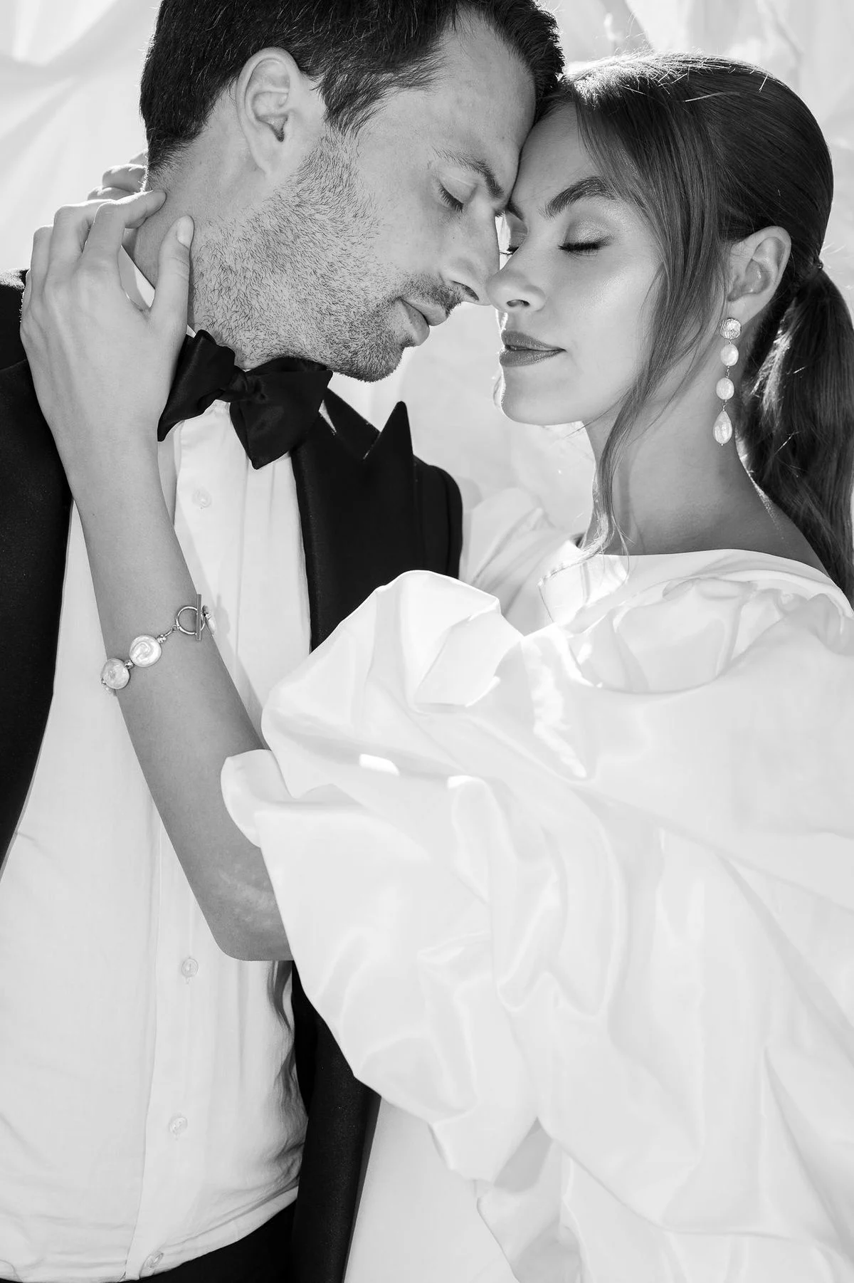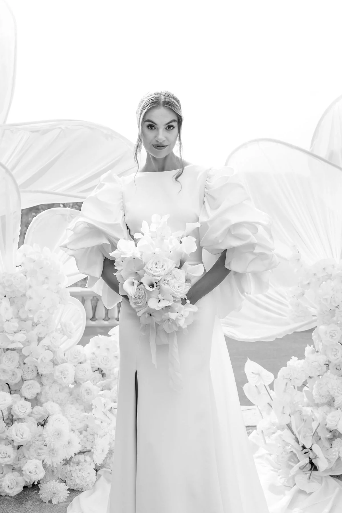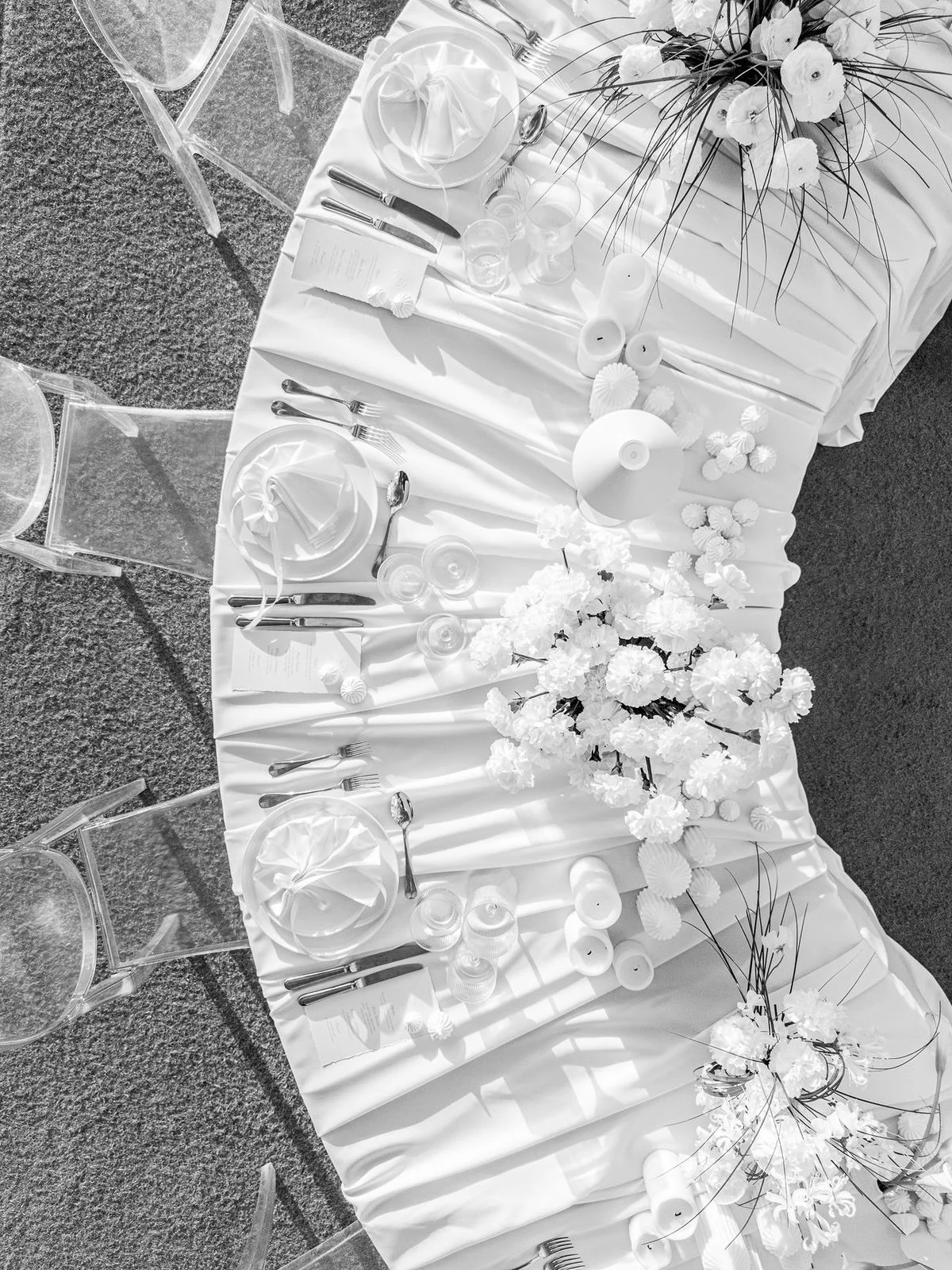 “L’utilisation des voiles légers, des structures minimalistes ou des éléments floraux translucides ont permis de capter la lumière naturelle, créant des jeux d’ombres et de reflets subtils. Ces effets, notamment à travers la profondeur de champ ou les textures, m’ont permis de rendre les photos à la fois vaporeuses et nettes, tout en mettant en valeur la simplicité et la grâce des mariés. Les compositions florales, souvent asymétriques et fluides, s’intègrent parfaitement à l’univers minimaliste, tout en apportant richesse et texture au cadre photographique.