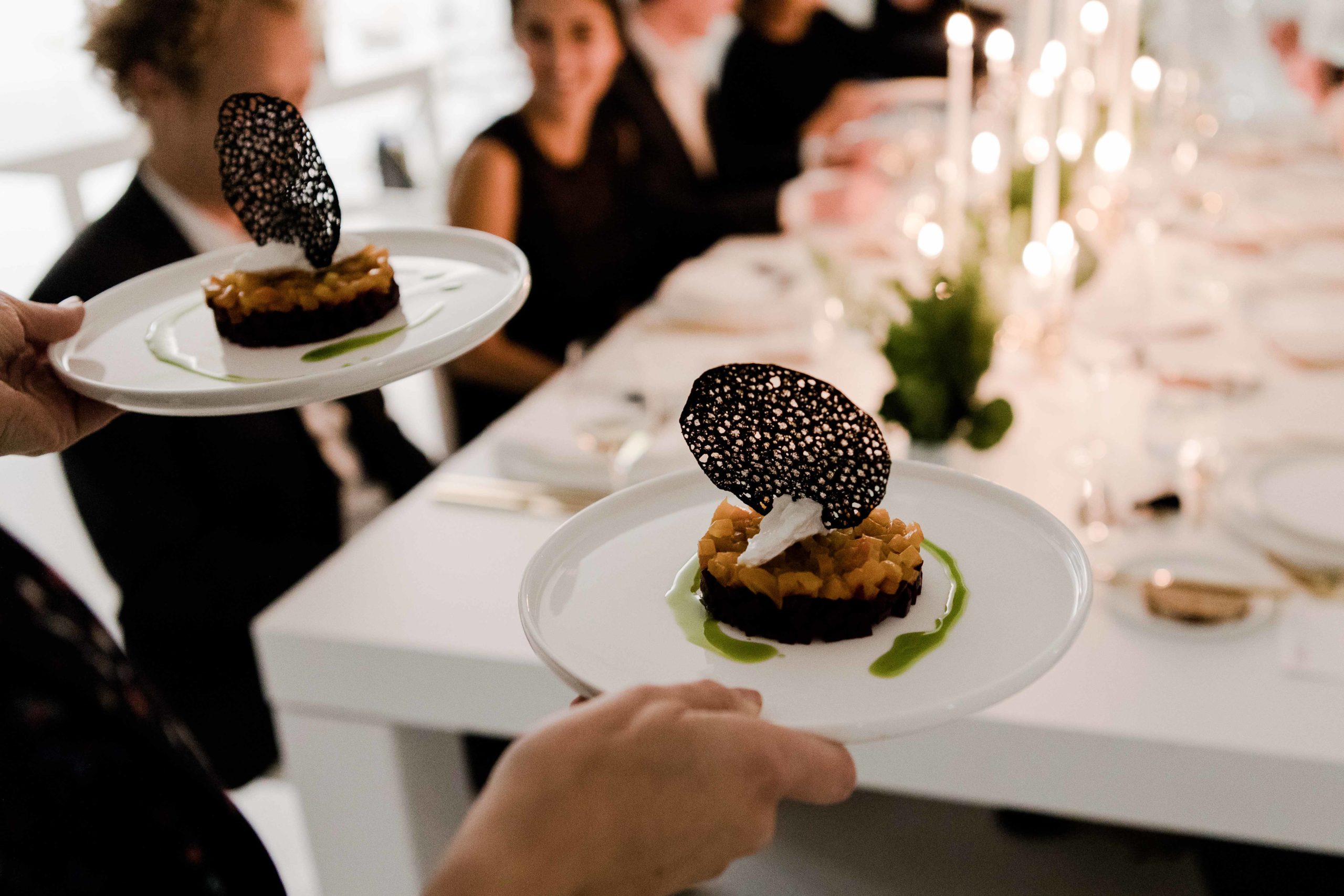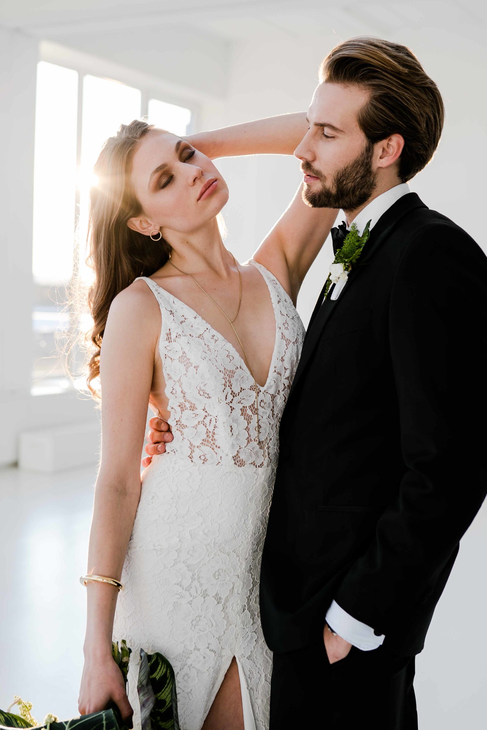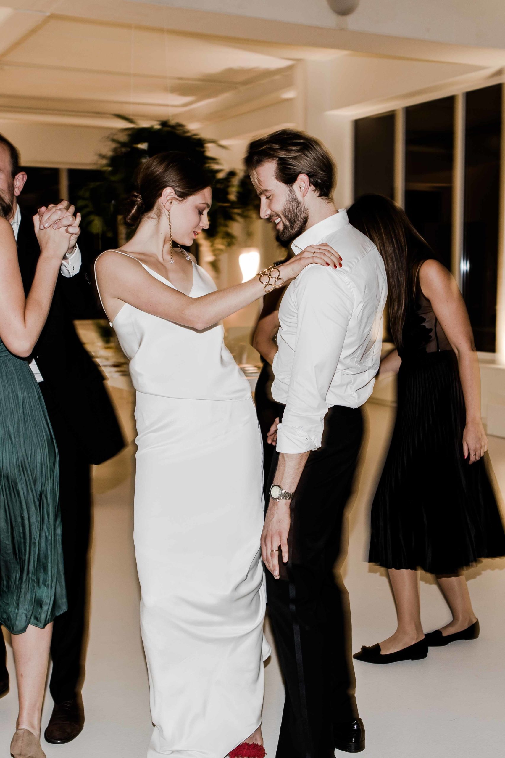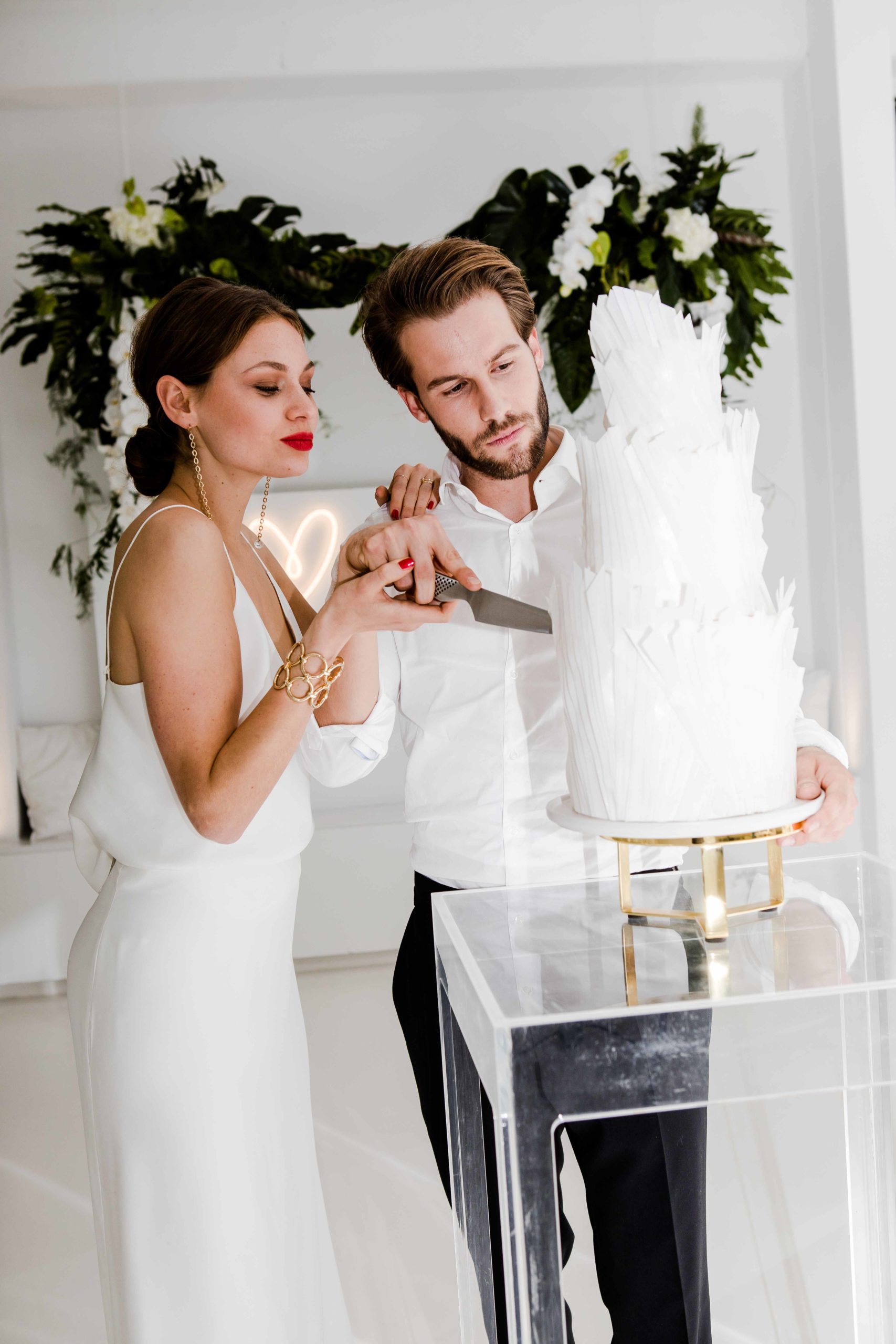 “Ils célèbrent leur mariage dans un style minimaliste et contemporain. Simpliste, mais pas simple. Sophistiqué et moderne. De haute qualité. Le lieu, avec son architecture blanche, procure assez d’espace pour développer un environnement urbain. Il n’y a que peu de choses qui peuvent distraire les jeunes mariés : des arrangements floraux d’un vert luxuriant et des notes de matières noires, dorées et rouges pures. Le couple se démarque.”