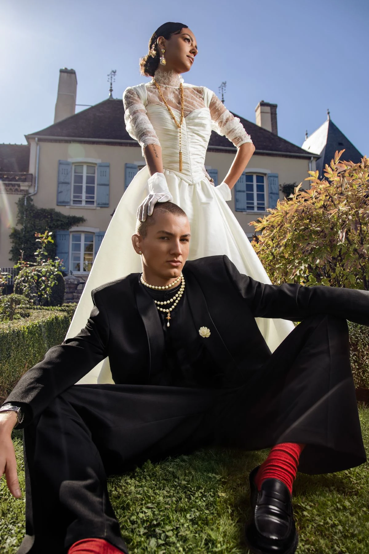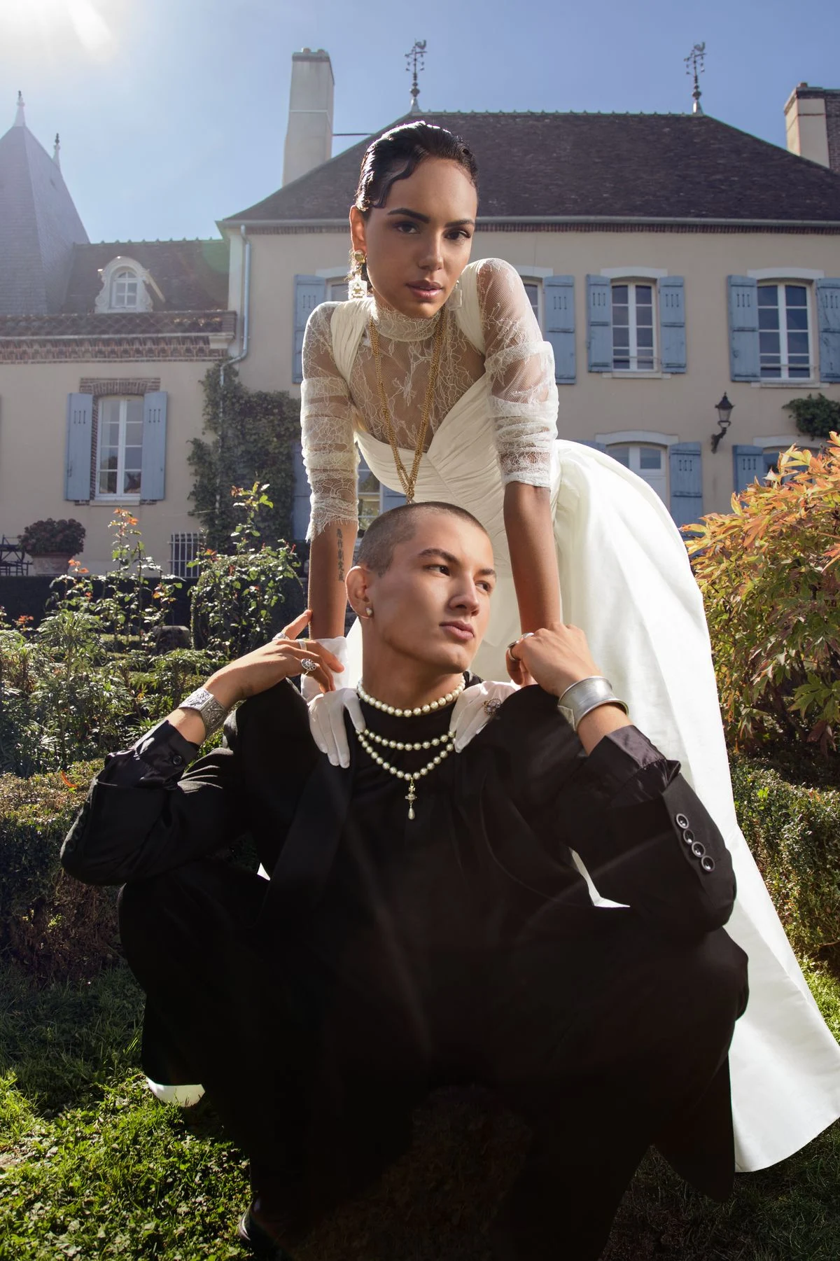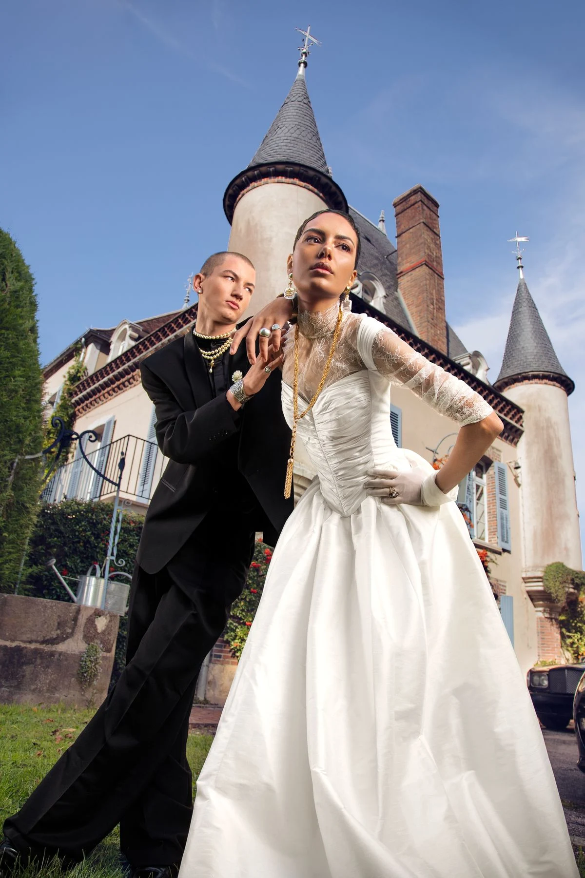 Les poses sont assumées, les silhouettes sculpturales, les détails pensés comme des signatures. Ce ne sont pas des mariés. Ce sont des icônes contemporaines. Des figures fortes, conscientes de leur présence, au cœur de leur propre narration.