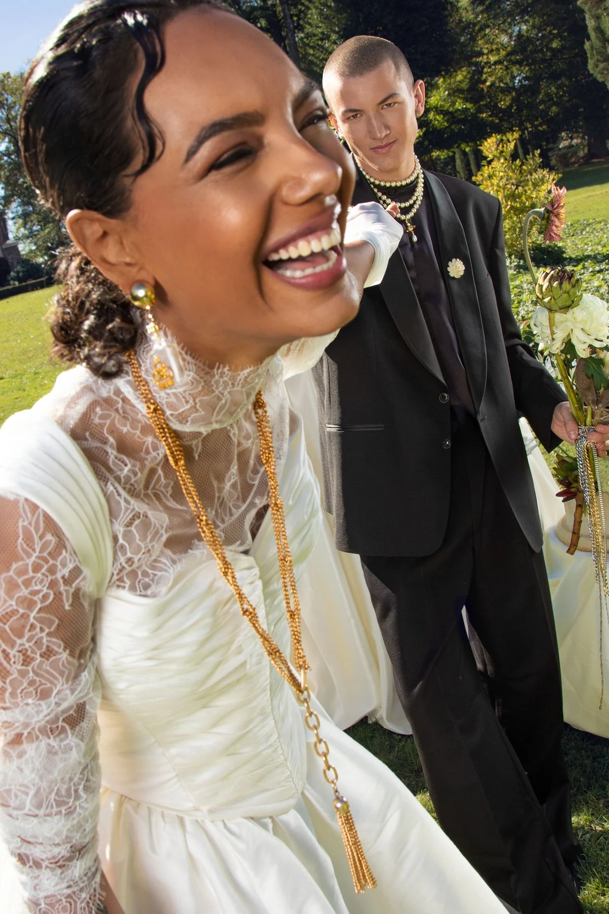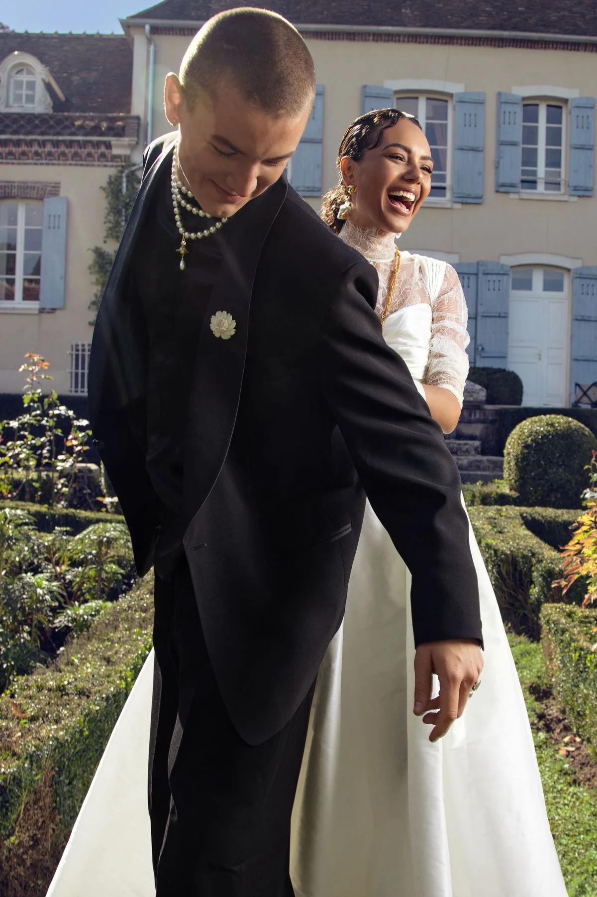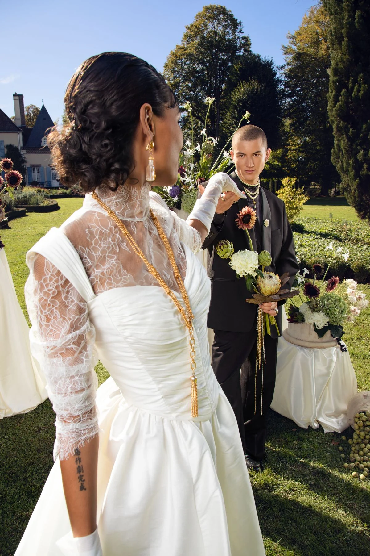 Les poses sont assumées, les silhouettes sculpturales, les détails pensés comme des signatures. Ce ne sont pas des mariés. Ce sont des icônes contemporaines. Des figures fortes, conscientes de leur présence, au cœur de leur propre narration.