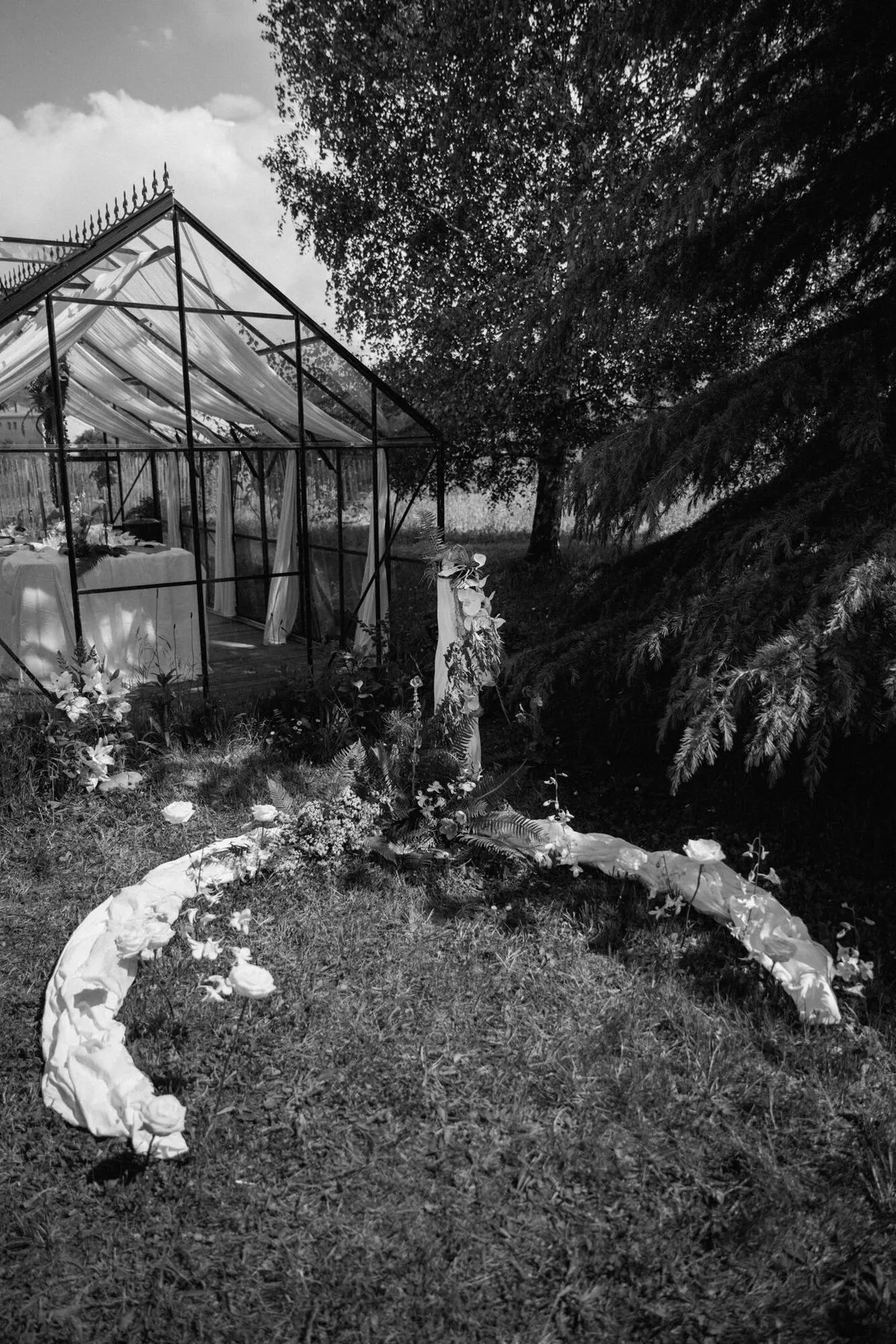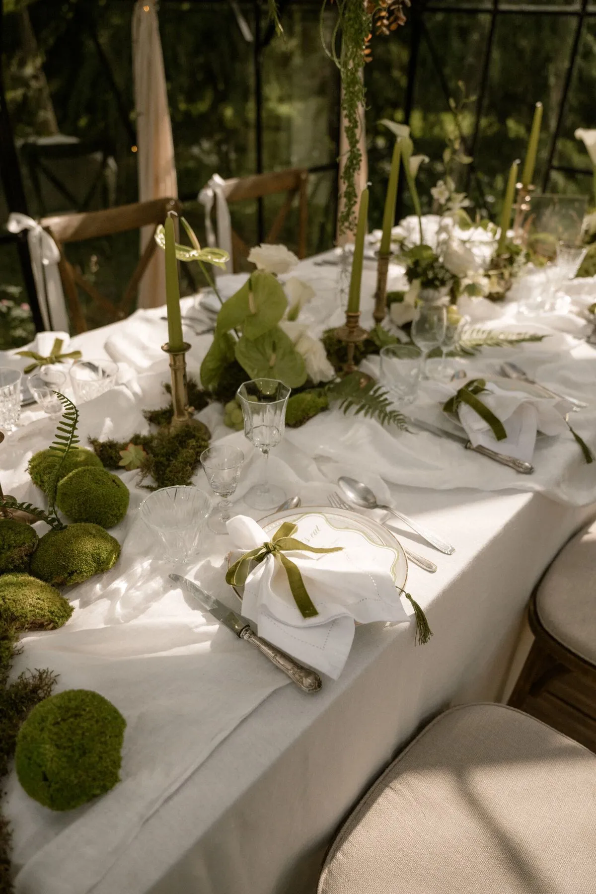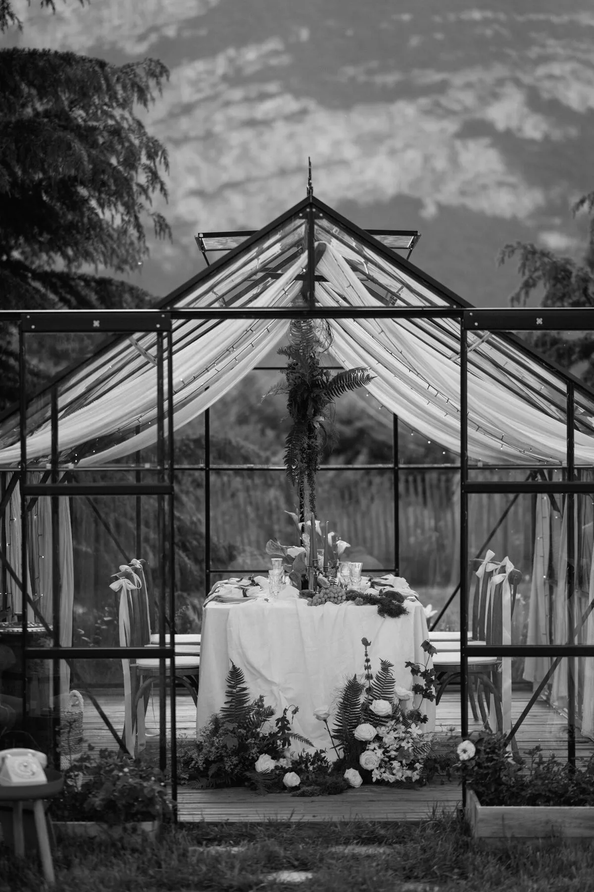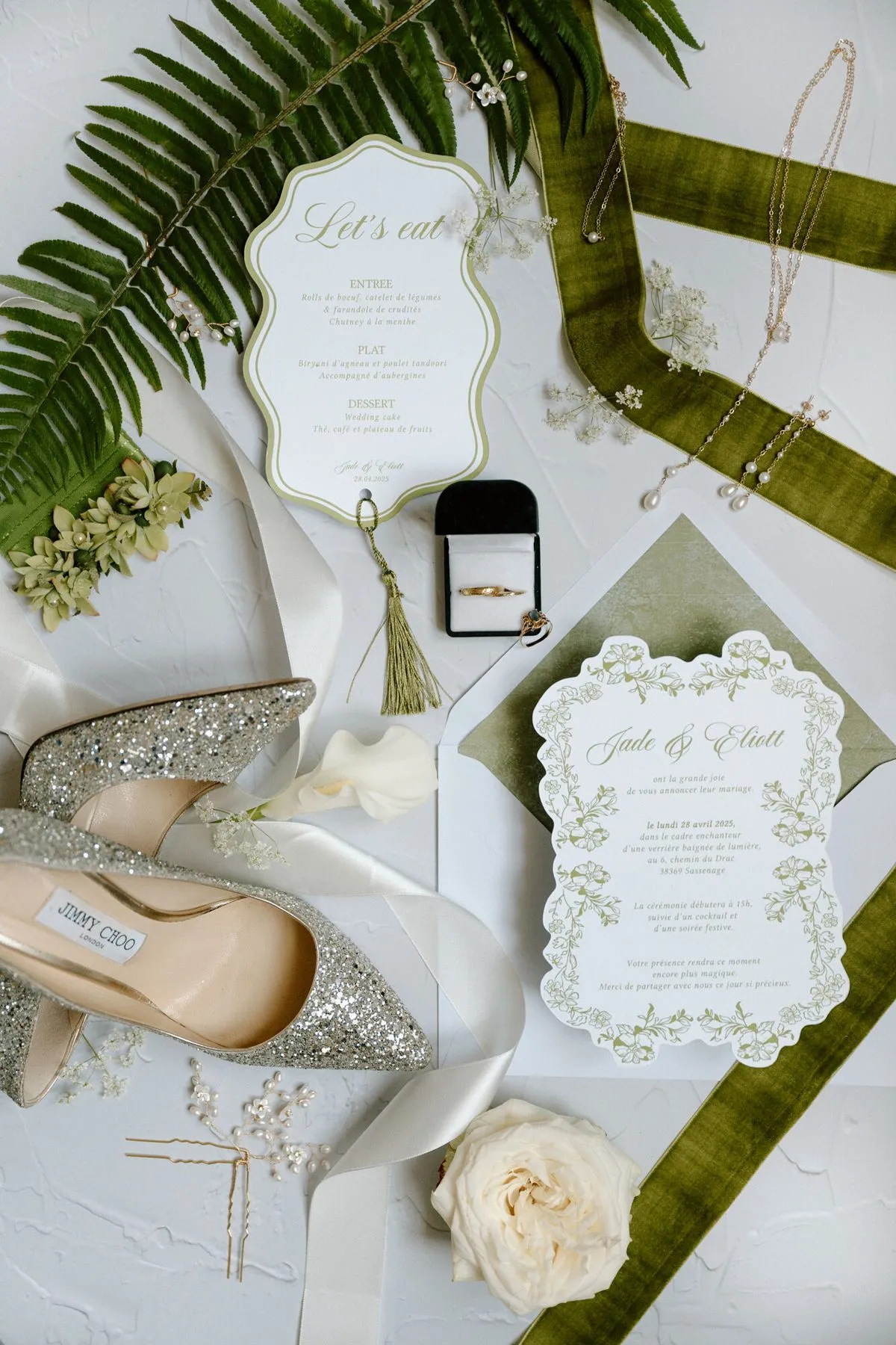 Ce shooting d’inspiration mariage intitulé Wedding Bliss, a été réalisé dans notre studio verrière situé aux portes de Grenoble. Ce lieu unique, baigné de lumière naturelle et entouré de champs, d’arbres et de montagnes, offre une vue imprenable sur les falaises du Vercors et de la Chartreuse. Nous avons souhaité y créer une ambiance moderne et chic, tout en mettant la nature au cœur de l’événement. Les tons verts lumineux choisis pour ce shooting s’harmonisent avec le décor naturel environnant, illustrant comment un mariage peut être à la fois élégant et profondément ancré dans son environnement.