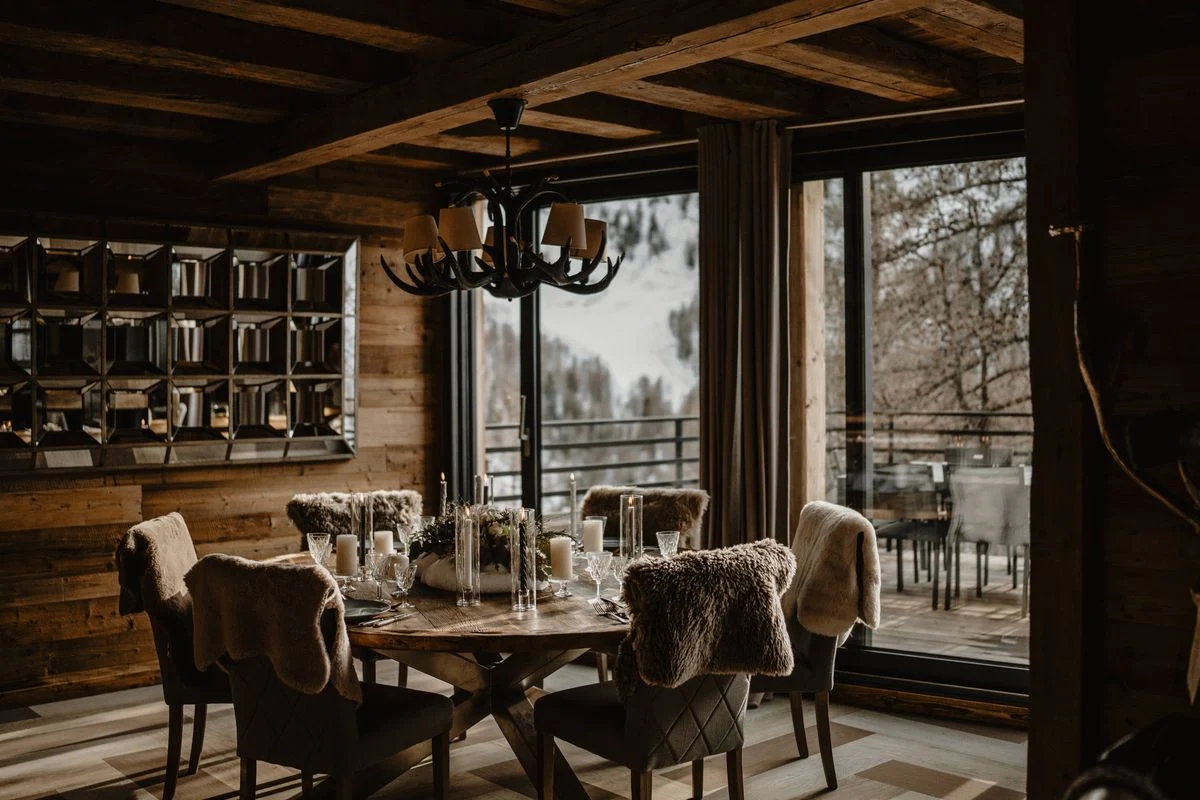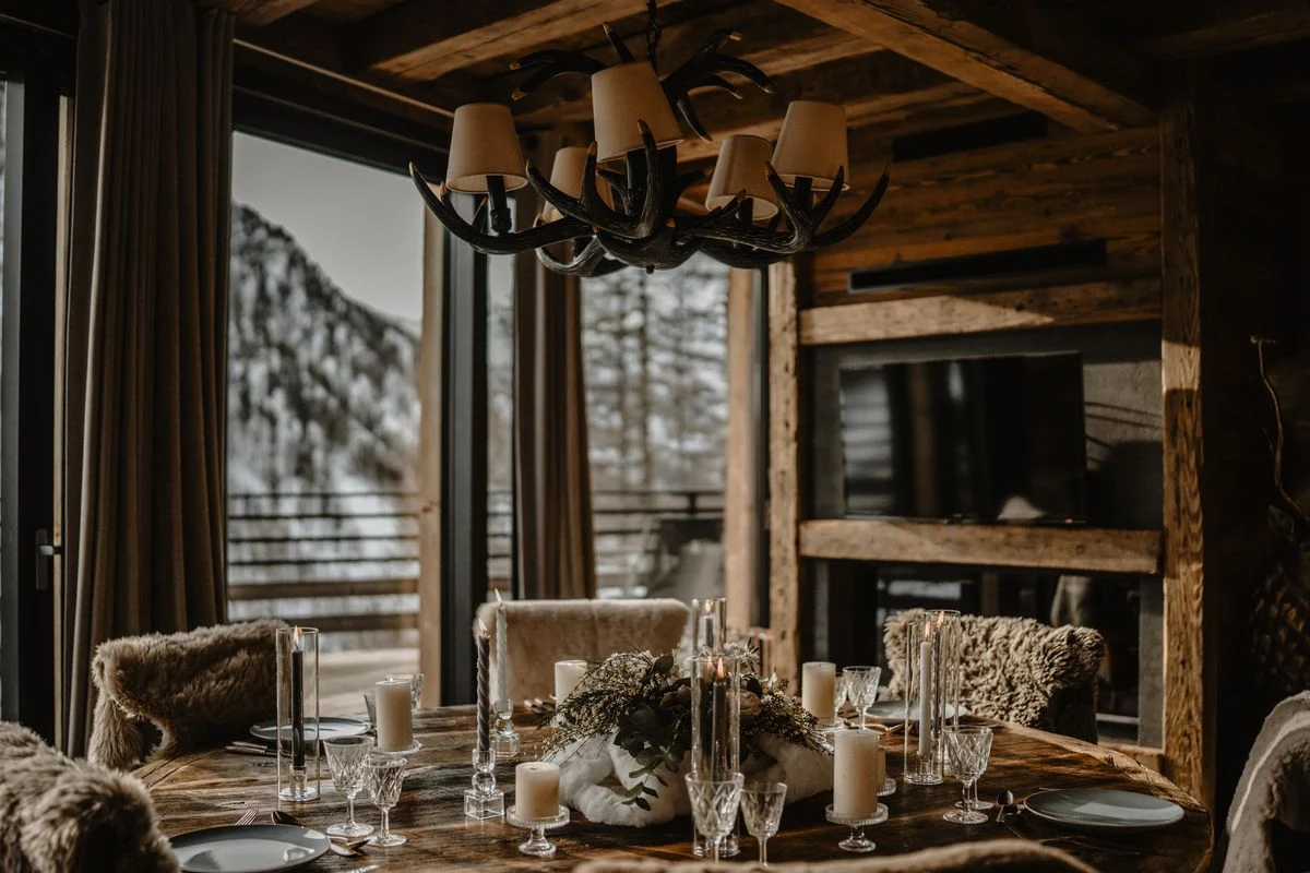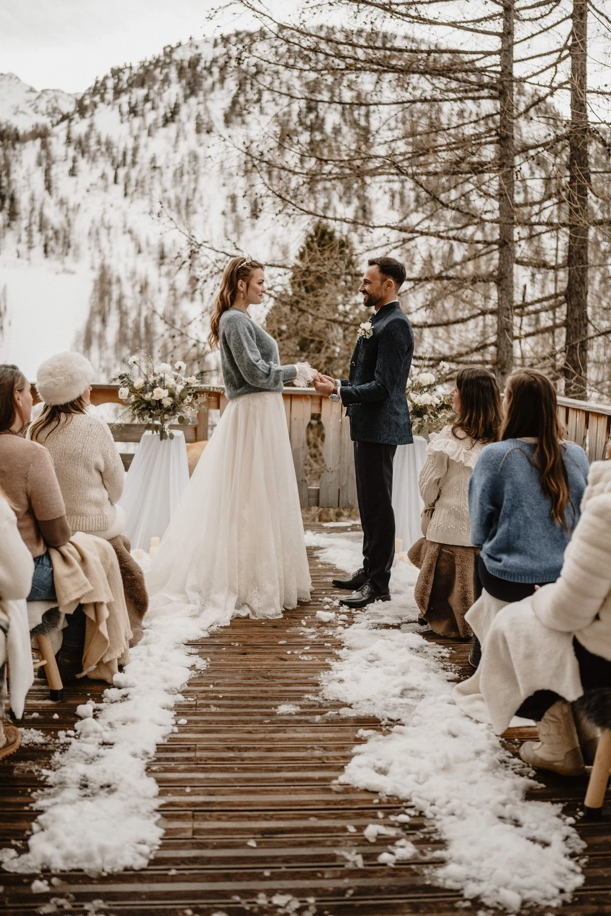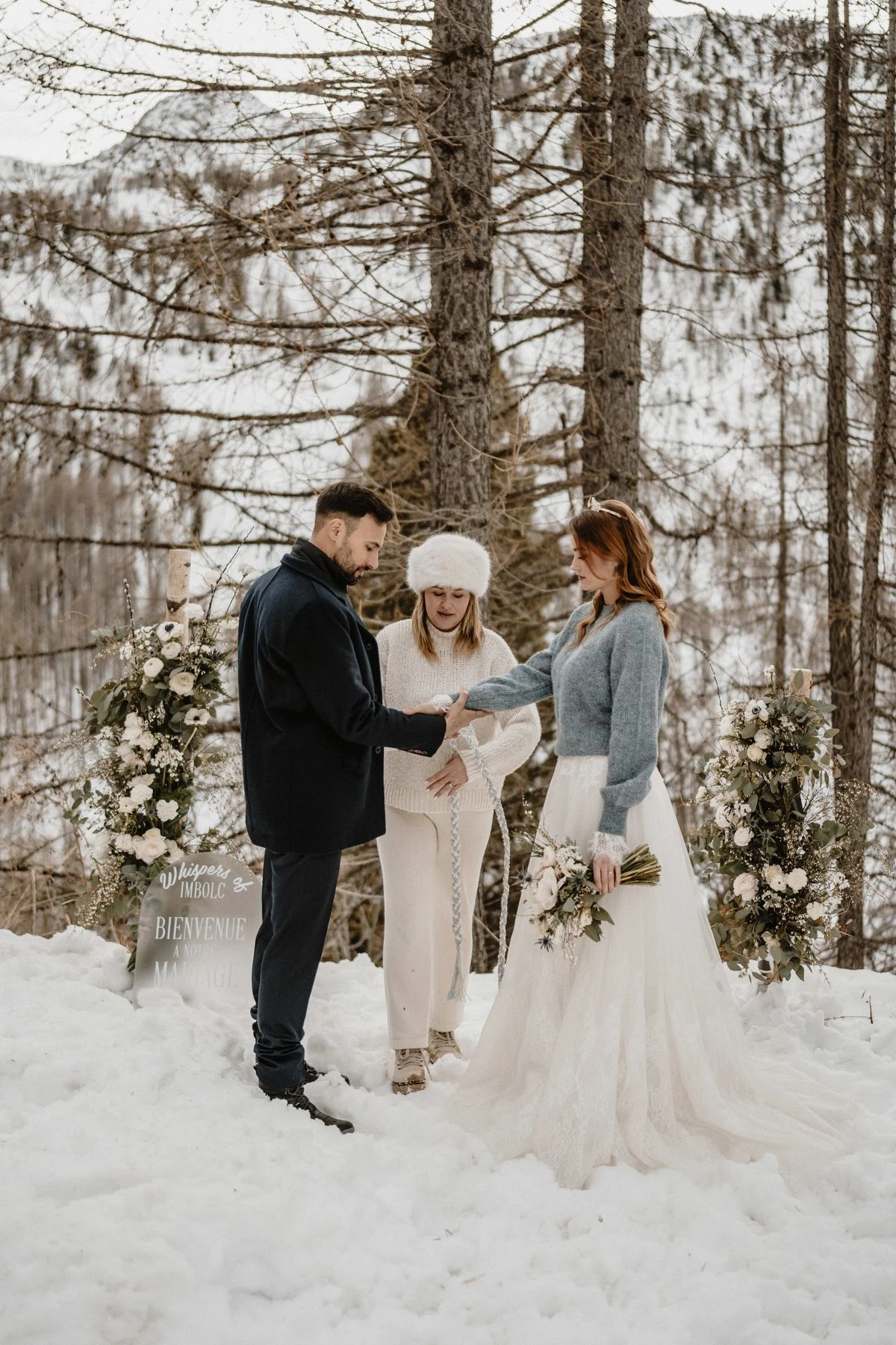 “Le lendemain, la cérémonie laïque se déroule au cœur de la neige, ponctuée par le rituel du handfasting, geste ancestral symbolisant l’engagement au-delà des mots. Le dîner qui suit confirme l’esthétique sensorielle du shooting, à travers une table chaleureuse, une palette de saison et une atmosphère intime et chaleureuse. Enfin, le spa du chalet permet aux mariés de clore ce week-end en douceur, dans la continuité du soin porté à leur union.