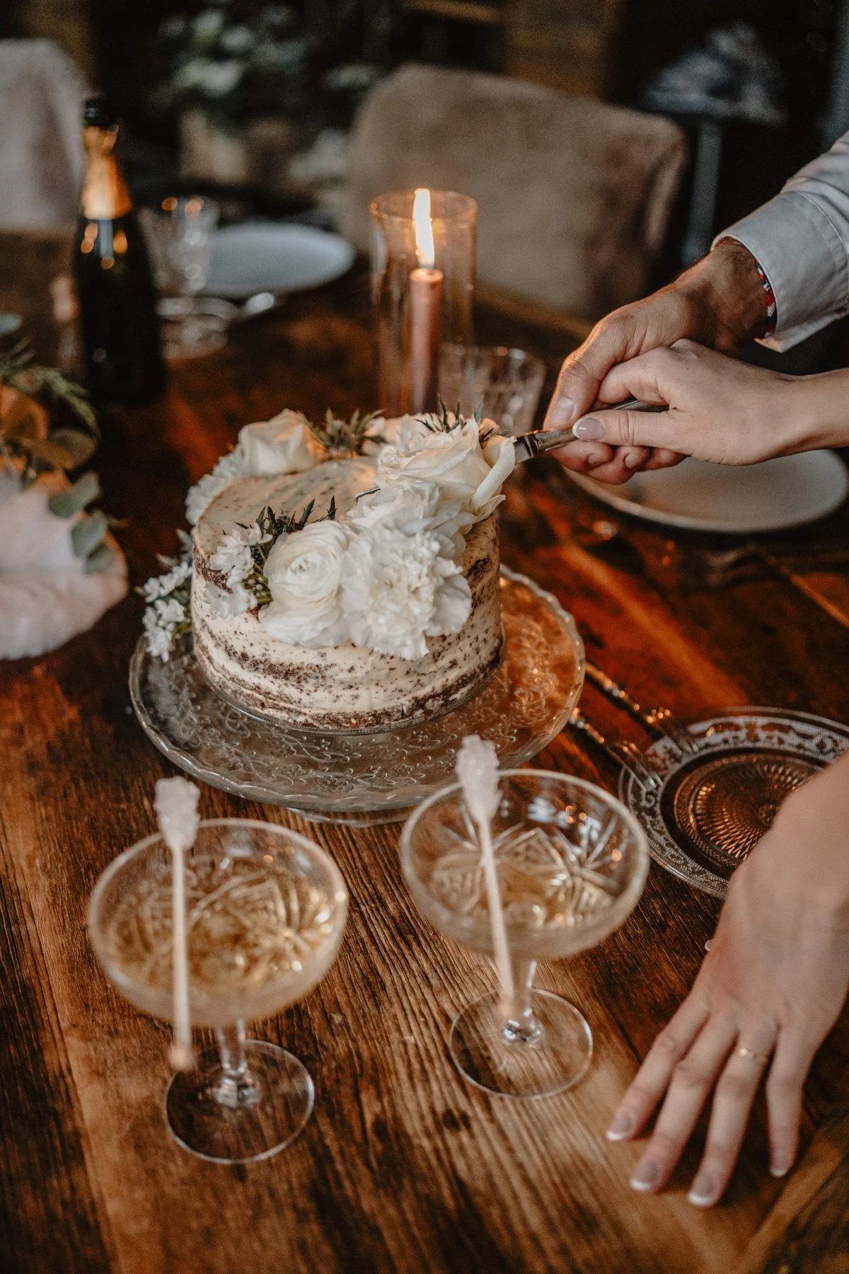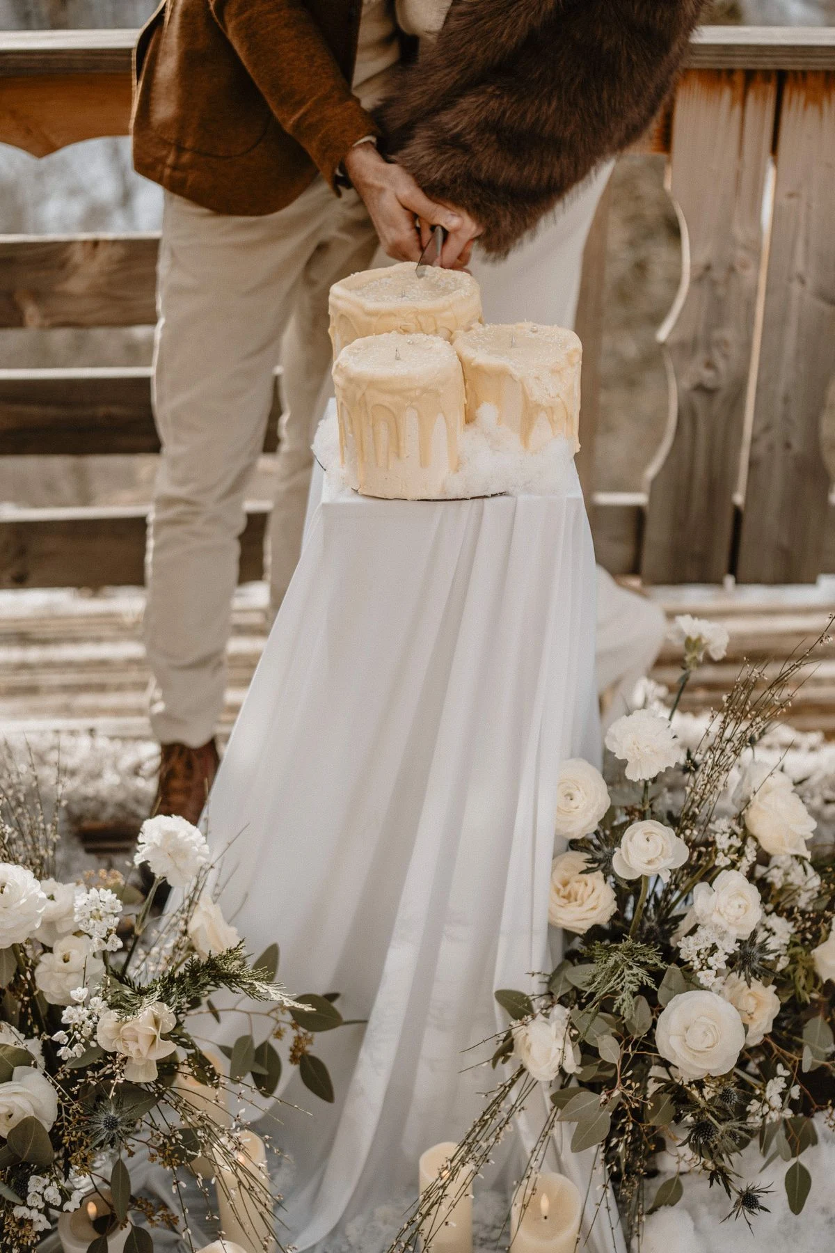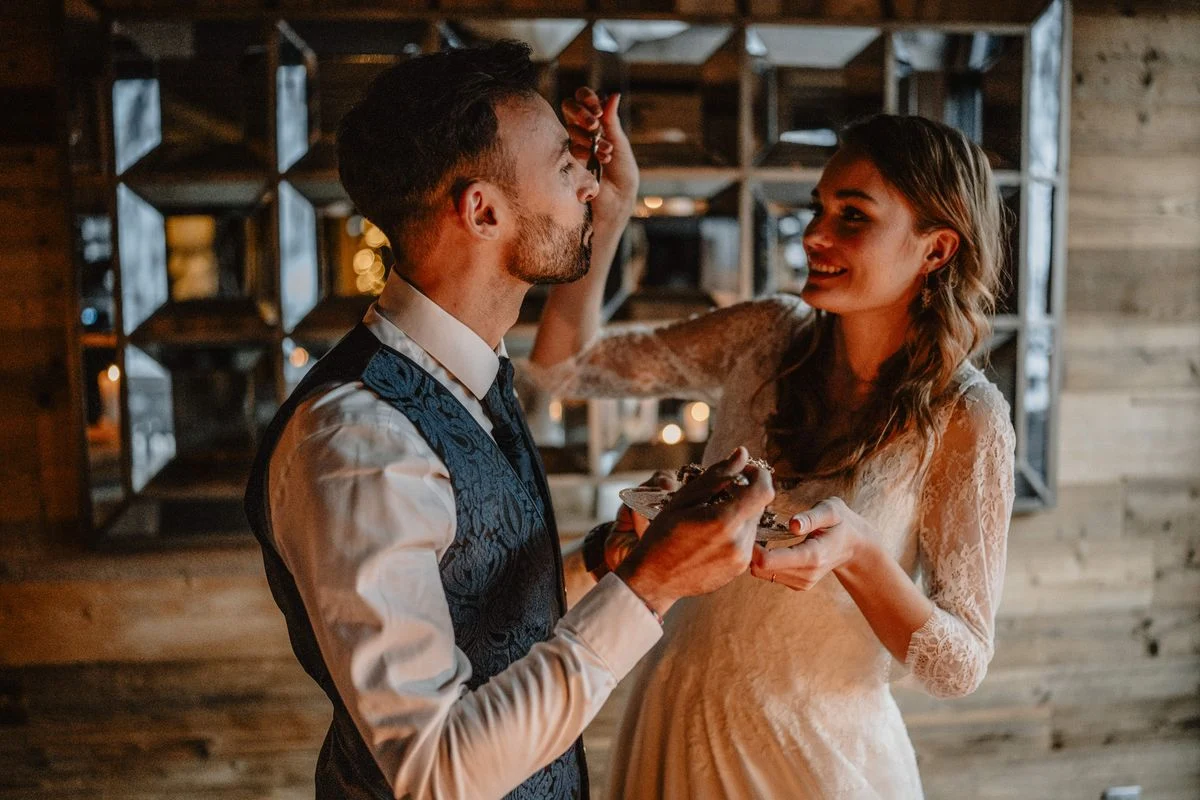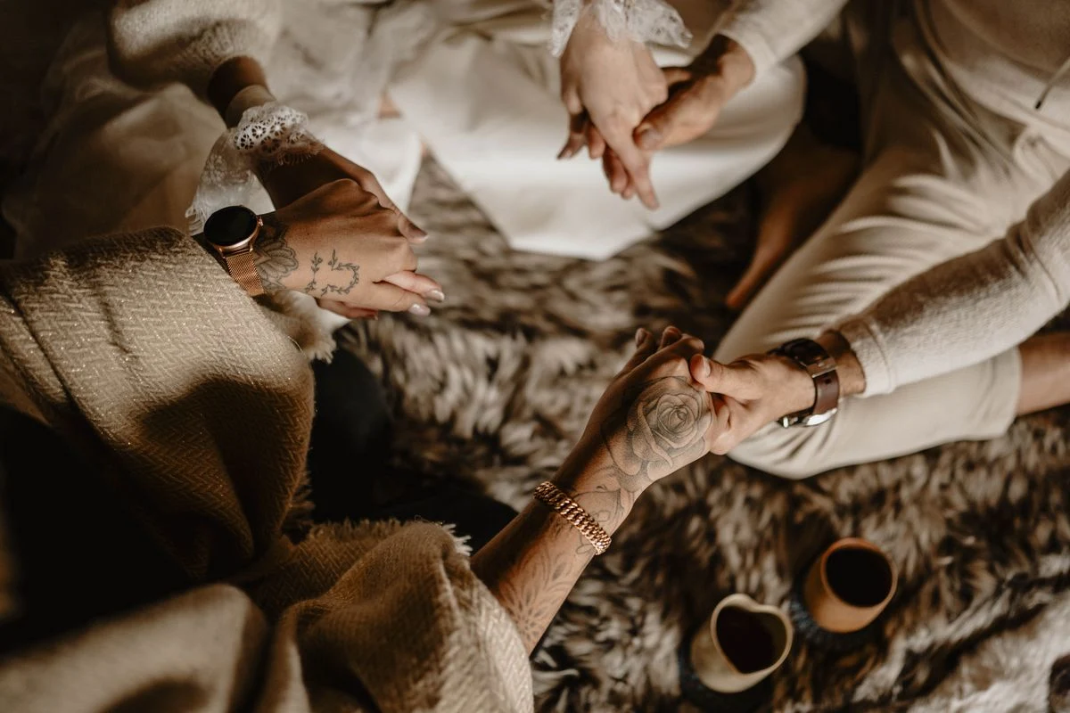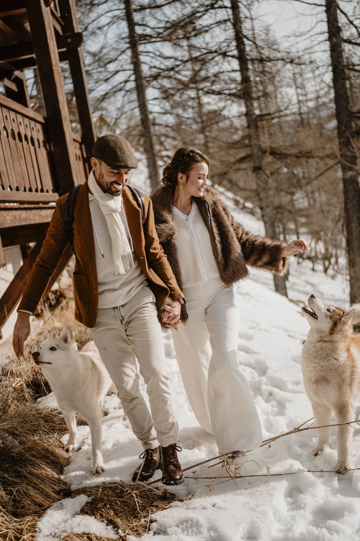 “Le lendemain, la cérémonie laïque se déroule au cœur de la neige, ponctuée par le rituel du handfasting, geste ancestral symbolisant l’engagement au-delà des mots. Le dîner qui suit confirme l’esthétique sensorielle du shooting, à travers une table chaleureuse, une palette de saison et une atmosphère intime et chaleureuse. Enfin, le spa du chalet permet aux mariés de clore ce week-end en douceur, dans la continuité du soin porté à leur union.