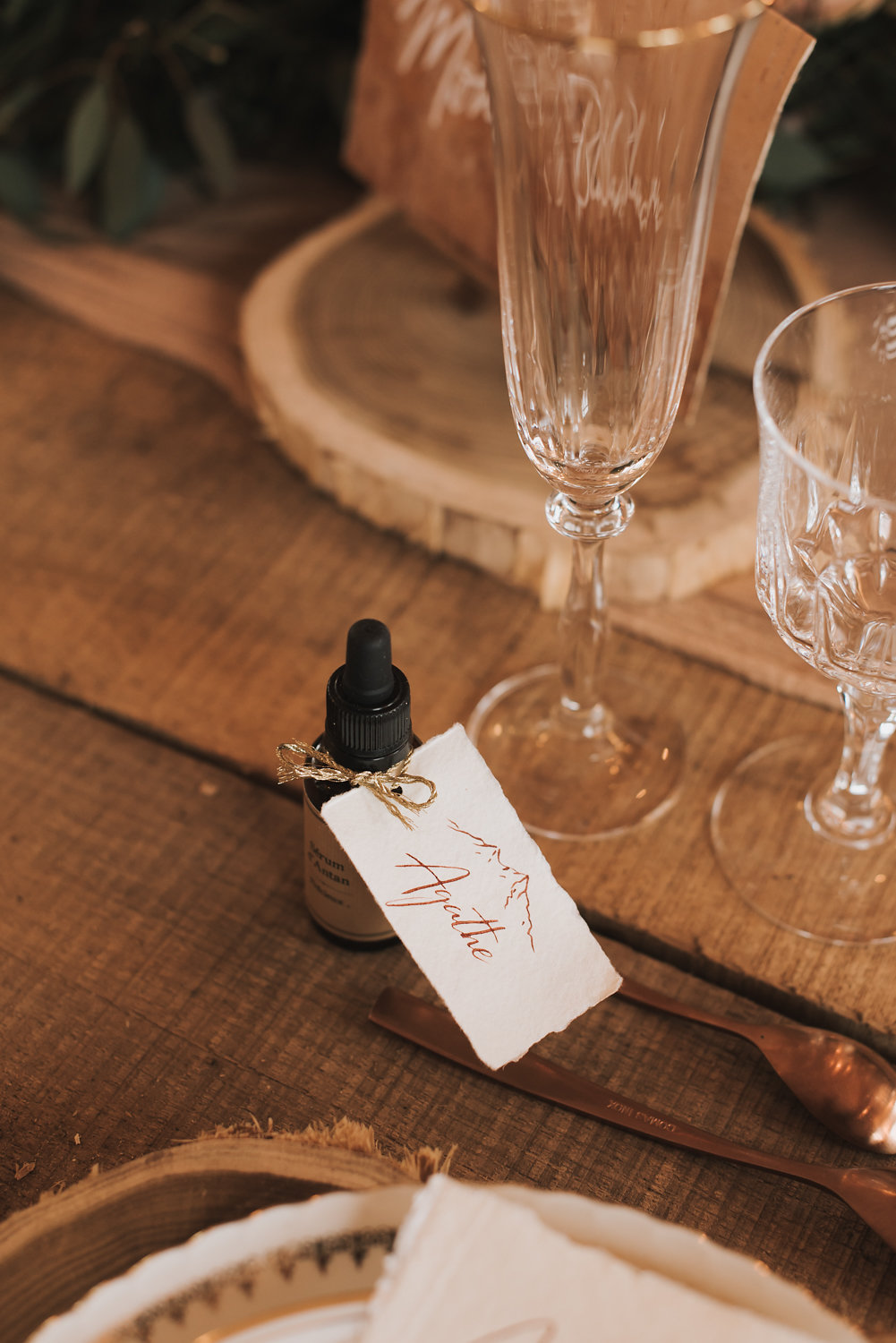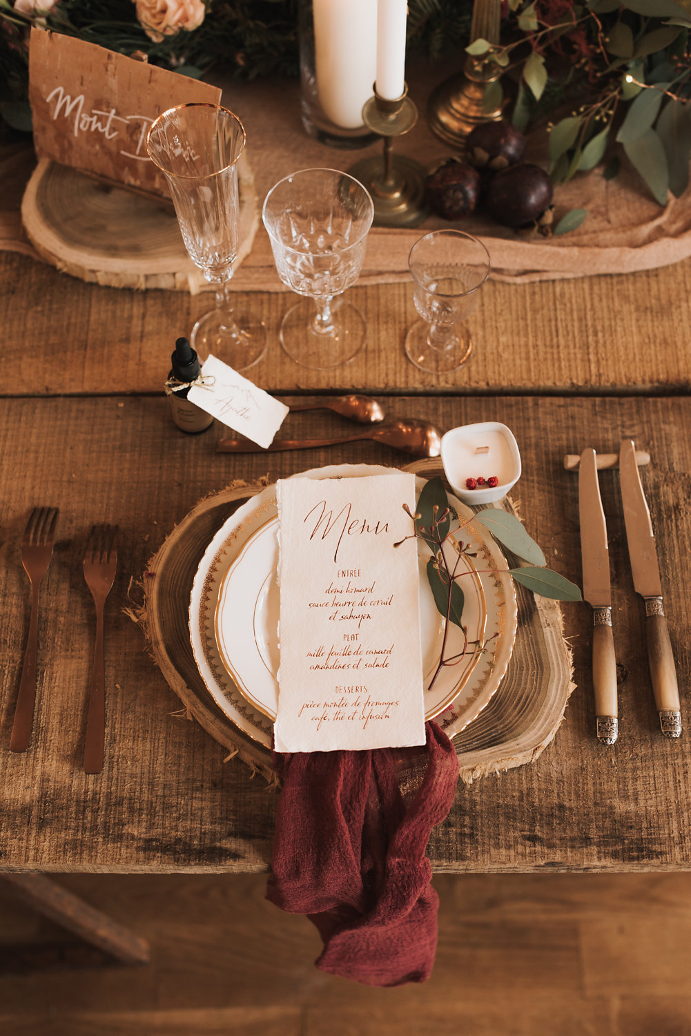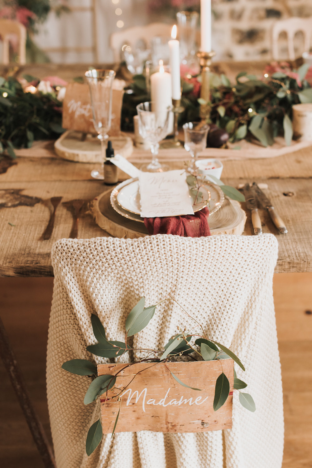 _« Sur les photos de Winter Wedding Purple, j’ai voulu faire ressortir le côté naturel des éléments, c’est-à-dire le bois, le textile et les éléments de la nature. J’ai sélectionné des prestataires qui utilisaient des matières premières naturelles comme par exemple Organic Coccon ou Le temps file qui teint les textiles avec des extraits de plantes.