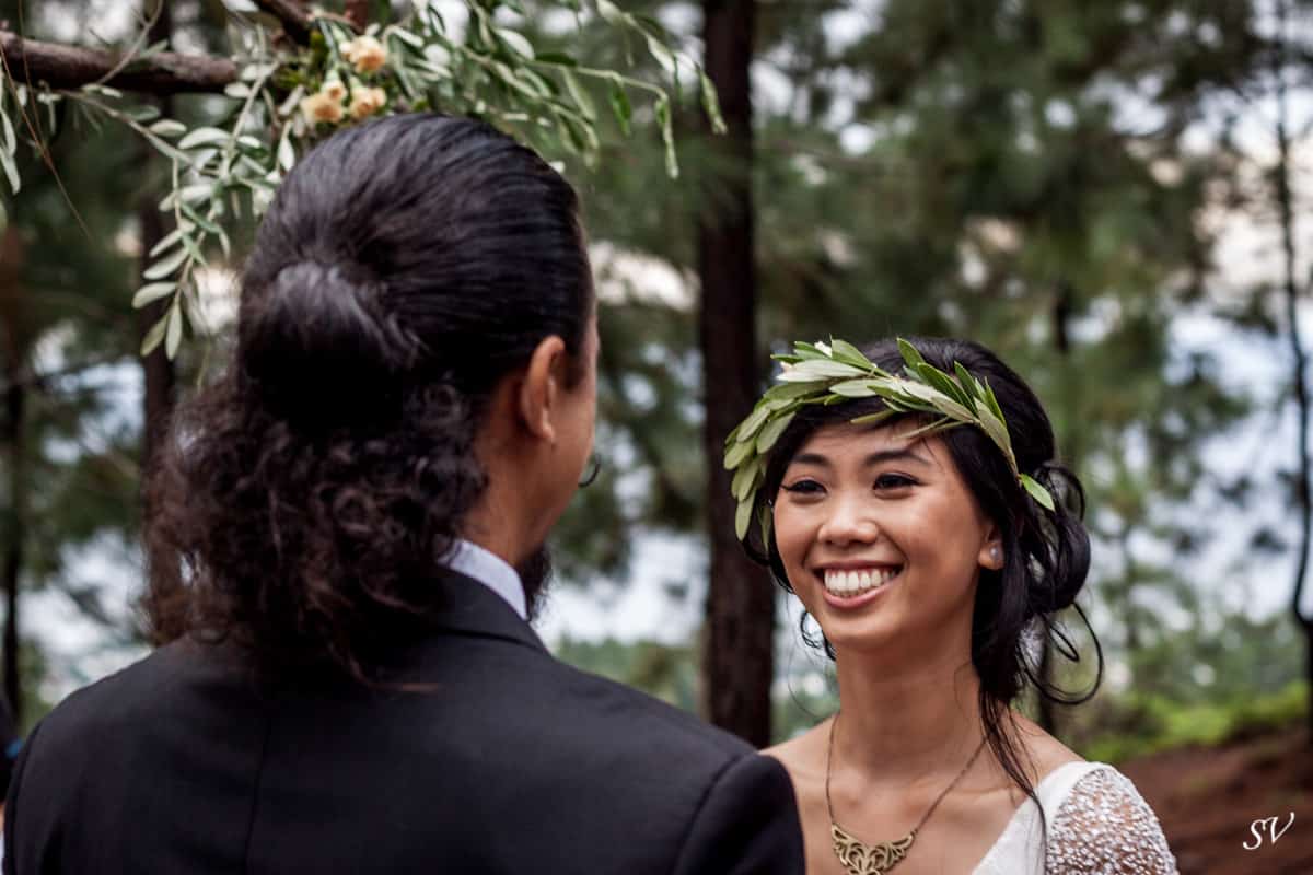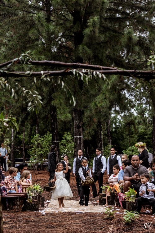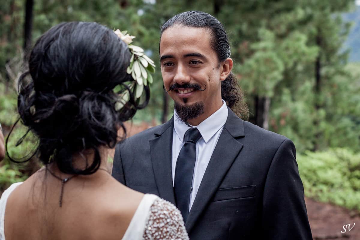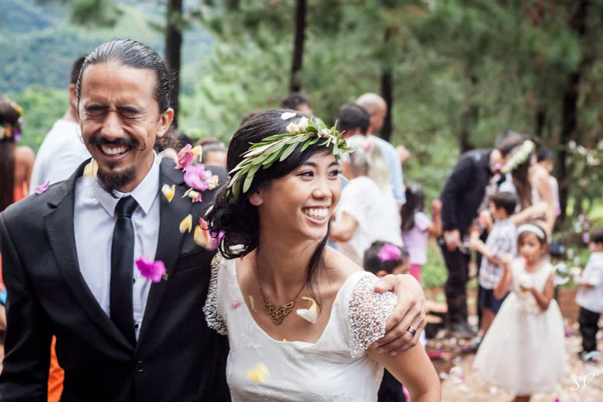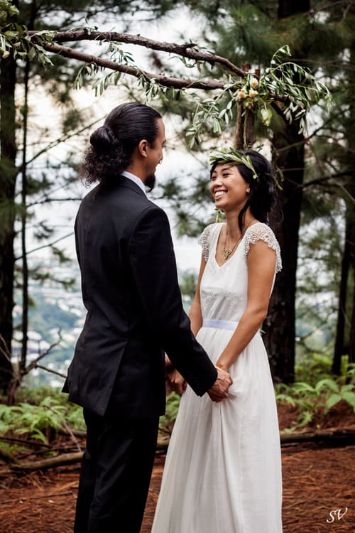 « Mon plus beau souvenir aura été de voir son large sourire dans la montagne! Elle était heureuse et c’était juste magique. Et malgré la pluie, nous avons passé un mariage génial. Le matin de notre mariage, le temps était vraiment maussade! Nous étions en alerte orange pour des pluies torrentielles et j’étais à deux doigts de tout annuler et de faire la cérémonie religieuse dans un endroit couvert mais du coup bien moins romantique que dans les bois! Finalement nous avons gardé le plan A. Nous sommes arrivé armé de parapluies et je me souviens que Joanna gardait le sourire et ça m’a vraiment soutenu. La pluie s’est finalement calmée juste au moment des photos et la cérémonie religieuse! Et je remercie vraiment Dieu pour ce clin d’œil ! Le temps était finalement superbe, c’était un peu boueux mais ce n’est pas grave! L’essentiel c’est que nous avons passé un moment de convivialité inoubliable et que les invités partageaient notre bonheur. »