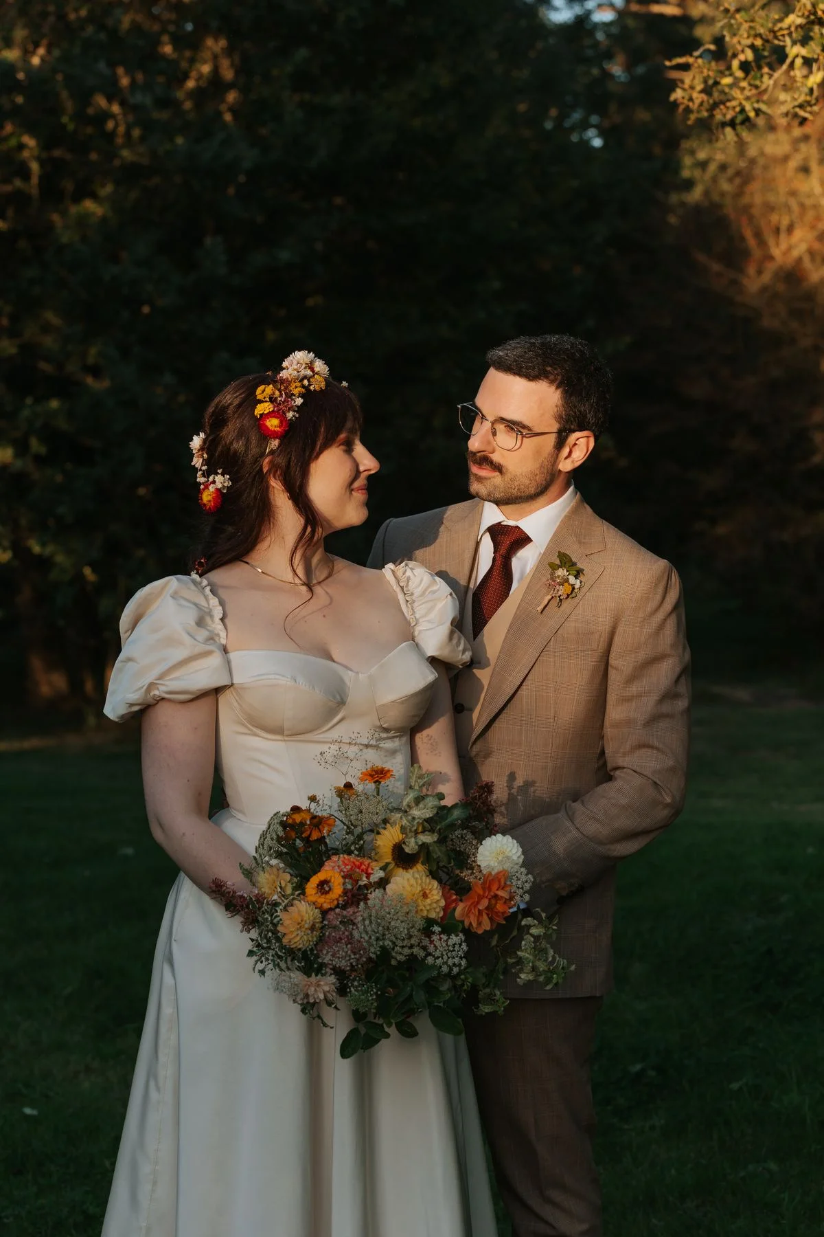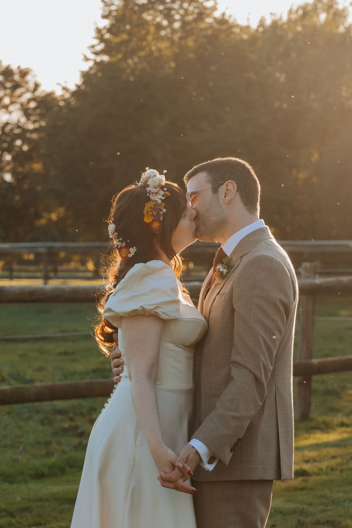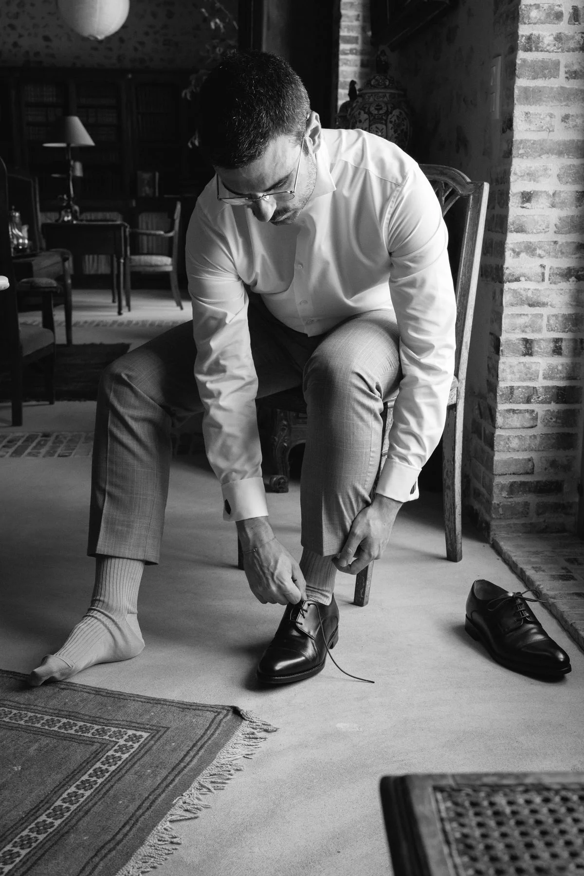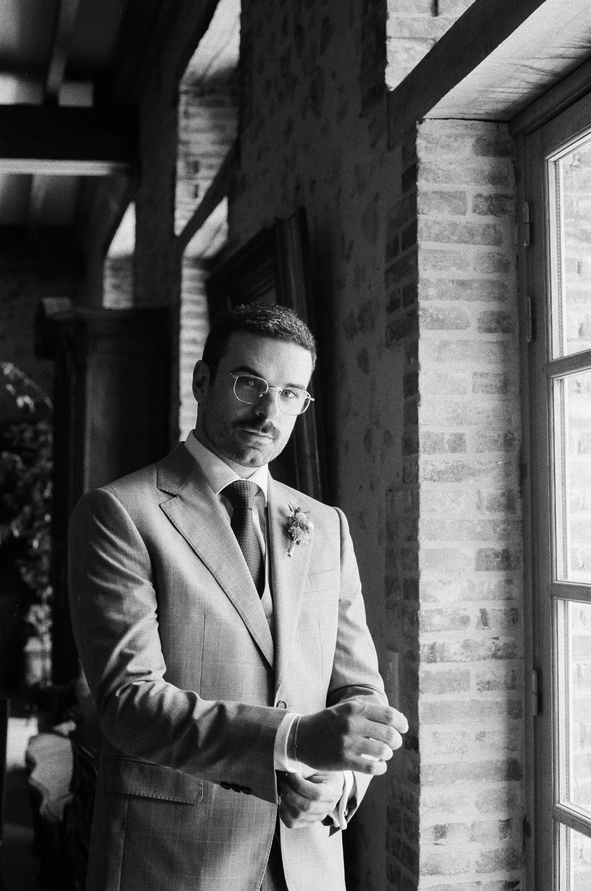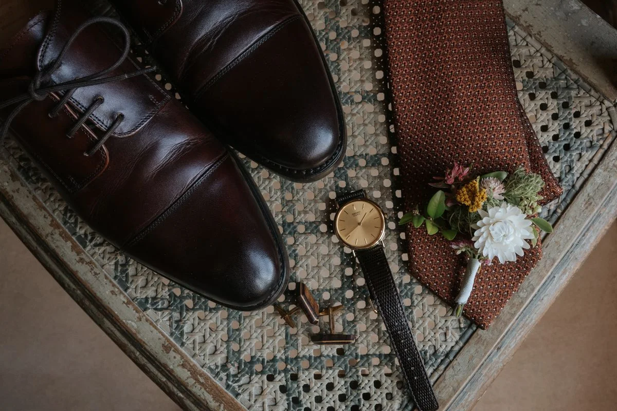 Maxime : J’ai choisi un costume du tailleur Artling, basé dans le VIe arrondissement de Paris. Pour mon premier costume sur mesure, je cherchais une atmosphère « à l’anglaise » et j’ai été épaté par leur accueil et la qualité de leurs produits. Le choix des tissus et du costume a duré longtemps car j’étais assez indécis malgré quelques grandes lignes : Pas de bleu, gris ou noir (que je trouvais trop simple ou triste) ni de vert émeraude ou de terracotta (que je trouve trop ancré dans les quelque dernières années) ! A partir de là, bon courage ! Je savais que Juliette apprécierait si mon costume était coloré ou avec des motifs. J’ai donc choisi un superbe tissu beige Holland & Sherry avec motif « Prince de Galles » ainsi qu’un tissu beige uni pour le gilet afin de ne pas surcharger l’ensemble. Finalement, j’ai choisi un tombé anglais qui me semblait plus approprié à l’esprit du mariage que la « sprezzatura » italienne.