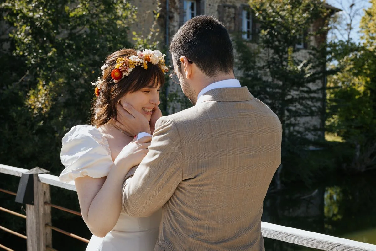 Juliette : J’ai choisi une robe de Christina Sfez, créatrice basée à Marseille et à San Francisco. C’était important pour moi de pouvoir travailler avec une artisan directement. Et savoir que la robe était fabriquée en France était un véritable plus. Pourtant, j’ai eu beaucoup de mal à trouver la bonne robe qui alliait le style, le budget et la sensation d’être faite pour moi. Beaucoup de choses me plaisaient sur le papier, mais dès que j’essayais j’avais vite l’impression de disparaitre sous les dentelles. Au final, j’avais cette même envie que pour le reste du mariage de quelque chose de simple avec une forme de sophistication. Ce modèle Freya s’est révélé parfait pour mettre en valeur la coiffure et les accessoires que j’avais choisis et faire de moi l’être de fleurs que j’imaginais !