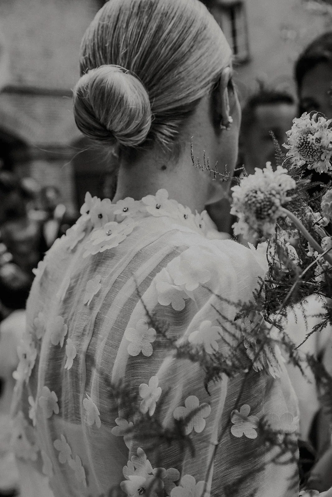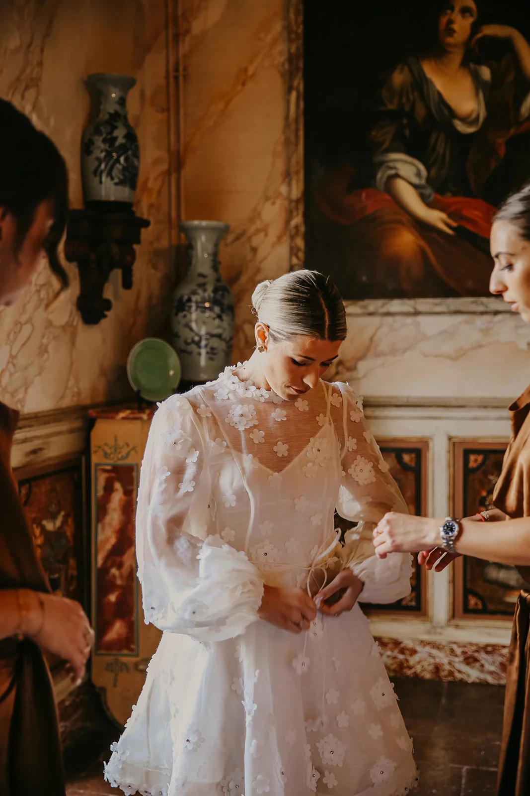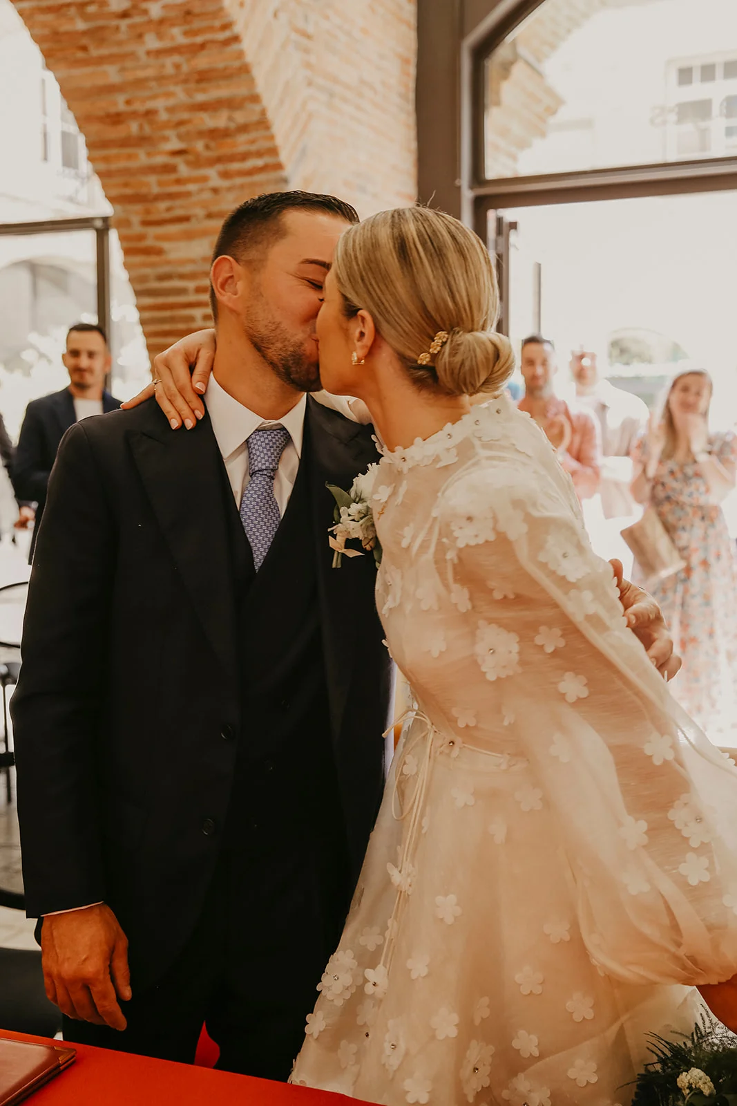 La robe de la mairie appartenait à une collection de l’année précédente. Je l’avais repérée bien avant le mariage et elle s’est immédiatement imposée comme une évidence. Lorsqu’elle n’était plus disponible, j’ai contacté de nombreuses boutiques Zimmermann à travers l’Europe. Contre toute attente, elle est finalement revenue en stock, comme si elle m’était destinée.