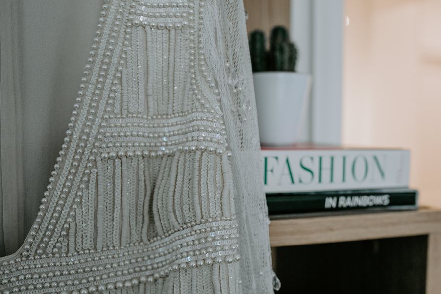 JB adore Paul Smith et avait déjà trouvé un costume pour un autre mariage chez eux. Léa ne voulait pas de robe de mariée “traditionnelle” et ne se sentait pas tout à fait à l’aise dans celles qu’elle avait essayées même dans les gammes “mariage civil.” Finalement, elle a trouvé cette marque (Elisabetta Franchi) sur Instagram et a adoré ce qu’elle faisait avec les perles et les paillettes. Elle voulait quelque chose qui scintille pour la soirée et finalement a trouvé sa robe de mairie au même endroit !