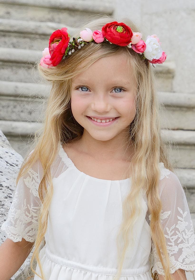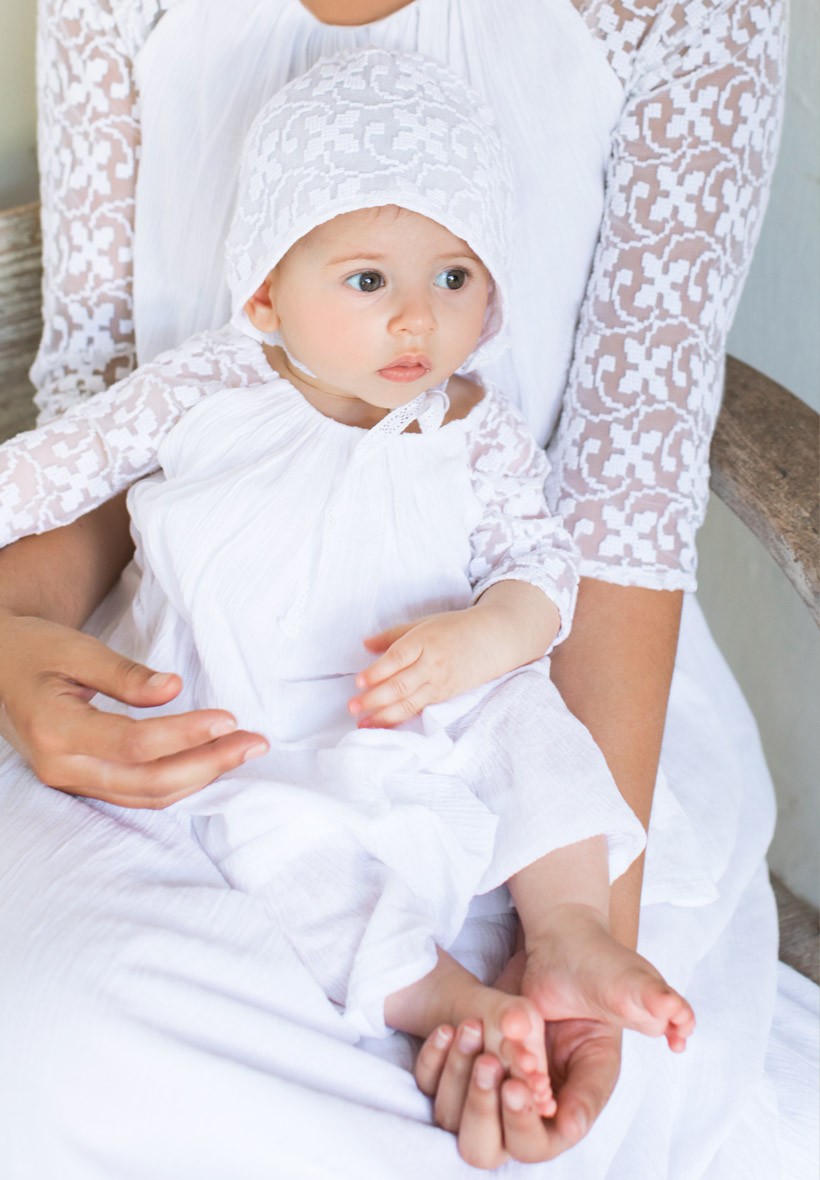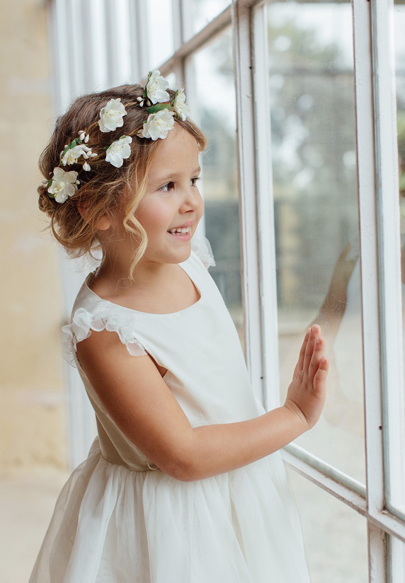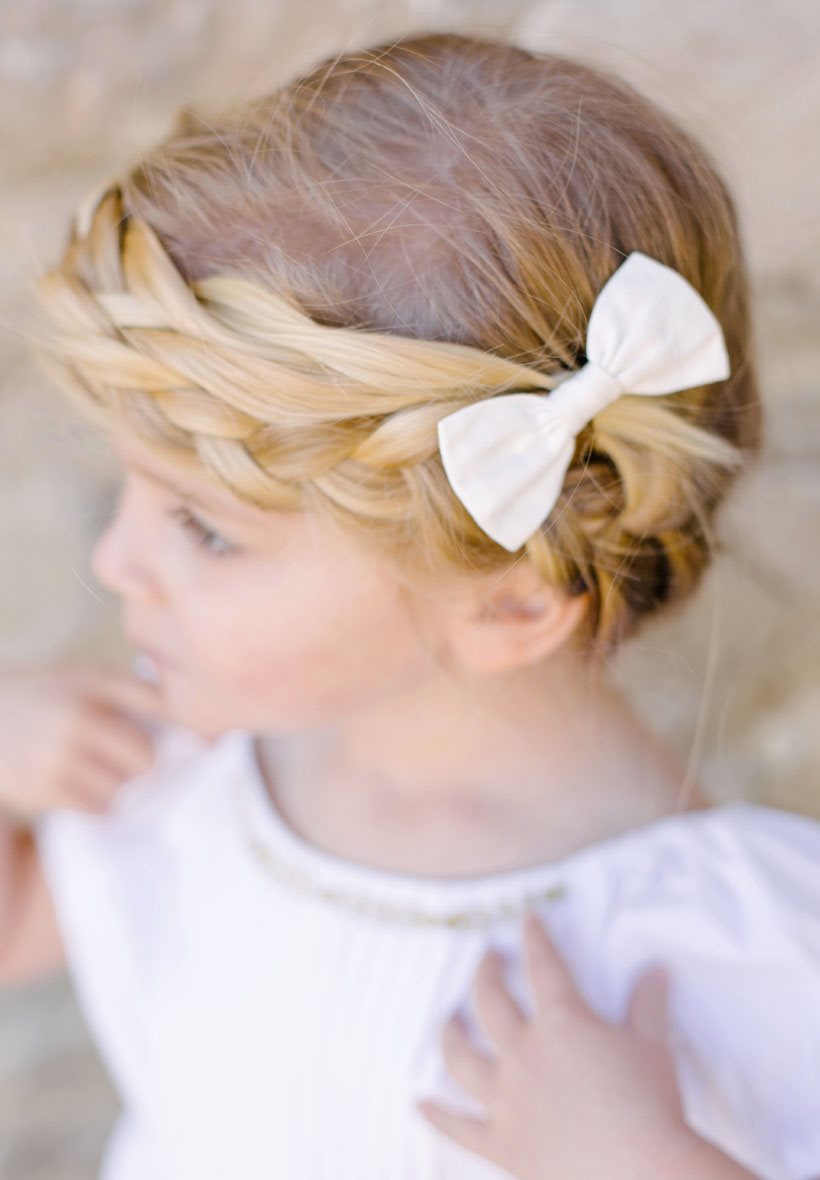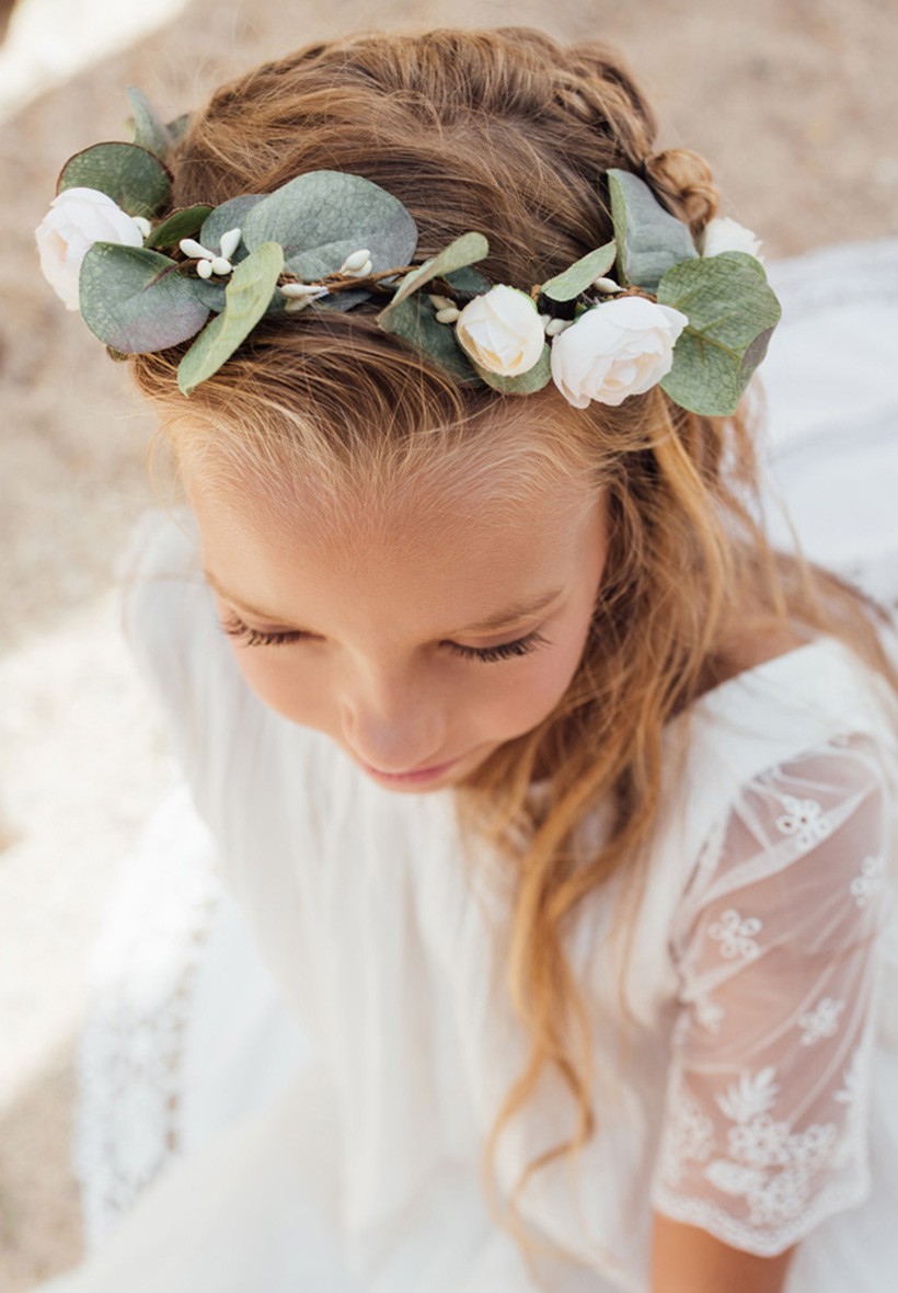 Commençons par la tête. Vous avez plusieurs options : une pince crocodile ornée d’un noeud en satin de coton, des béguins (on ne parle pas d’amour ici mais de bonnets) brodés en coton et des couronnes de fleurs en tissu et baies décoratives. Vous pouvez aussi penser à des boucles d’oreille si possible.