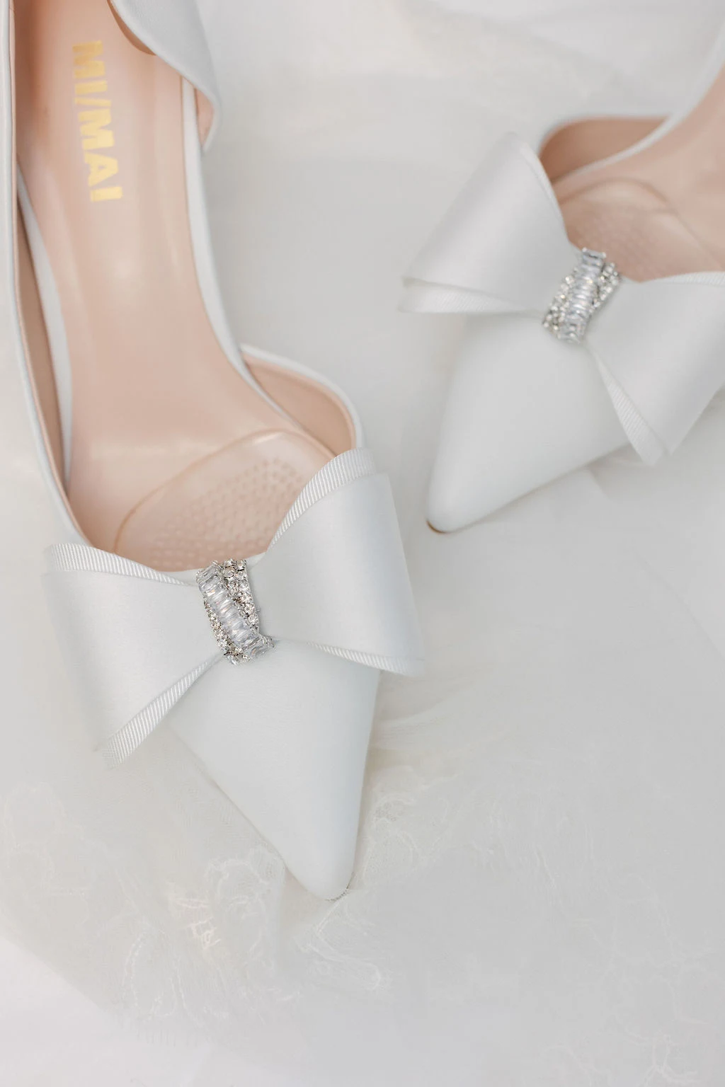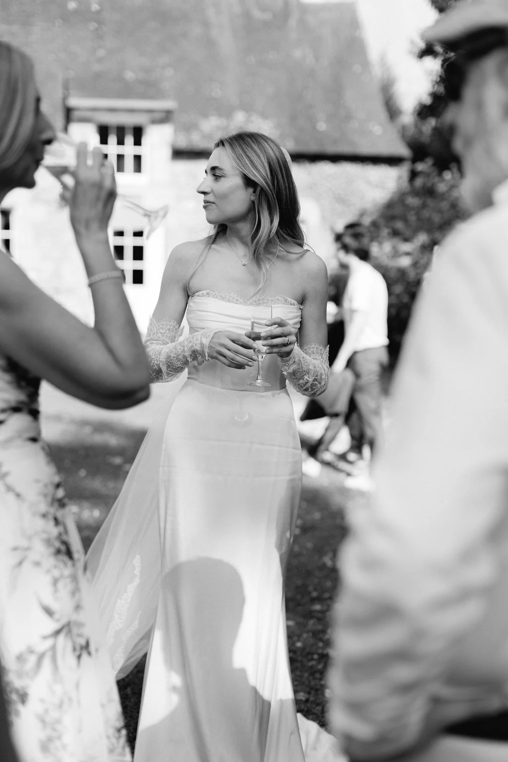 J’avais avant tout envie de belles matières (satin, dentelle fine de Calais), d’un savoir-faire haute couture et d’un vrai feeling avec la créatrice. Après quelques essayages, j’ai compris que si je voulais la robe de mes rêves, il fallait la faire créer sur mesure.