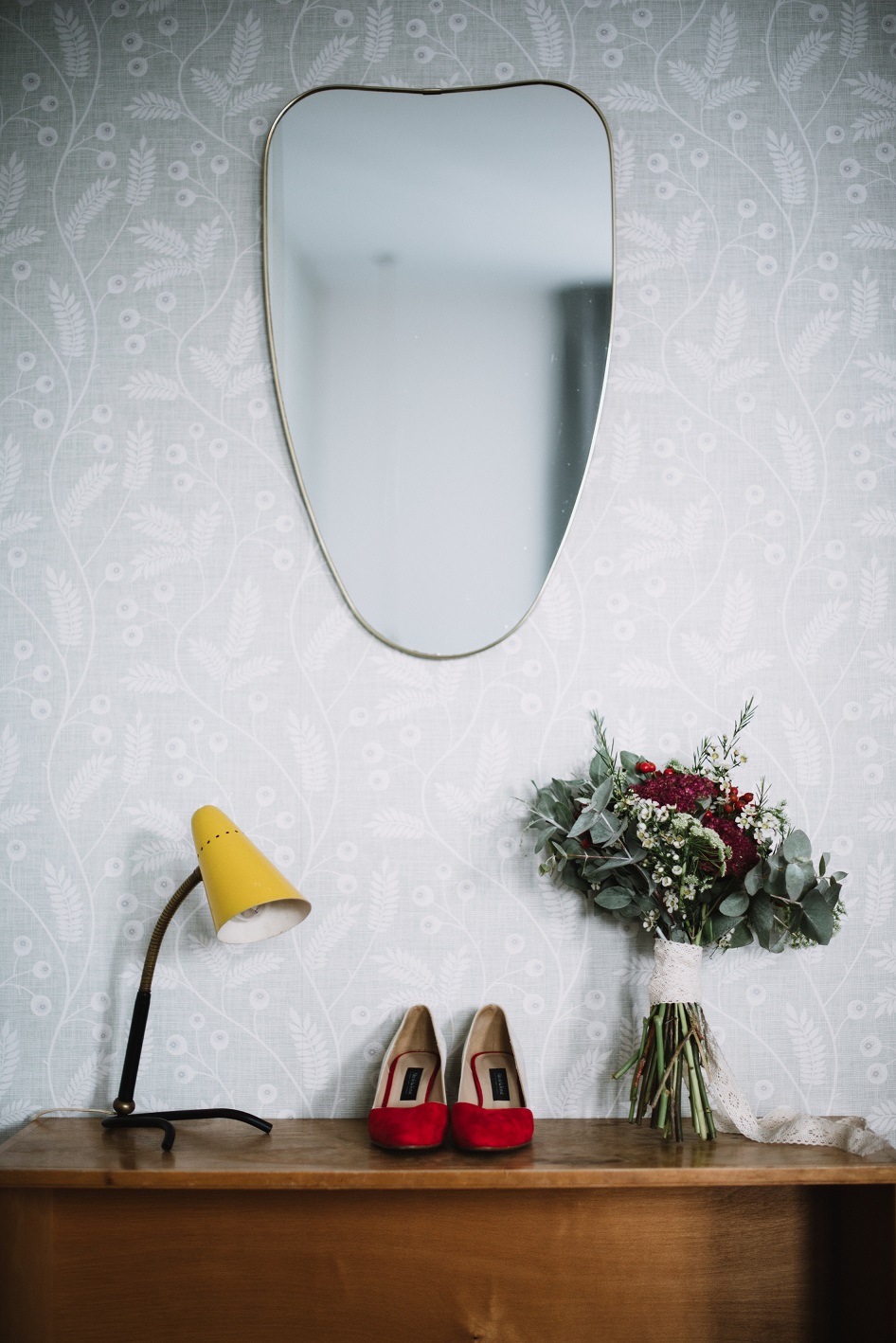 Il était naturel que nos tenues soient en accord avec notre thème. Pour évoluer dans une atmosphère bucolique et chaleureuse, il nous fallait des tenues souples, fluides, confortables mais faites avec de belles matières et de jolis détails. L’autre élément du thème était le côté « Rétro », et sur cet aspect, j’avais trouvé chez Sidonie Floret la créatrice parfaite. La robe que j’ai choisie était simple mais très féminine, avec un tombé très juste et une magnifique dentelle. Pour accentuer le style rétro, je l’ai « accessoirisée » avec une couronne de wax pour la coiffure et d’escarpins en velours rouge et cuir beige doré. Charly qui n’a jamais aimé les costumes avait finalement trouvé chez Samson la liberté de « créer » un costume parfaitement à son image. Des belles couleurs, des matières à assembler, des coupes variées et modernes. Au niveau accessoires, c’était également avec beaucoup de plaisir qu’il a trouvé un nœud papillon en bois de Chêne avec du tissu Liberty et des boutons de manchettes en bois avec des appareils photos gravés dessus (Charly étant photographe)