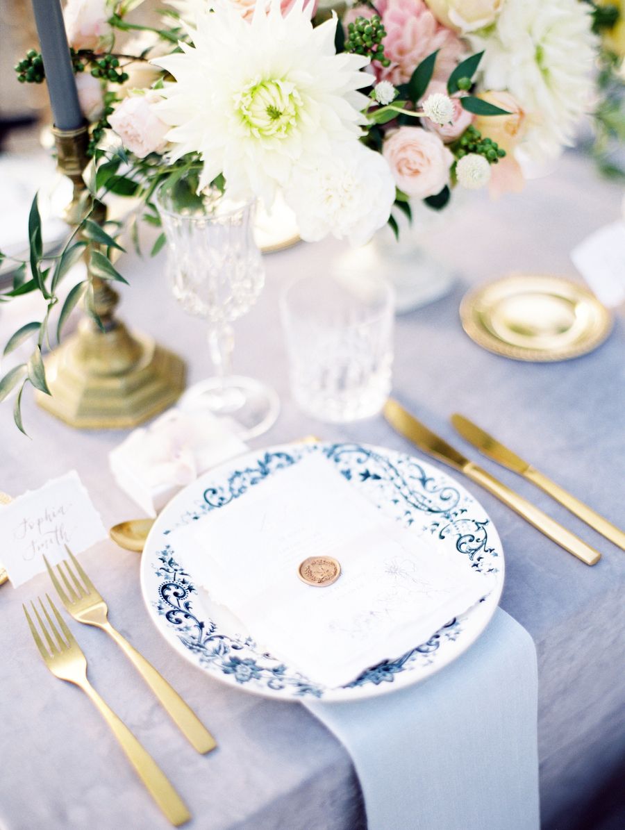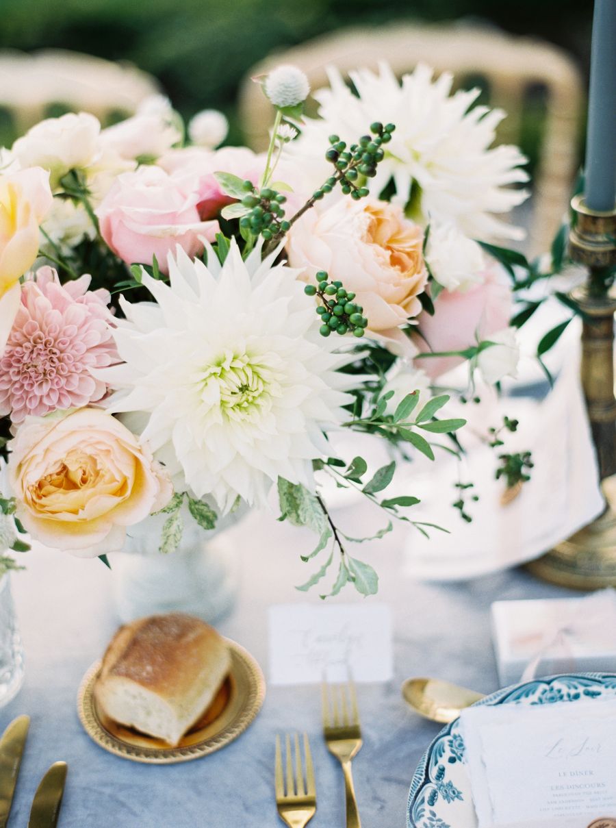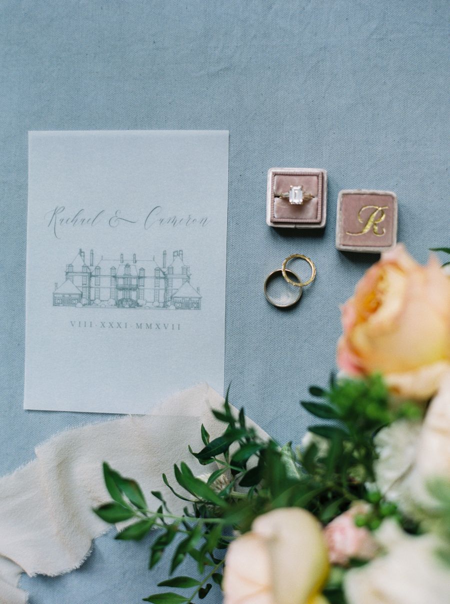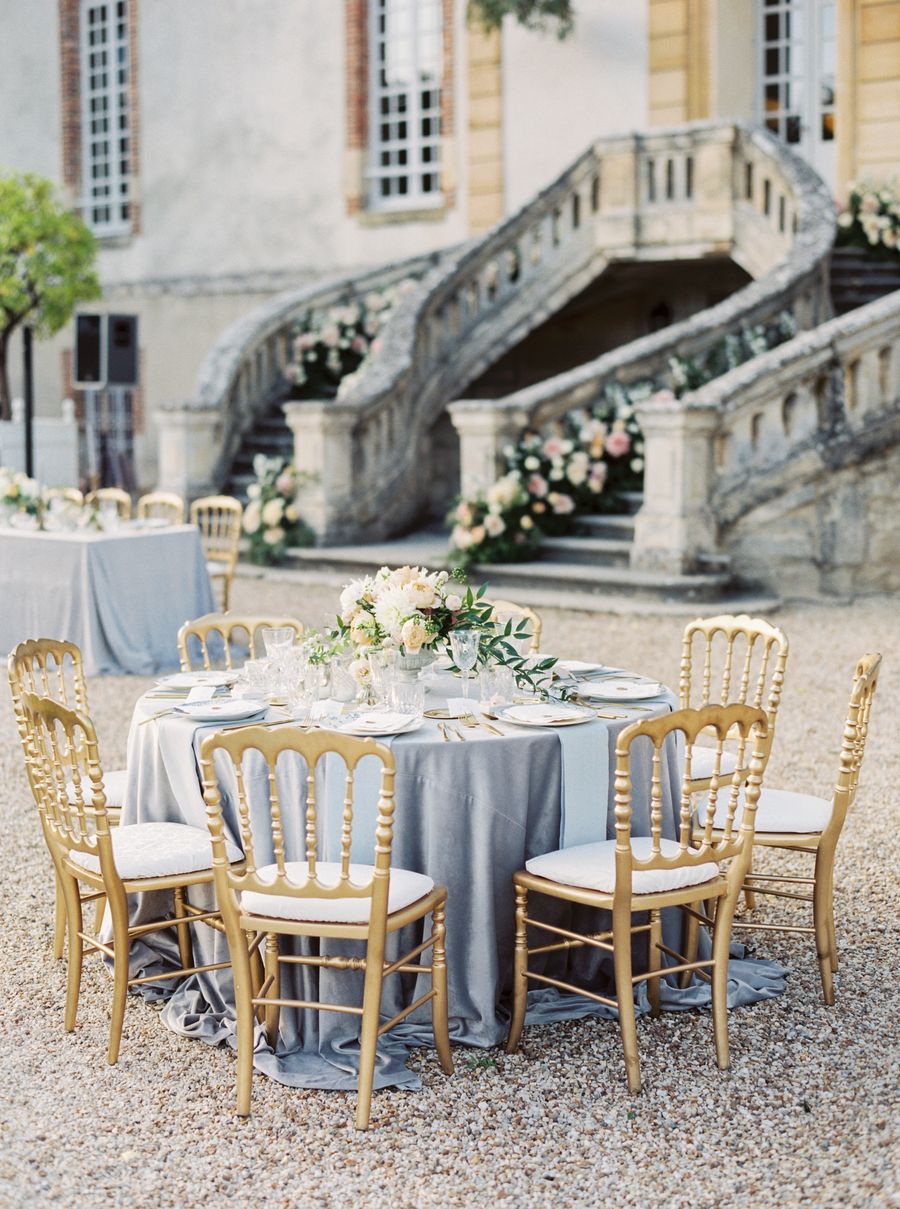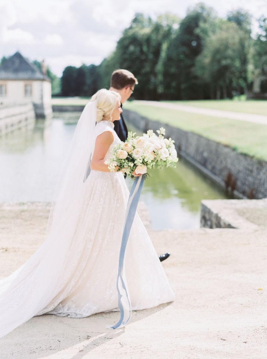 Notre thème était le jardin romantique avec une touche de style traditionnel français et de glamour hollywoodien de l’époque. Le cadre, le château de Bourron, reflétait parfaitement le côté français que nous recherchions avec une magnifique cour et des chambres impressionnantes. L’endroit était retiré et magique. Nos couleurs ont été très inspirées du jardin avec du bleu, du rose pâle, du caramel et du rosé pour créer une ambiance intemporellement romantique. Notre mariage était très formel, donc les tenues que nous portions correspondaient à cet esprit. Cameron portait un costume bleu marine et noir avec des boutons de manchettes monogramme et moi je portais une robe GaliaLahav inspirée de Grace Kelly avec un jupon et un voile sur-mesure. Le thème était globalement très fidèle à notre style. Il était traditionnel, formel, intime et romantique.